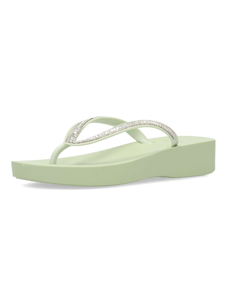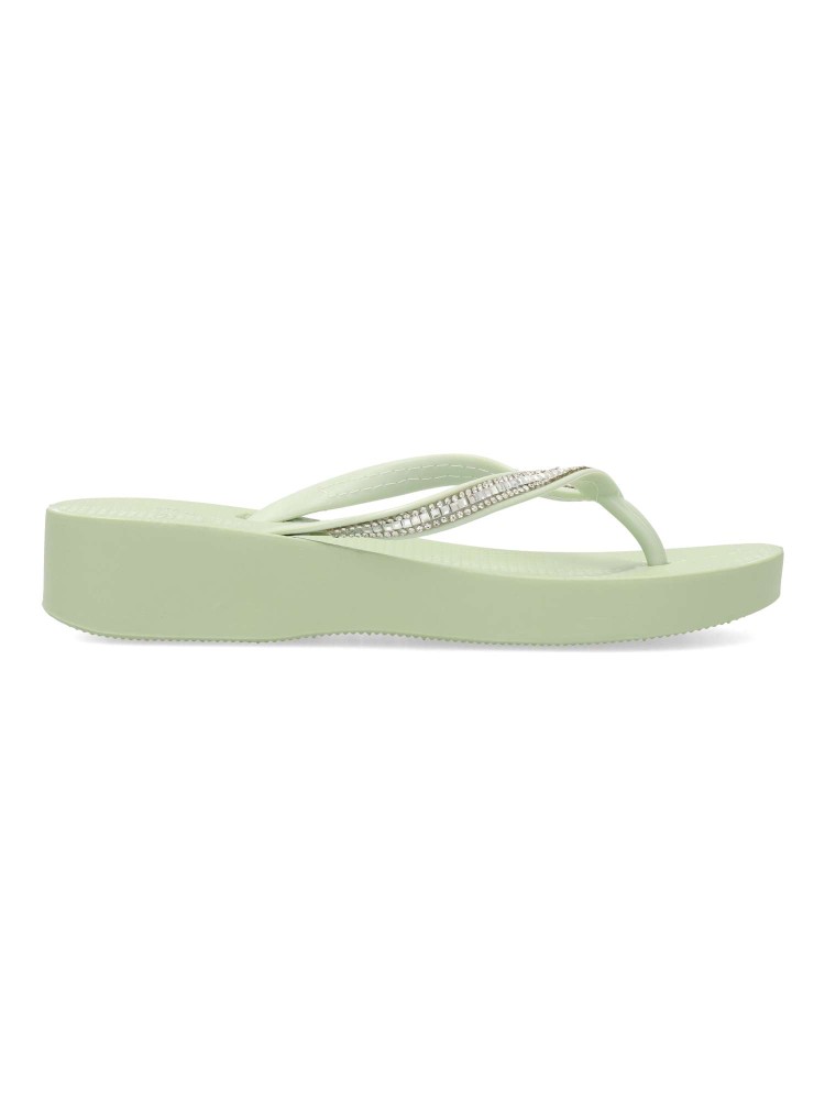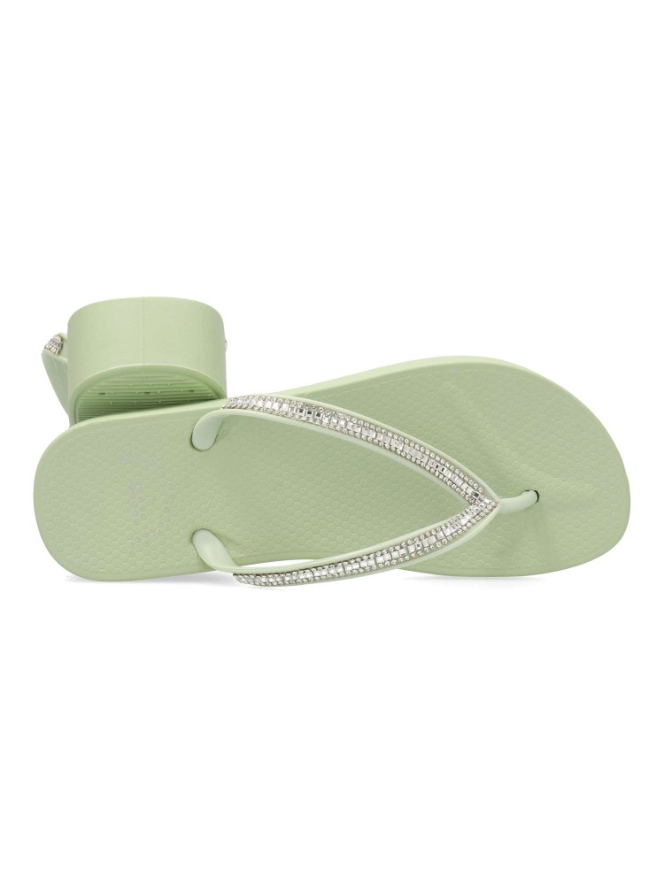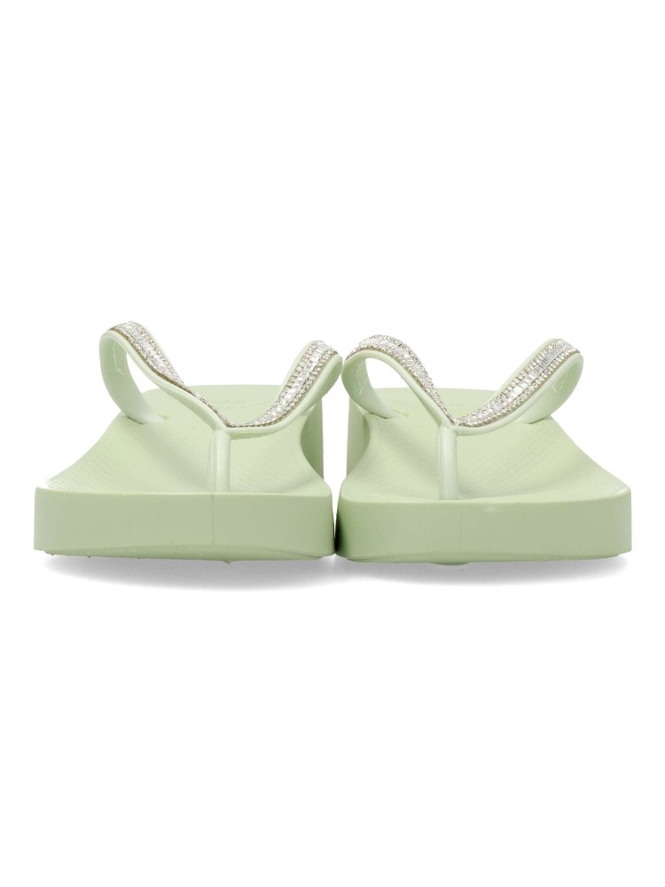 Chancla de playa cómoda para mujer. Chanclas esclava tipo sandalia, ideal para la playa o la piscina, suela de goma, flexible y ligera. Chanclas, versátiles y elegantes. Disponible en color verde. Detalle pedrería de brillo.