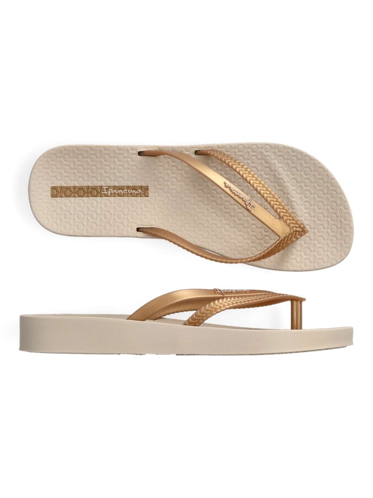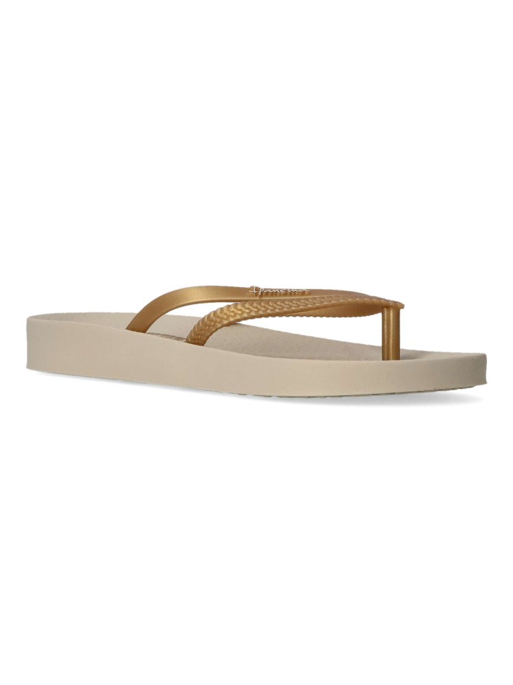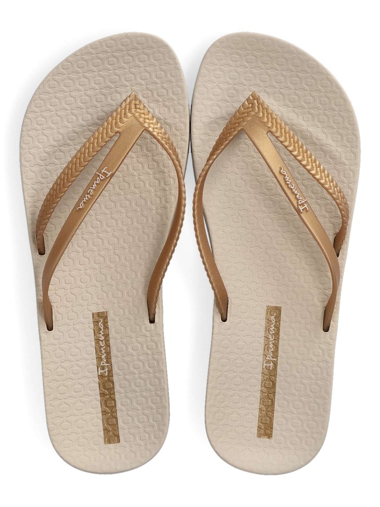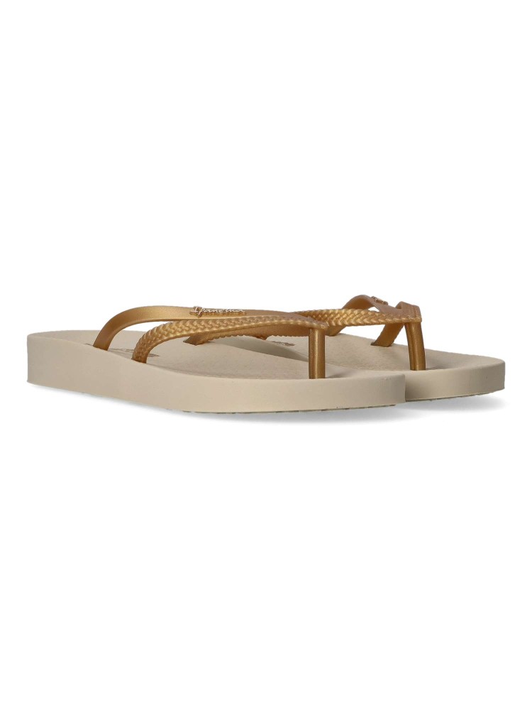 Chancla de playa cómoda para mujer. Chanclas esclava tipo sandalia, ideal para la playa o la piscina, suela de goma anatómica, flexible y ligera. Chanclas brasileñas innovadoras y elegantes. Disponible en color beige-oro. IPANEMA.