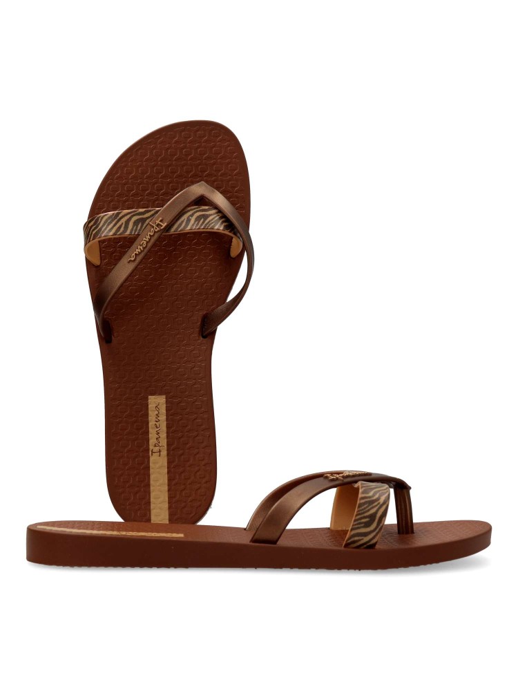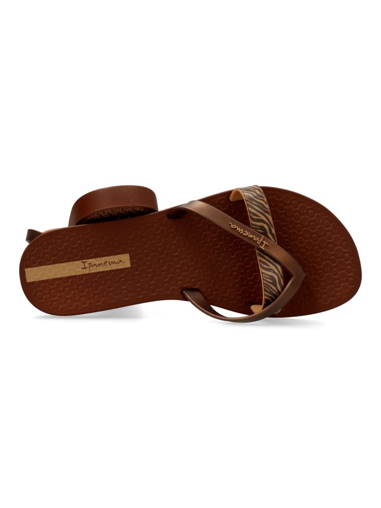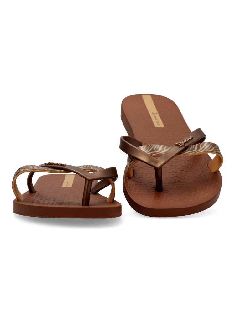 Chancla de playa cómoda para mujer. Chanclas tipo esclava, ideal para la playa o la piscina, suela de goma suave, flexible y ligera. Chanclas brasileñas innovadoras y elegantes. Disponible en color marrón-bronce, con detalle estampado. IPANEMA.