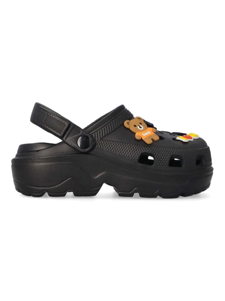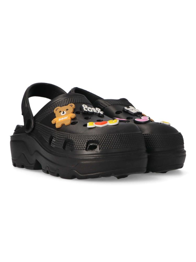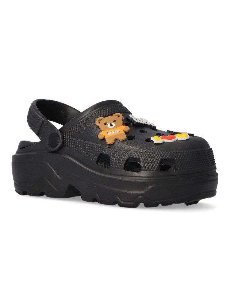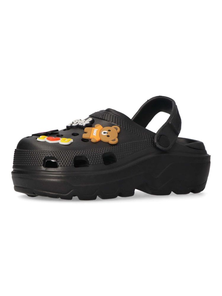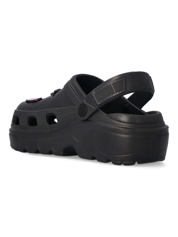 Chancla zueco de goma para mujer. Stickers decorativos. Fabricado en goma EVA. Tira trasera para una mejor sujeción del pie. Disponible en color negro. Modelo cómodo, ligero, fresco y transpirable, ideal para la playa y para tus paseos de verano.