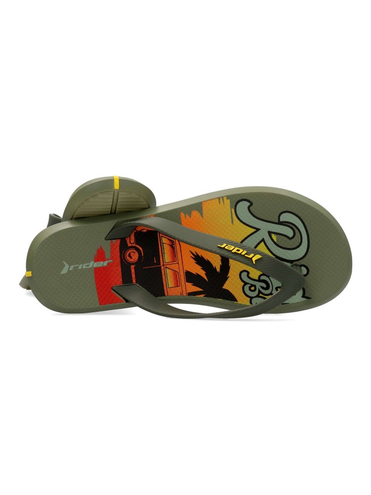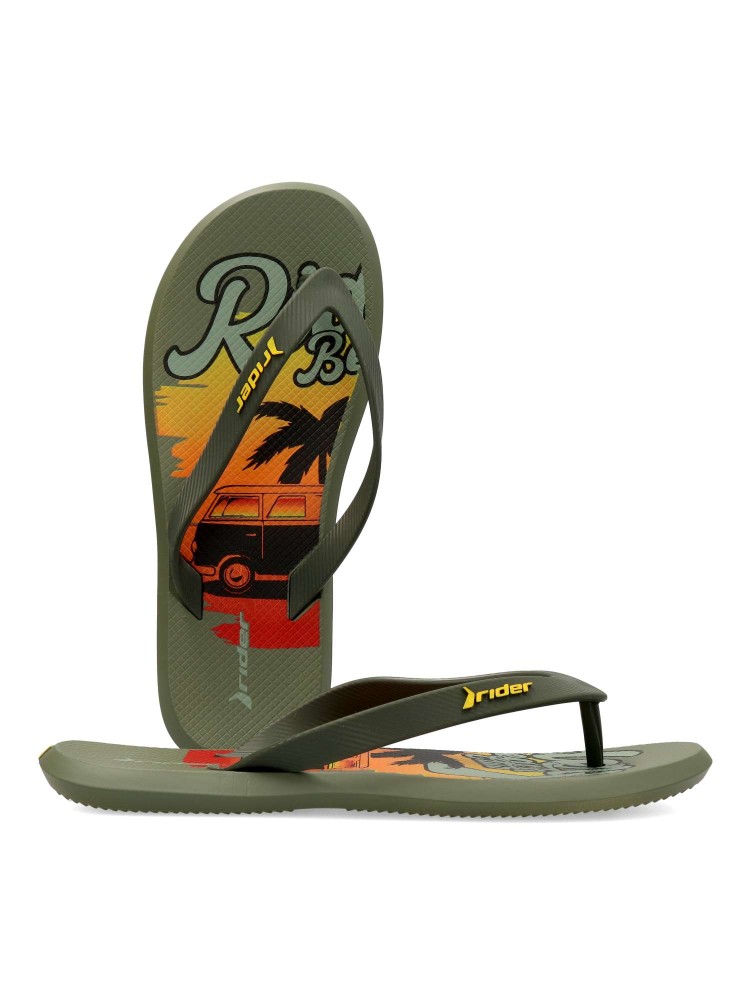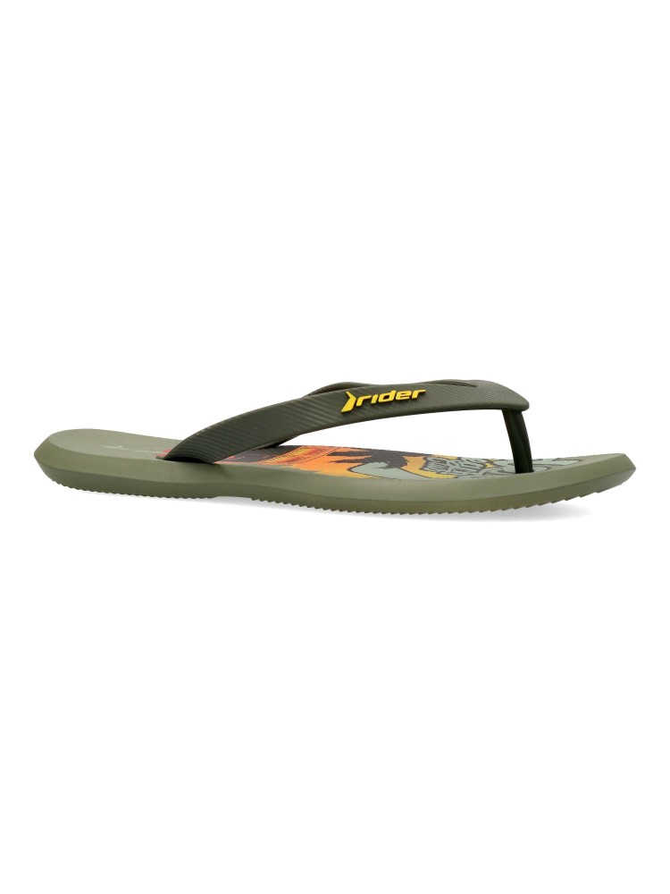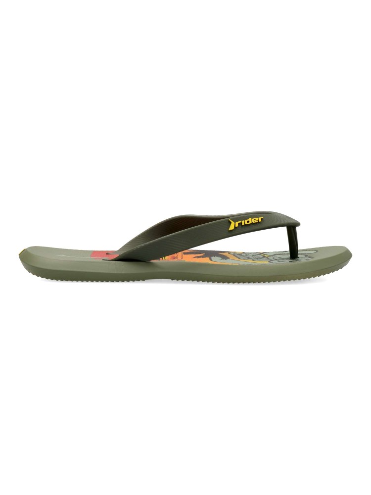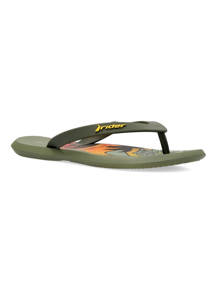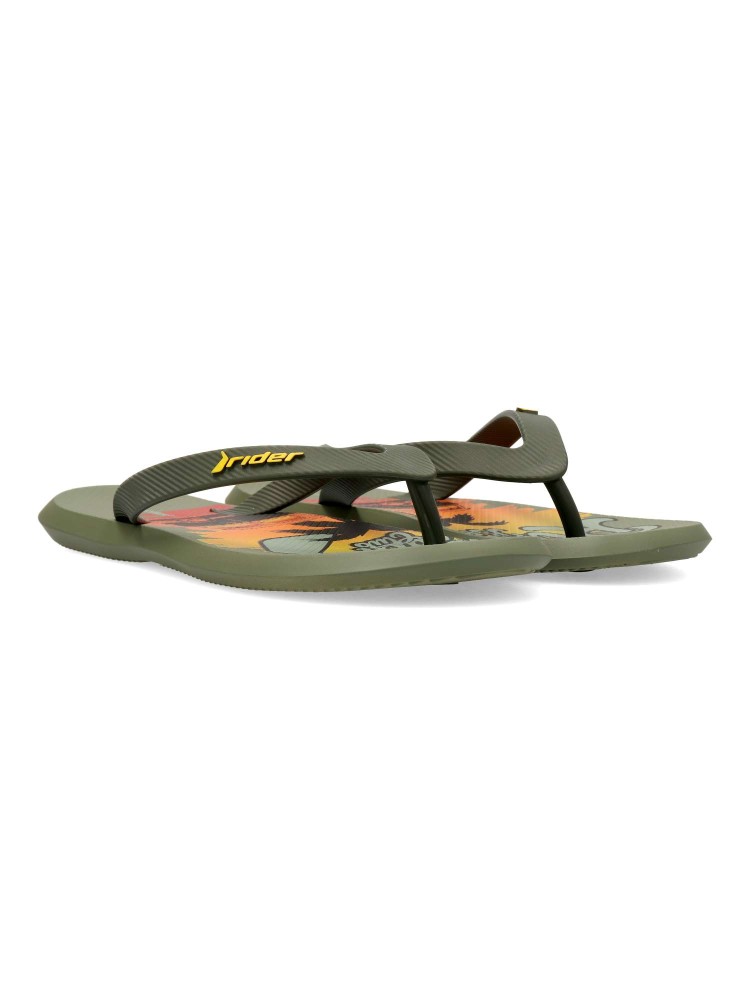 Chancla de playa cómoda para hombre. Chanclas tipo esclava, ideal para la playa y la piscina. Exterior y suela de goma suave, flexible y ligera. Chanclas brasileñas innovadoras y elegantes. Color verde con estampado veraniego. 100% vegano.