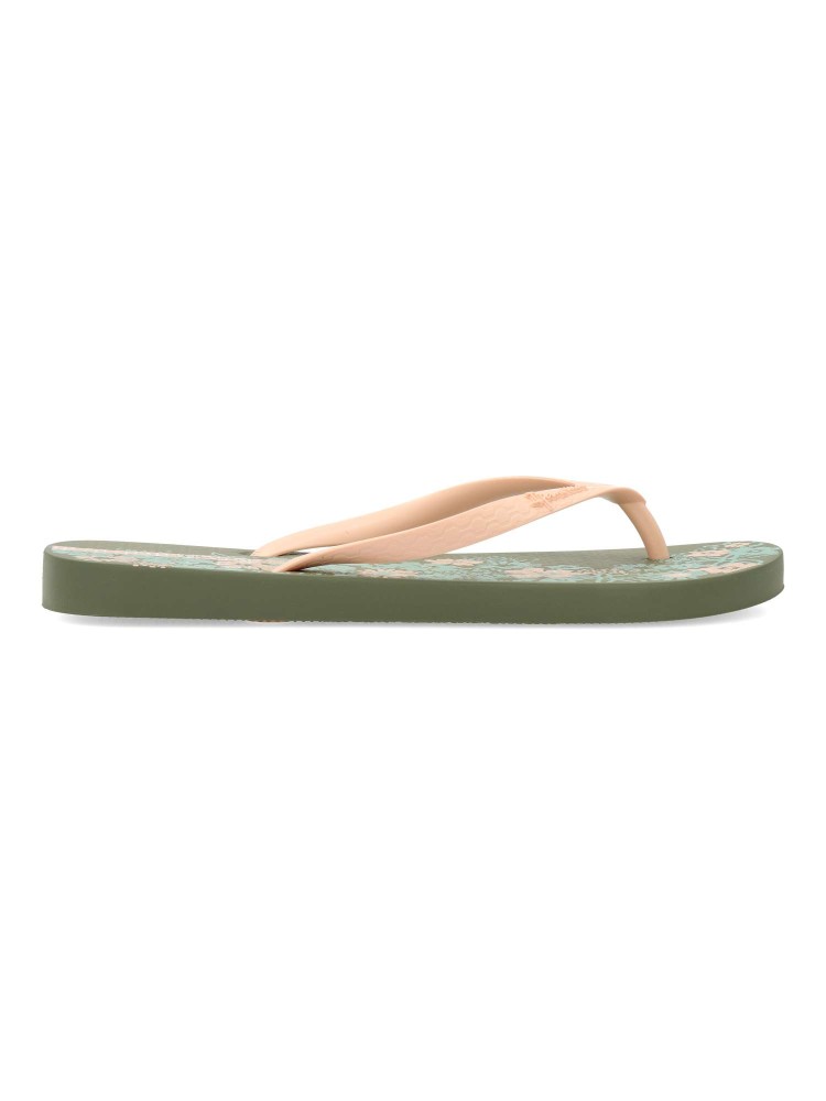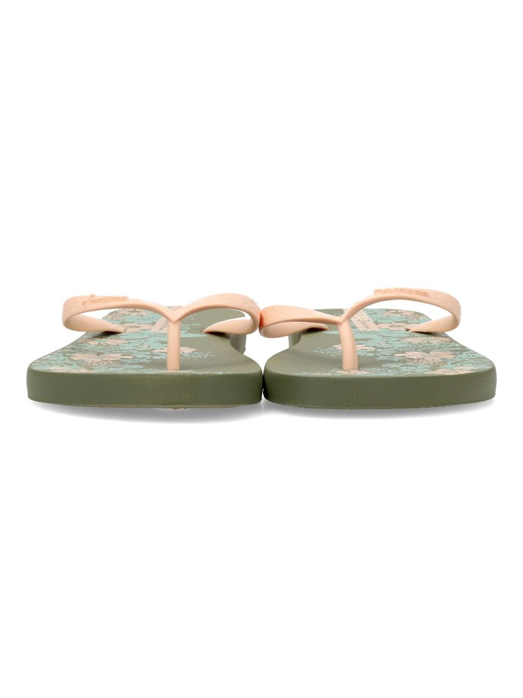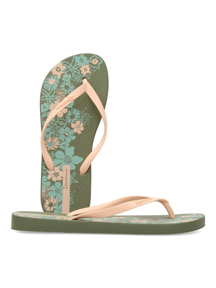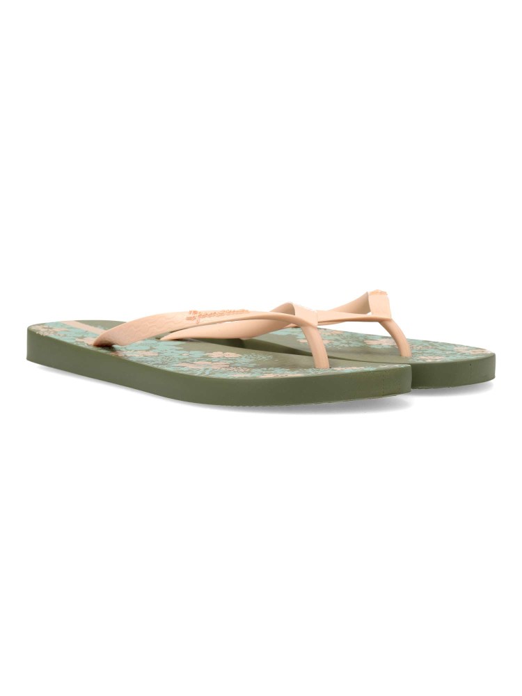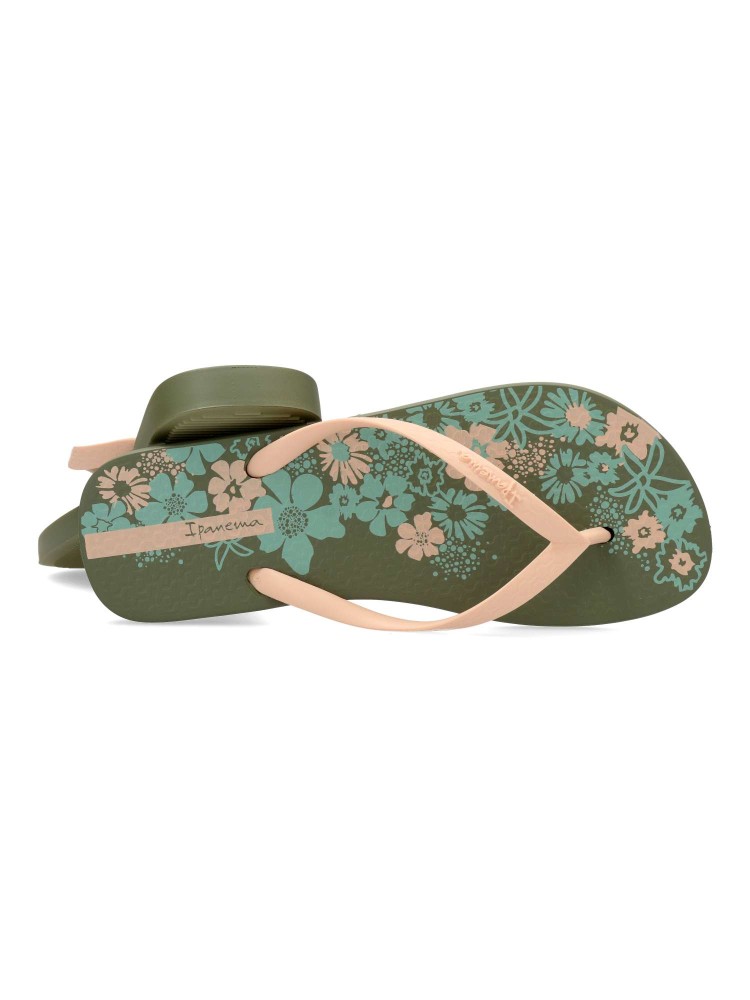 Chancla dedo playa de mujer. Chanclas tipo esclava, ideal para la playa o la piscina. Exterior y suela de goma ligera, flexible y antideslizante. Chanclas brasileñas innovadoras y elegantes. Disponible en color verde-beige (estampado flores). IPANEMA.