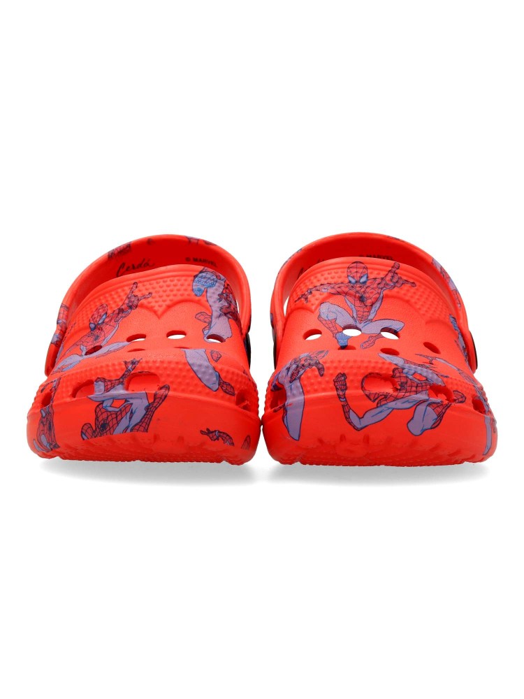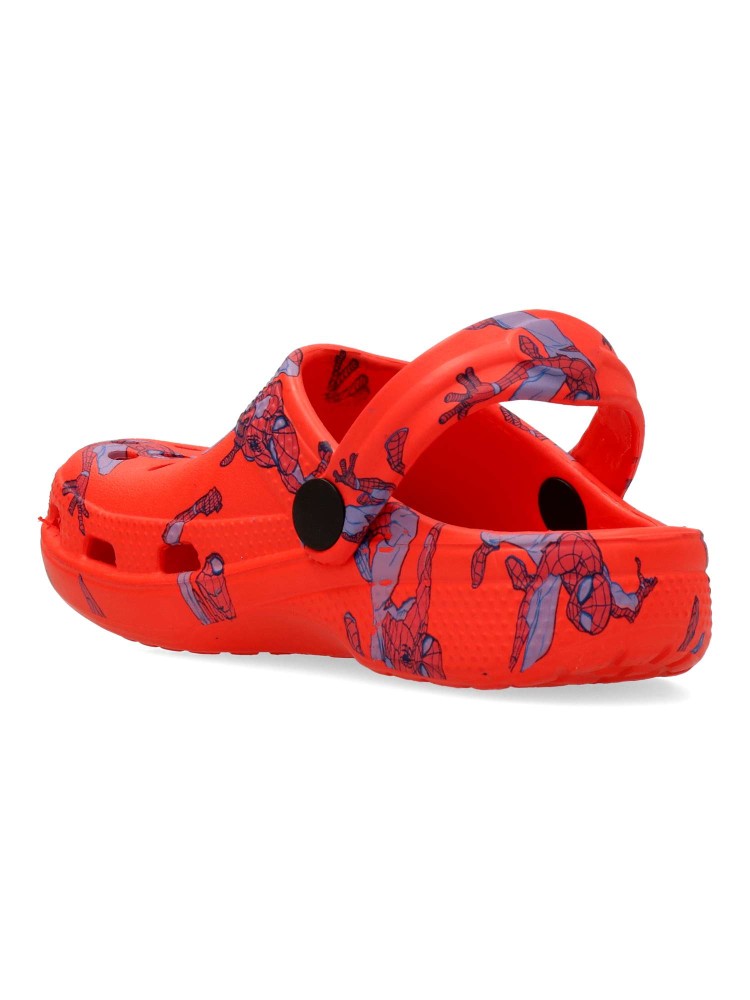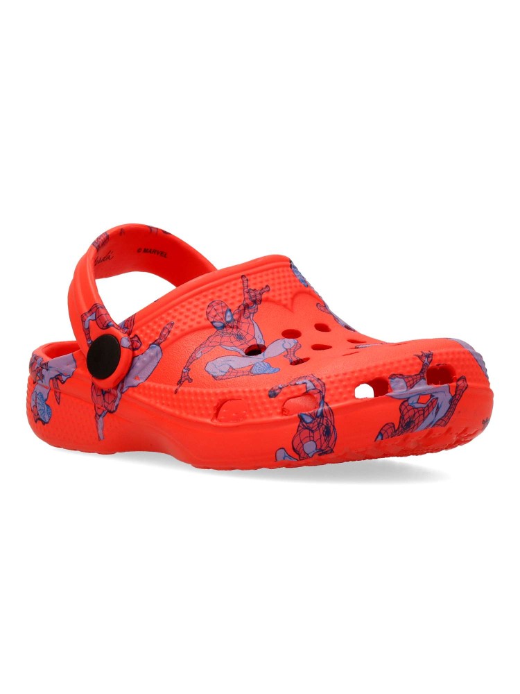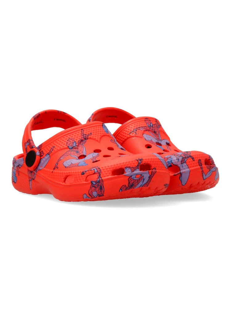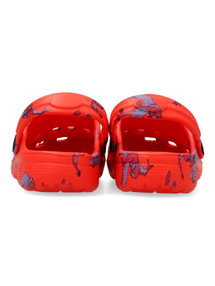 Chancla zueco de goma para niño. Estampado dibujo Spiderman. Fabricado en goma EVA. Tira trasera para una mejor sujeción del pie. Disponible en color rojo. Modelo cómodo, ligero, fresco y transpirable para el disfrute de los peques.