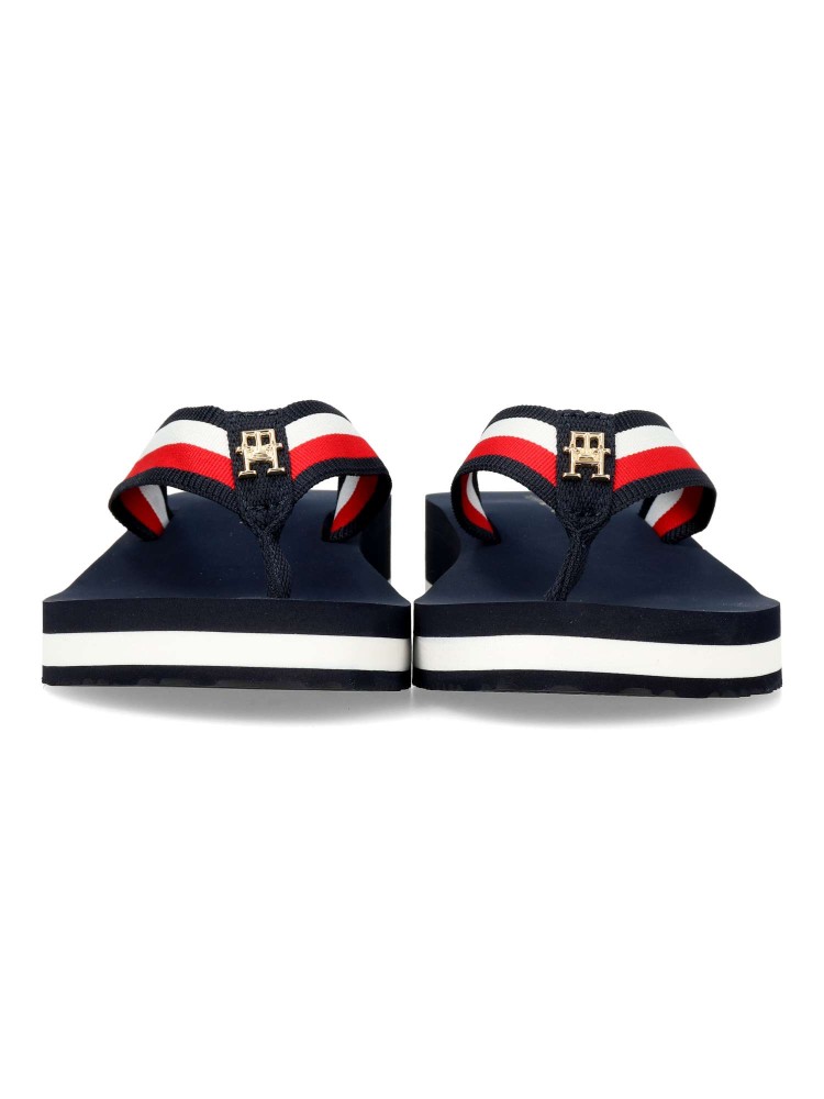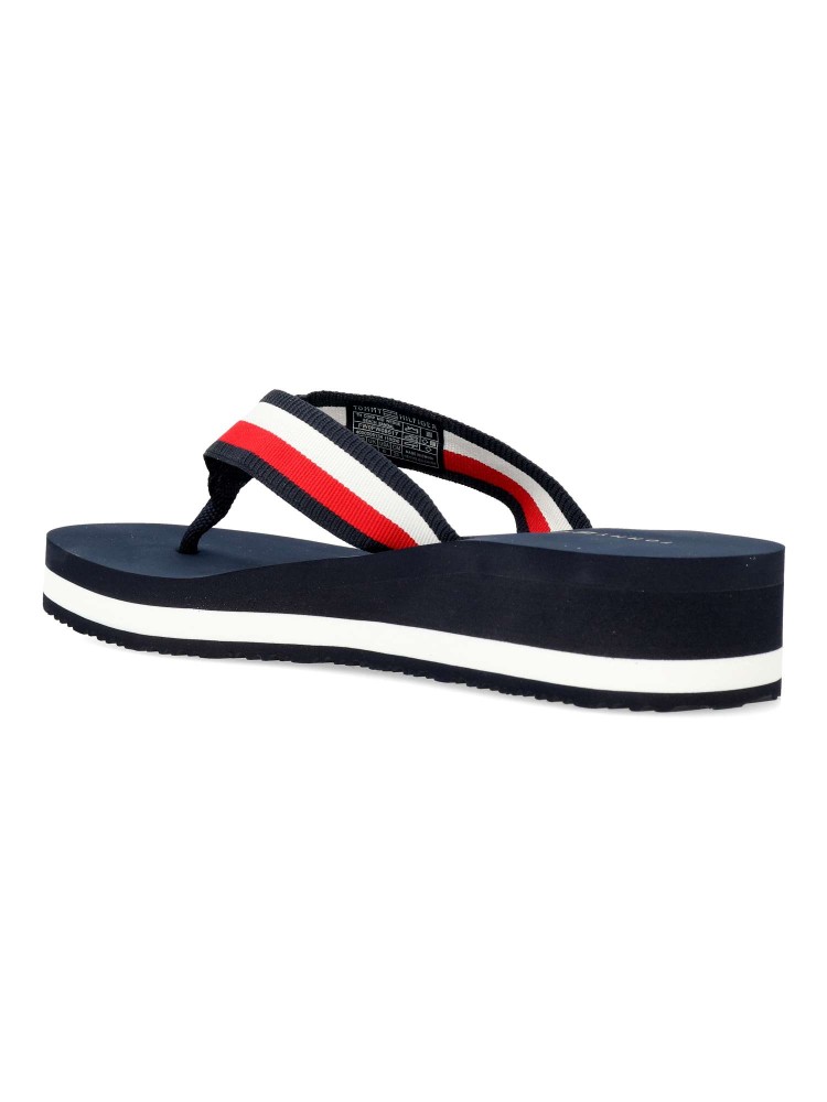 Sandalia de playa para mujer. Modelo cómodo, fabricada en textil con suela de goma eva. Modelo tipo esclava color marino con rayas multi. Pequeña cuña de 3,5 cm. de altura. Ideal para la playa o piscina. Tommy Hilfiger. TH Corp Mid Wedge Beach.