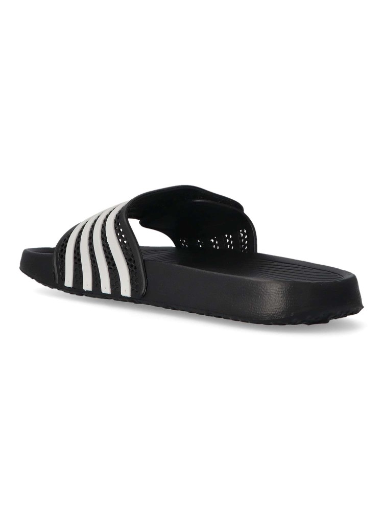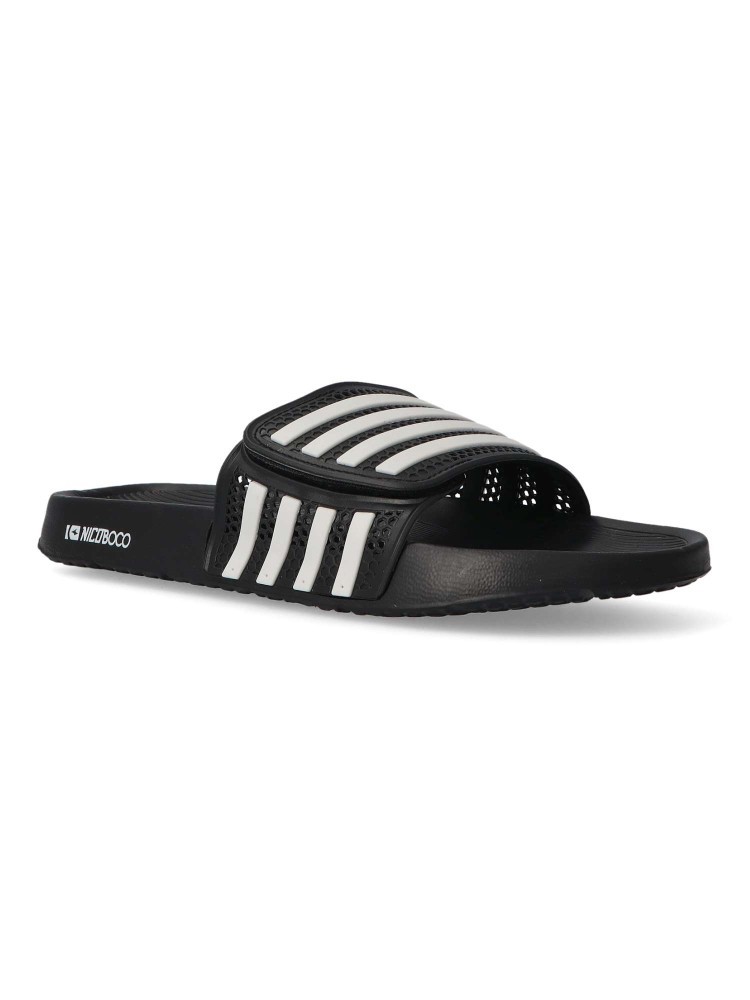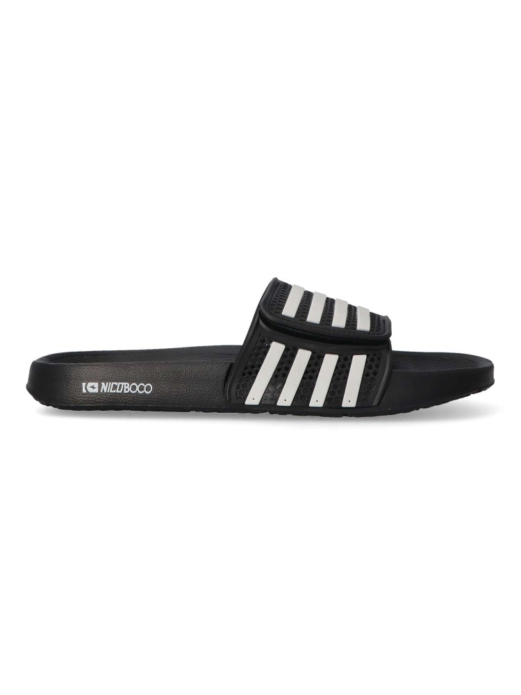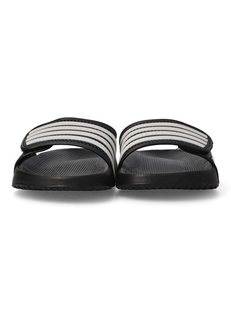 Chanclas de playa para hombre. Modelo con pala de goma ajustable con velcro. Suela de goma EVA. Color negro con rayas blancas. Una chancla cómoda, transpirable, ligera y flexible, ideal para la playa y la piscina.