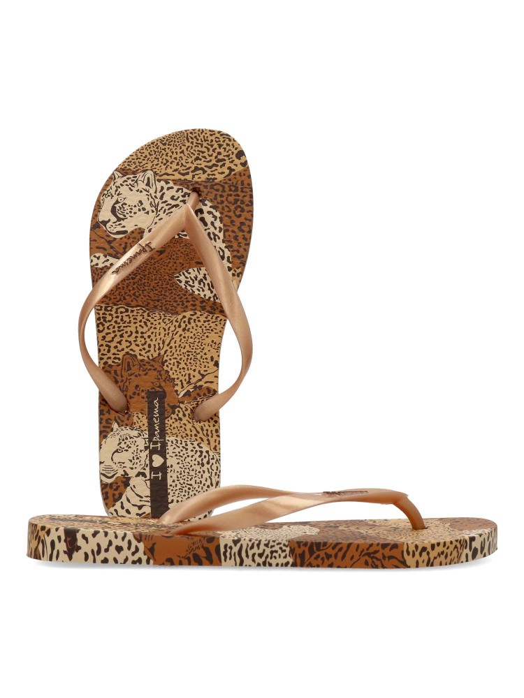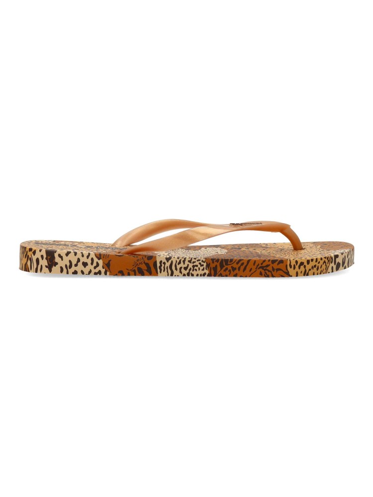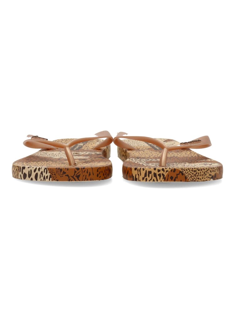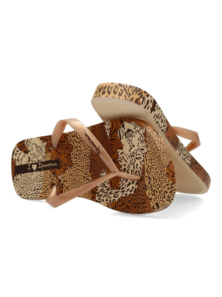 Chancla dedo playa de niña. Chanclas tipo esclava, ideal para la playa o la piscina. Exterior y suela de goma ligera, flexible y antideslizante. Chanclas brasileñas innovadoras y elegantes. Disponible en color beige-oro con estampado leopardo. IPANEMA.