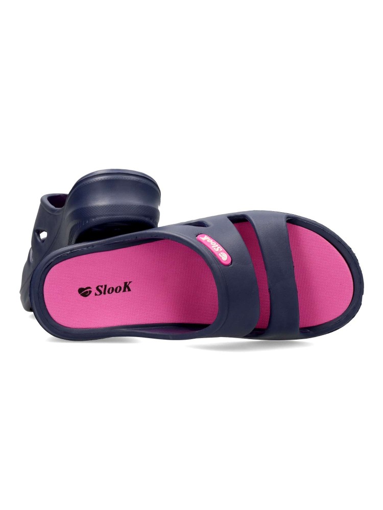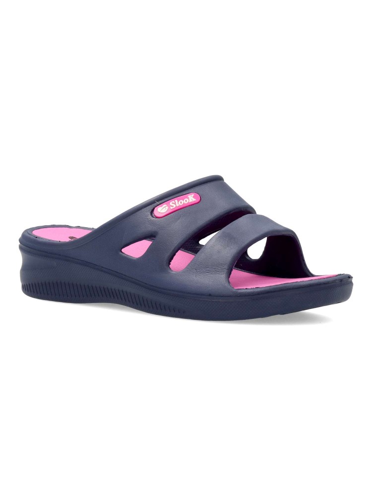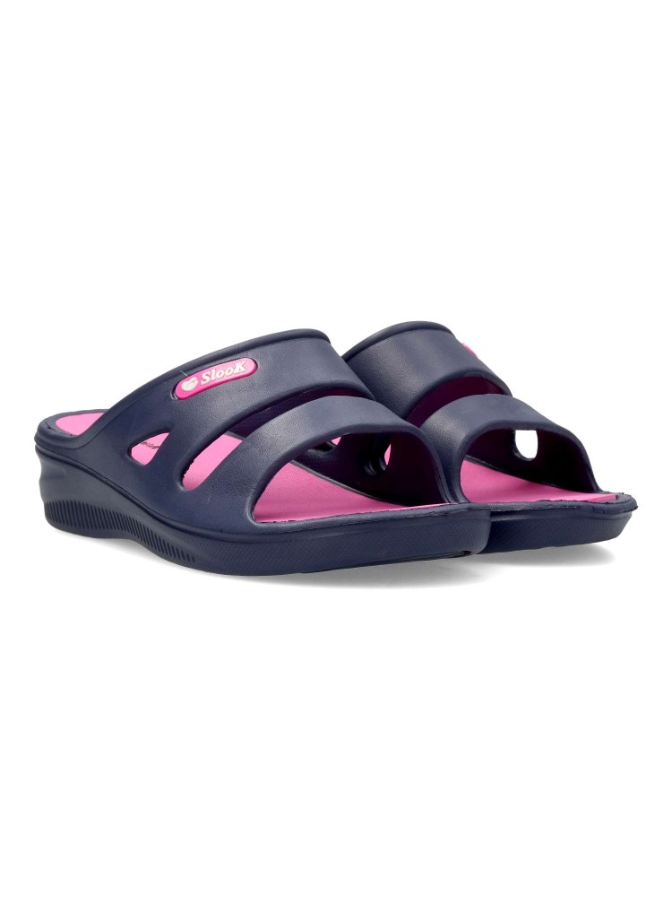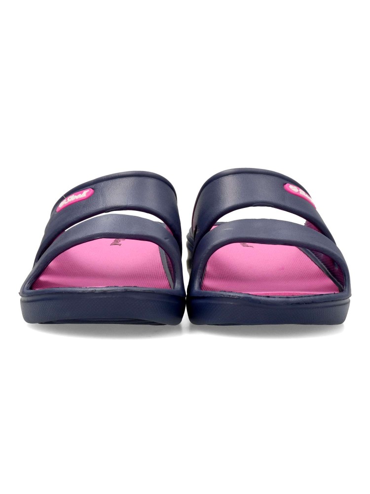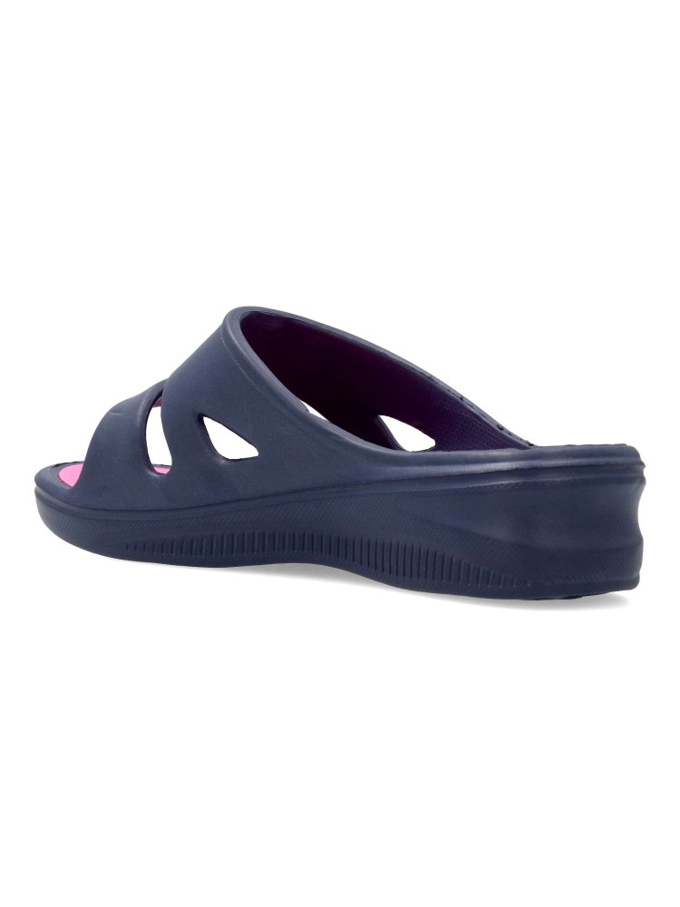 Chancla de playa con doble tira en la pala. Modelo tipo sandalia, cómodo, ligero y flexible. Fabricado en goma EVA. Planta acolchada para amortiguación de impactos. Pequeña cuña de 4 cm. de altura. Color marino-fucsia. Ideal para la playa y la piscina.