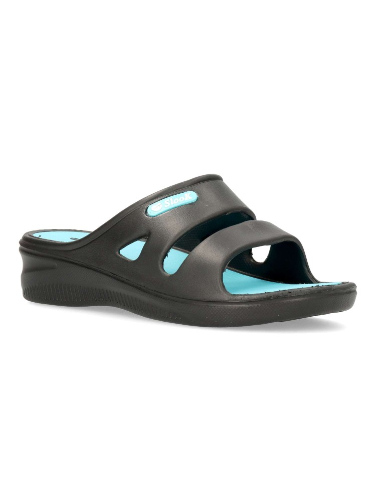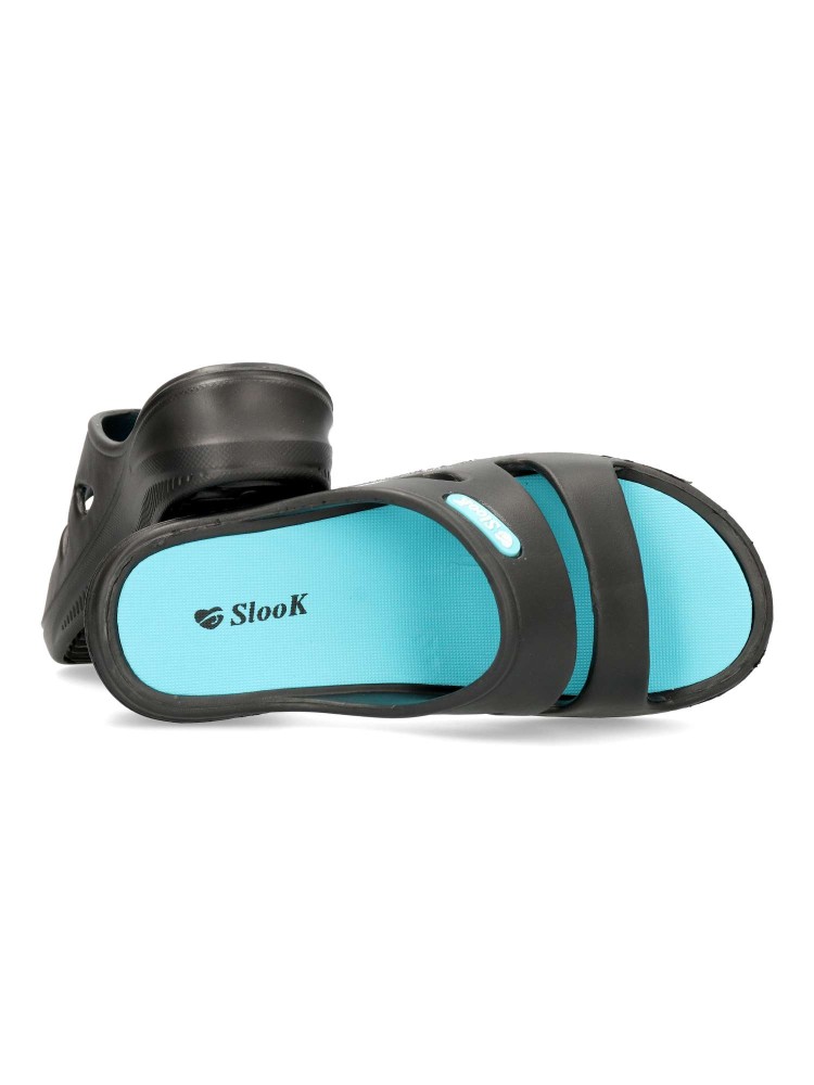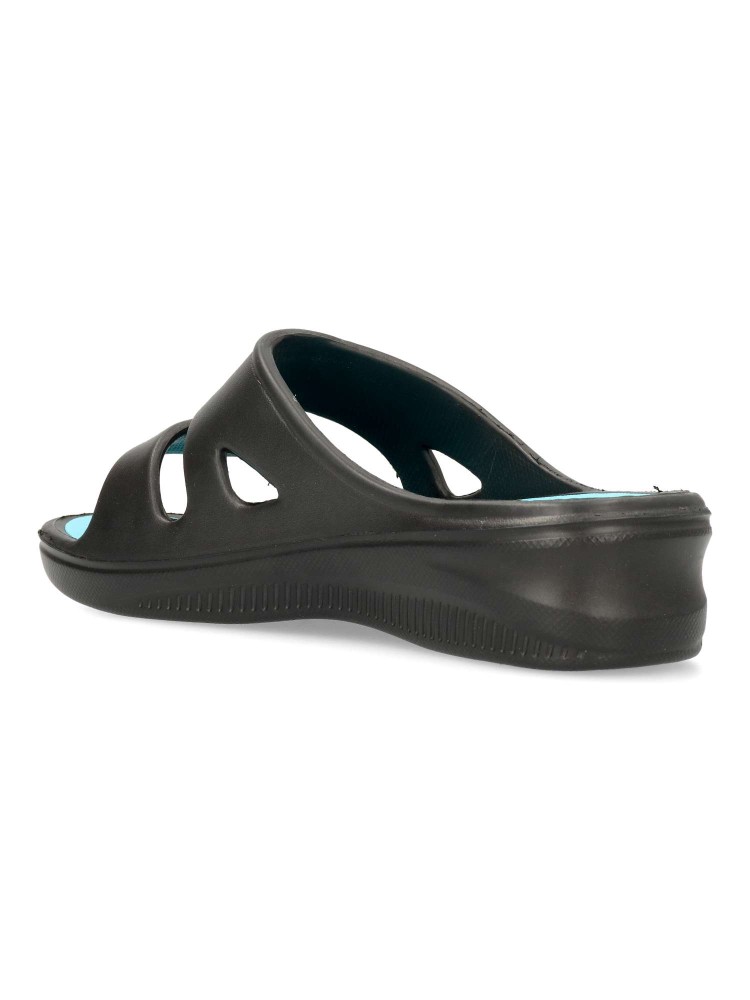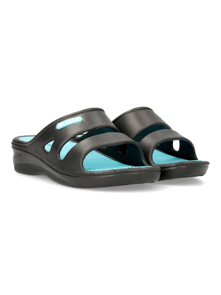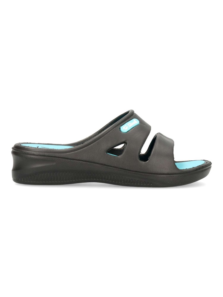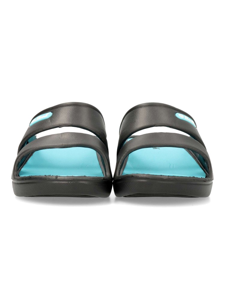 Chancla de playa con doble tira en la pala. Modelo tipo sandalia, cómodo, ligero y flexible. Fabricado en goma EVA. Planta acolchada para amortiguación de impactos. Pequeña cuña de 4 cm. de altura. Color negro-agua. Ideal para la playa y la piscina.