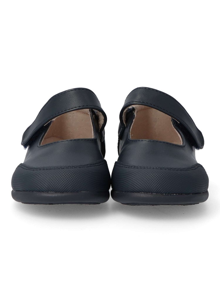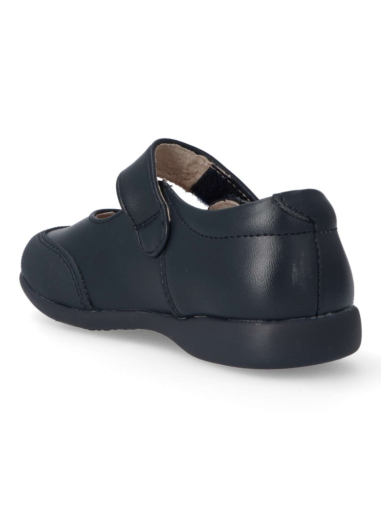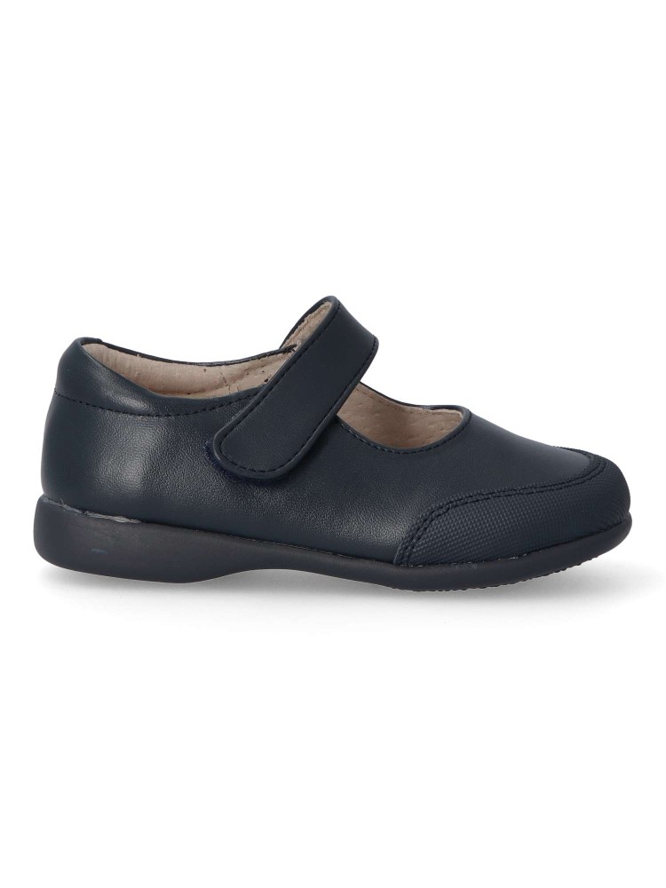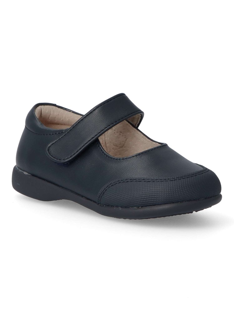 Zapato colegial de niña. Mercedita con cierre de tira adherente. Disponible en color marino. Puntera reforzada. Fabricado en piel suave, con suela de goma flexible. Plantilla de piel acolchada. Ideal para uniformes colegiales. PEKE´S By Vanessa.