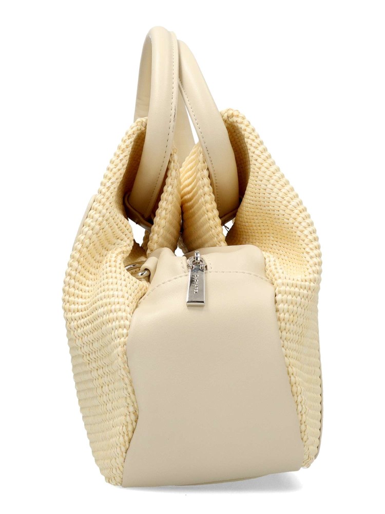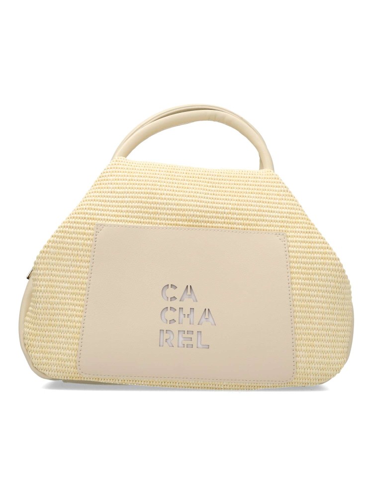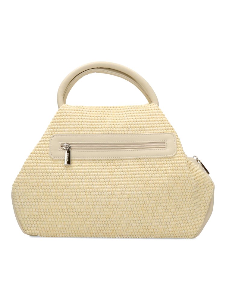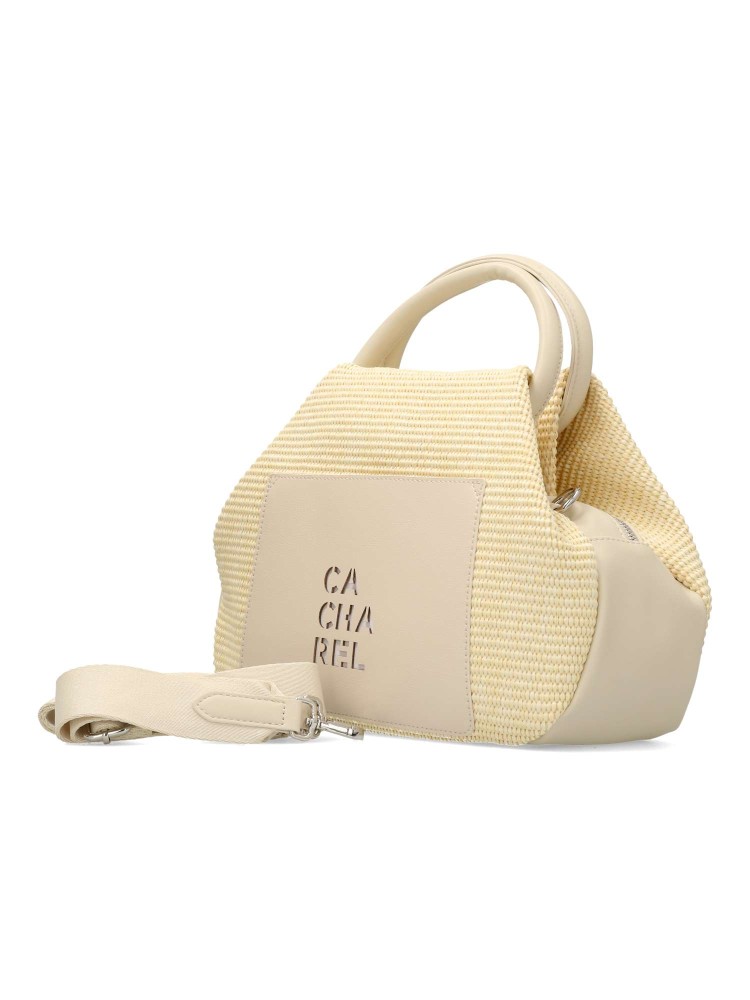 Bolso de mano con bolsillo trasero. Cuenta con dos asas de mano y asa corredera para llevarlo cruzado. Elaborado con materiales novedosos en tonalidad crema. Medidas aproximadas: 30 cm (largo) x 11.5 cm (ancho) x 23 cm (alto)