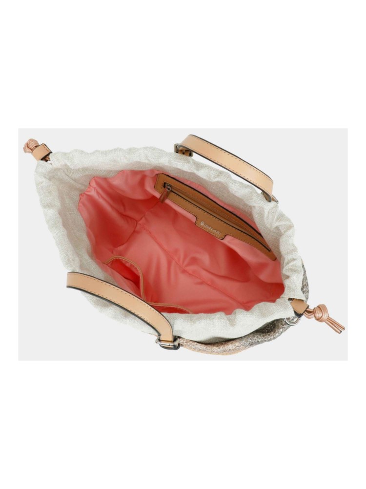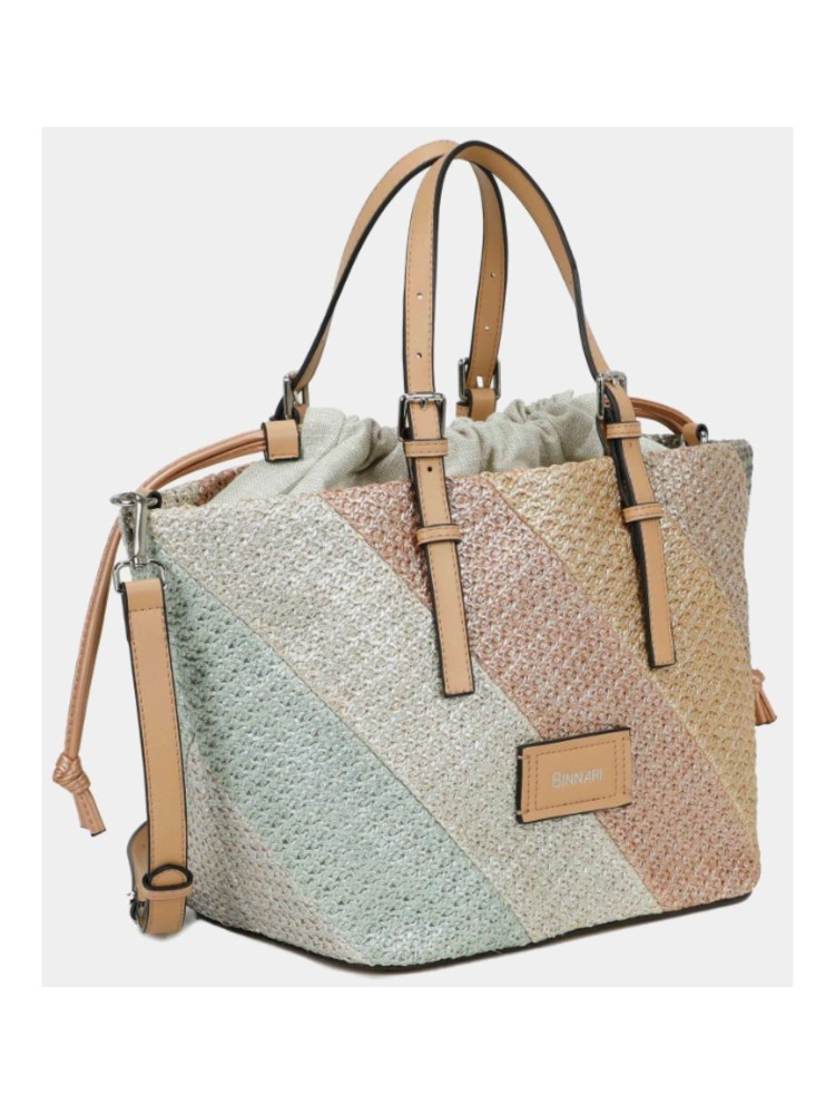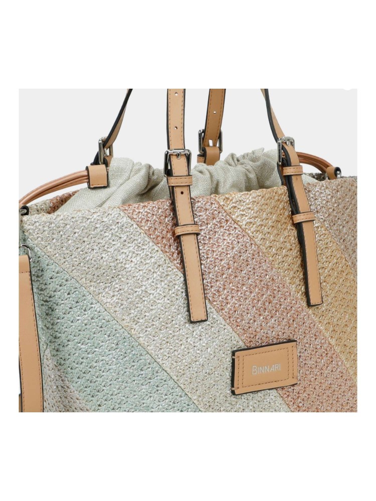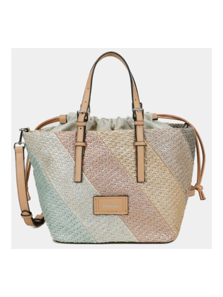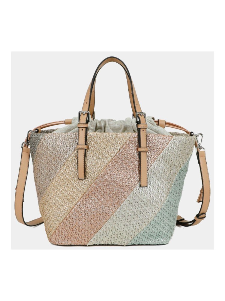 Bolso de dos asas Narcea. Confeccionado en rafia multicolor. Tiene 2 posiciones: mano y bandolera. En el interior cuenta con una bolsa textil para poder almacenar todas las cosas de una manera segura y ordenada. Medidas: Alto: 22cm Ancho:39cm Fondo:15cm.