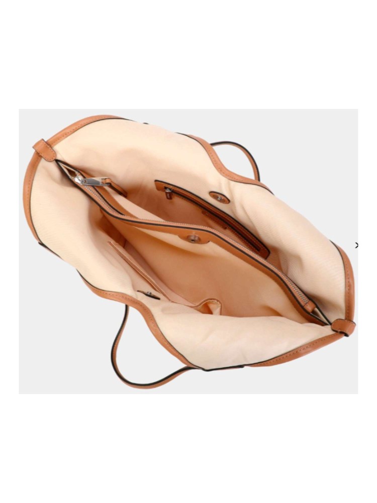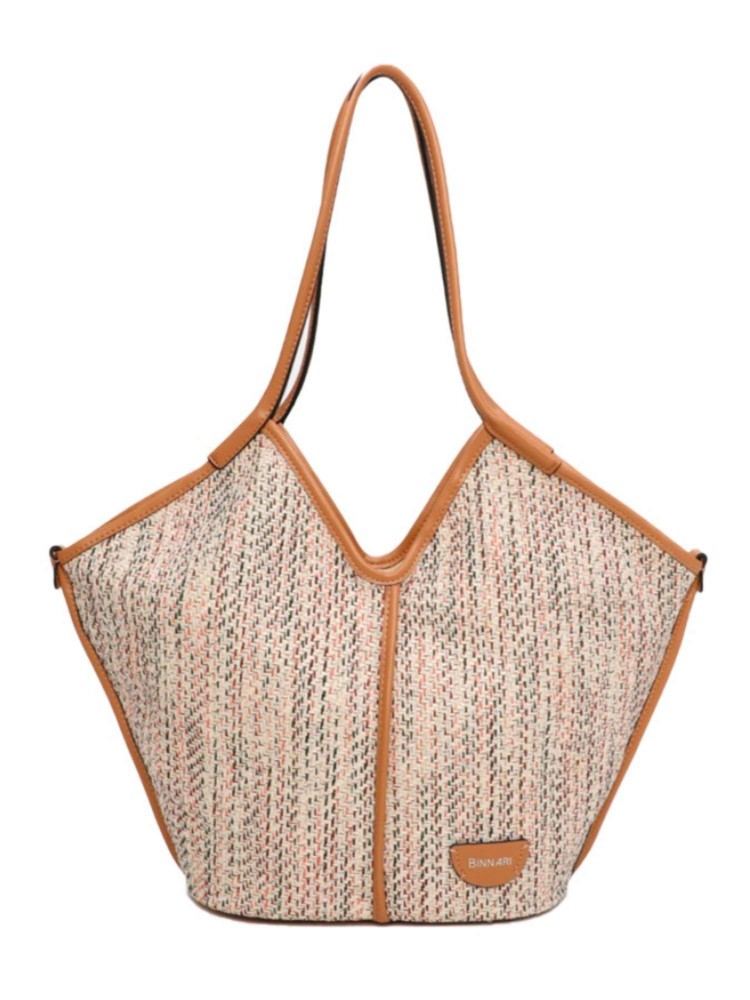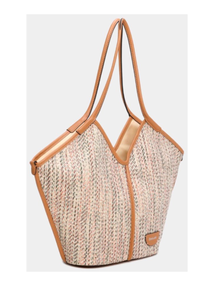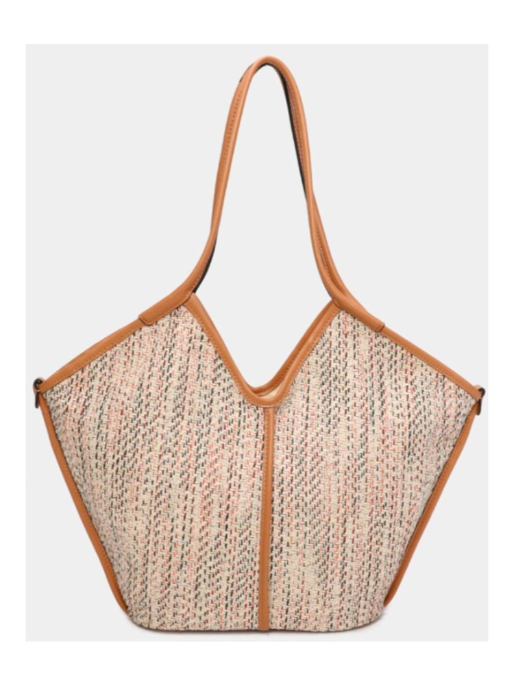 Bolso de hombro, con dos asas y cierre de cremallera. Fabricado en rafia textil y detalles en pu de alta calidad. Tiene 2 posiciones: hombro y bandolera. Cuenta con bolsillo trasero y 3 bolsillos en interior. Medidas: Alto: 22cm Ancho:24cm Fondo: 13cm.