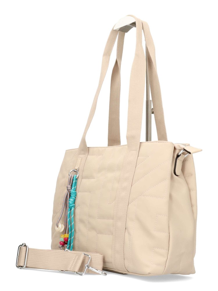 Bolso de hombro para mujer. Fabricado en textil color taupe. Cierre de cremallera. Bolsillos en interior y exterior. Medidas aproximadas: 40cm (largo) x 10,5cm (ancho) x 25cm (alto).