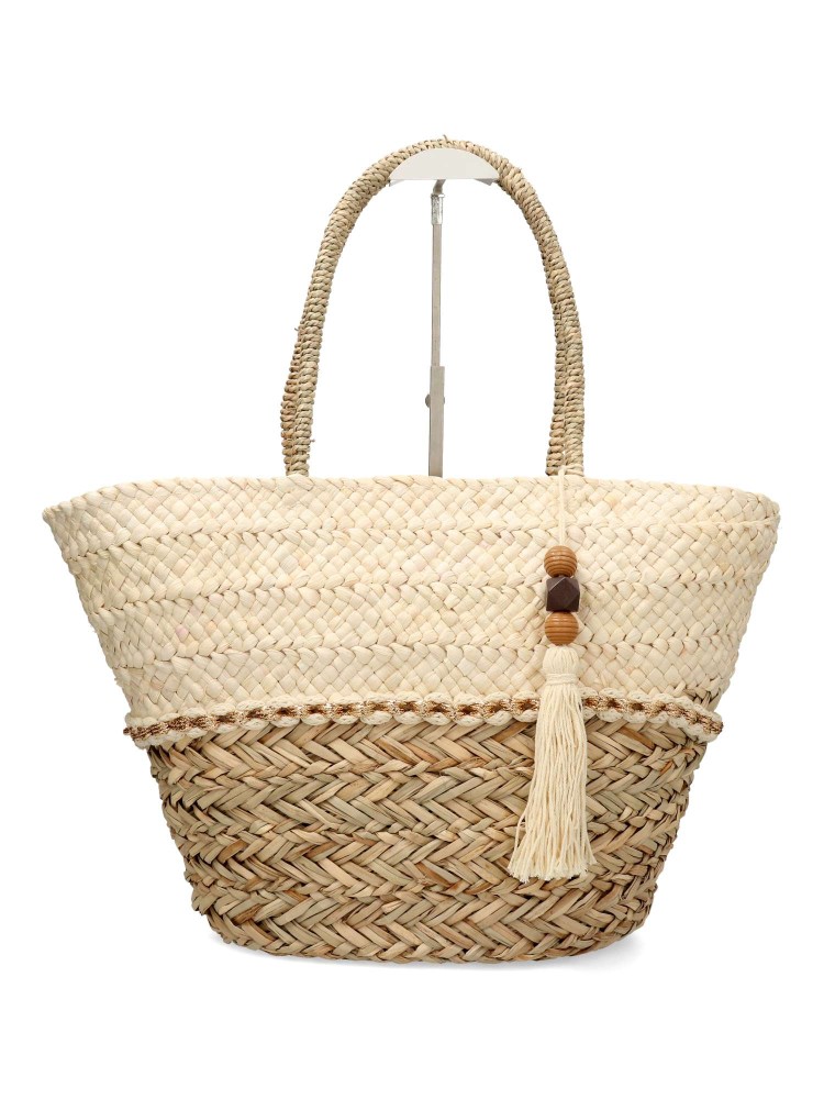 Bolso capazo rafia en color natural y beige. Detalle de borla de flecos decorativa. Medidas aproximadas: 40cm (largo) x 17cm (ancho) x 29cm (alto)