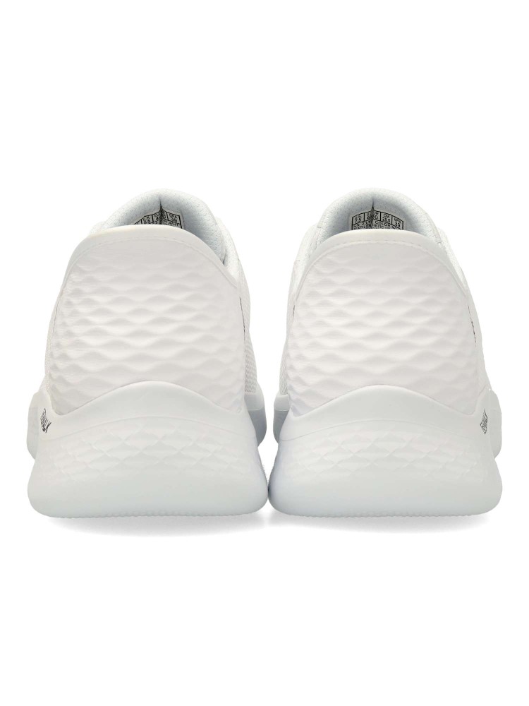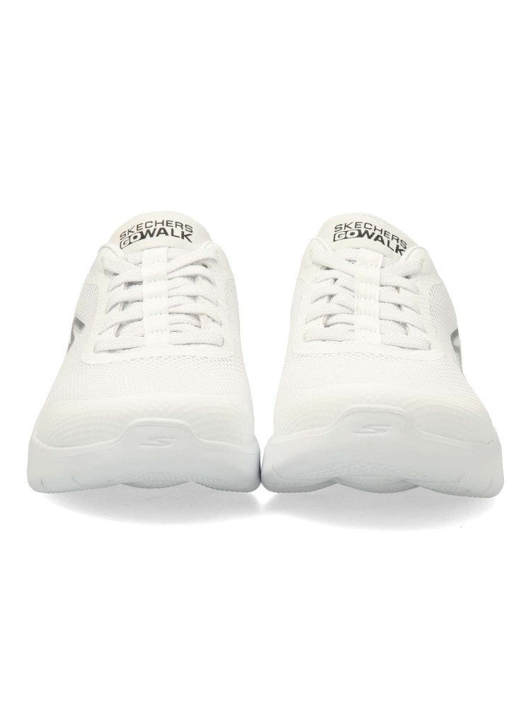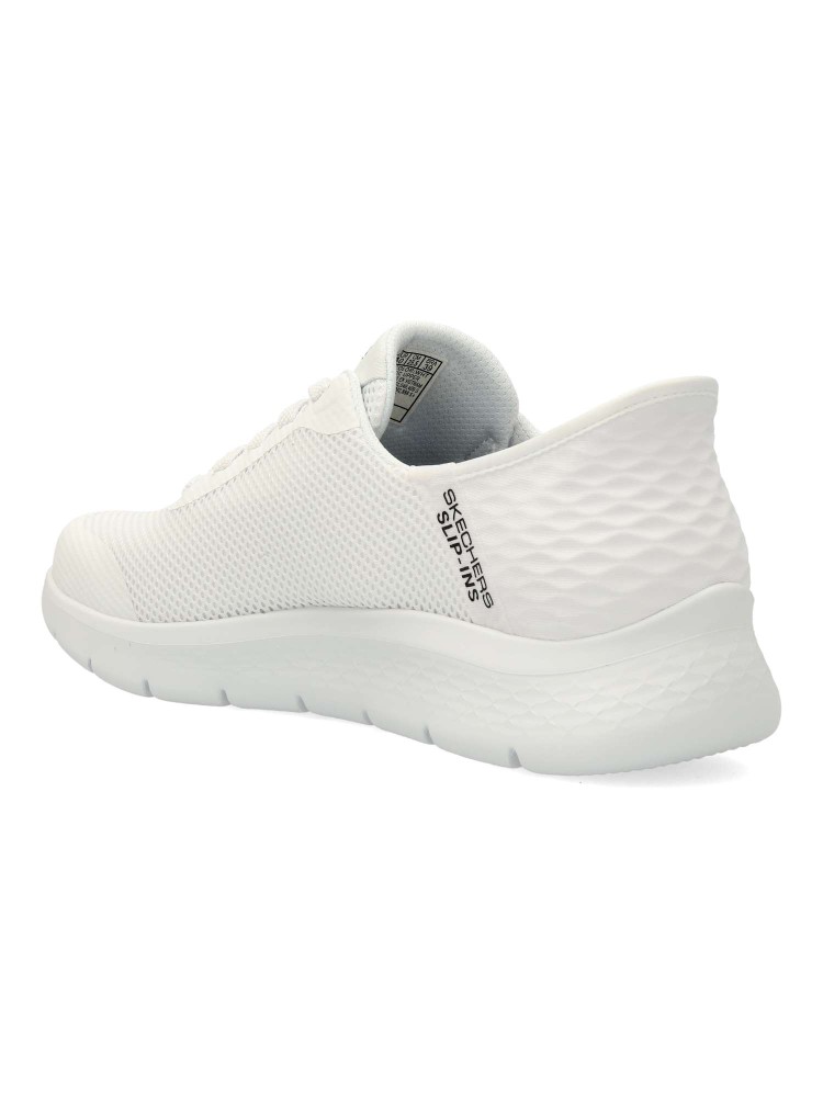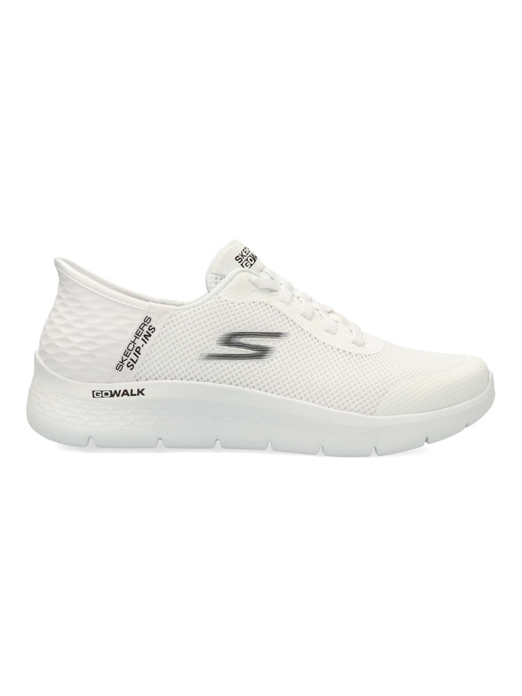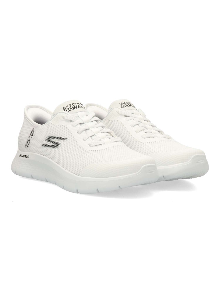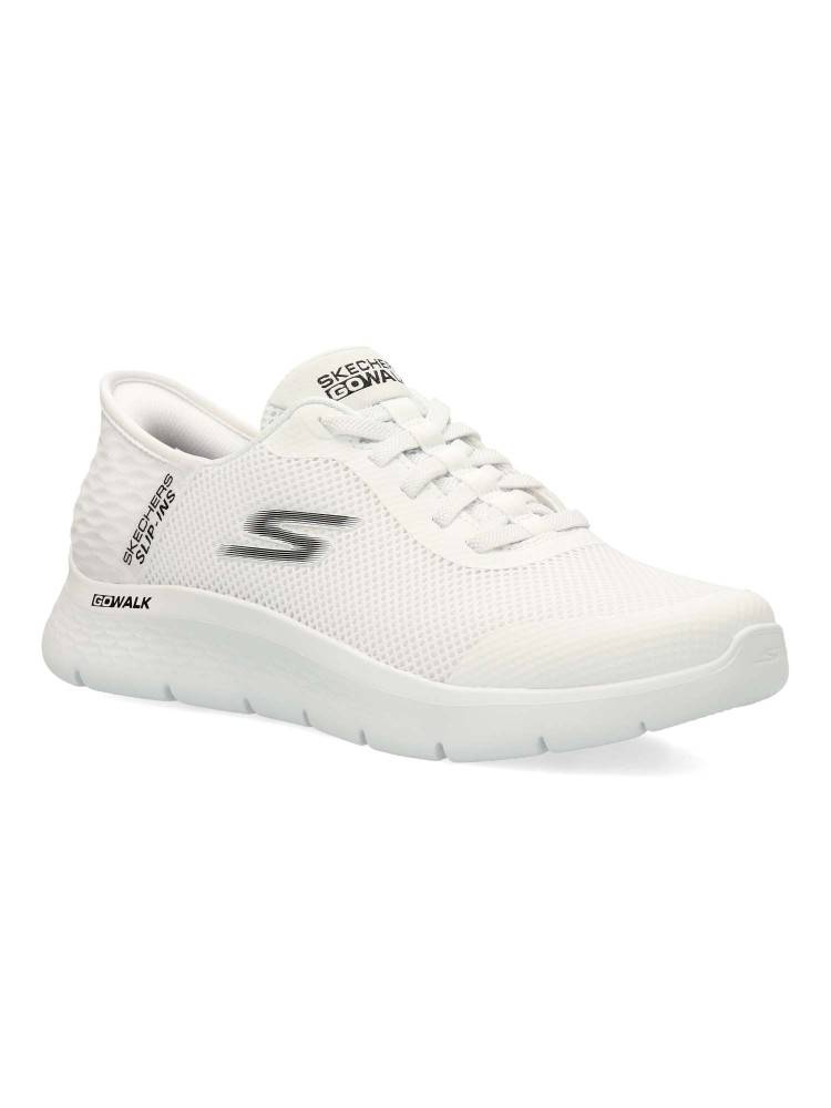Skechers Hands Free Slip-ins® GO WALK® Flex - Hands Up. Comodidad, flexibilidad y estilo, diseñado con nuestro sistema exclusivo Heel Pillow™. Plantilla Skechers Air-Cooled Memory Foam® y media suela ligera ULTRA GO® con amortiguación. Color blanco.