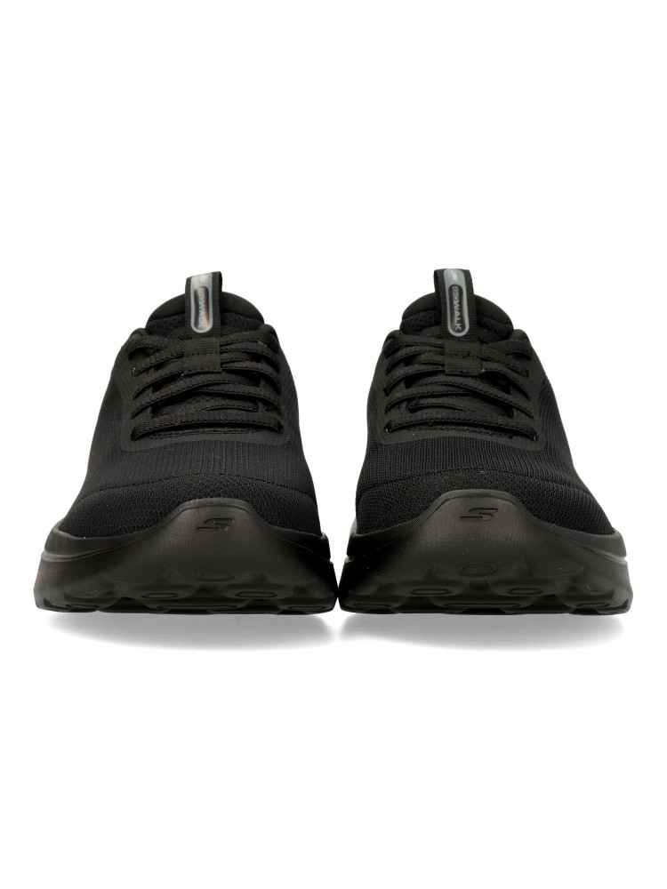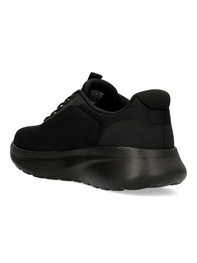 Zapatilla deportiva slip-on y vegana para caminar. Color negro con suela negra. Cuenta con un amplio empeine de malla deportivo con cordones elásticos fijos y una plantilla Arch Fit® extraíble. Disfruta del apoyo en tus caminatas diarias con estilo.