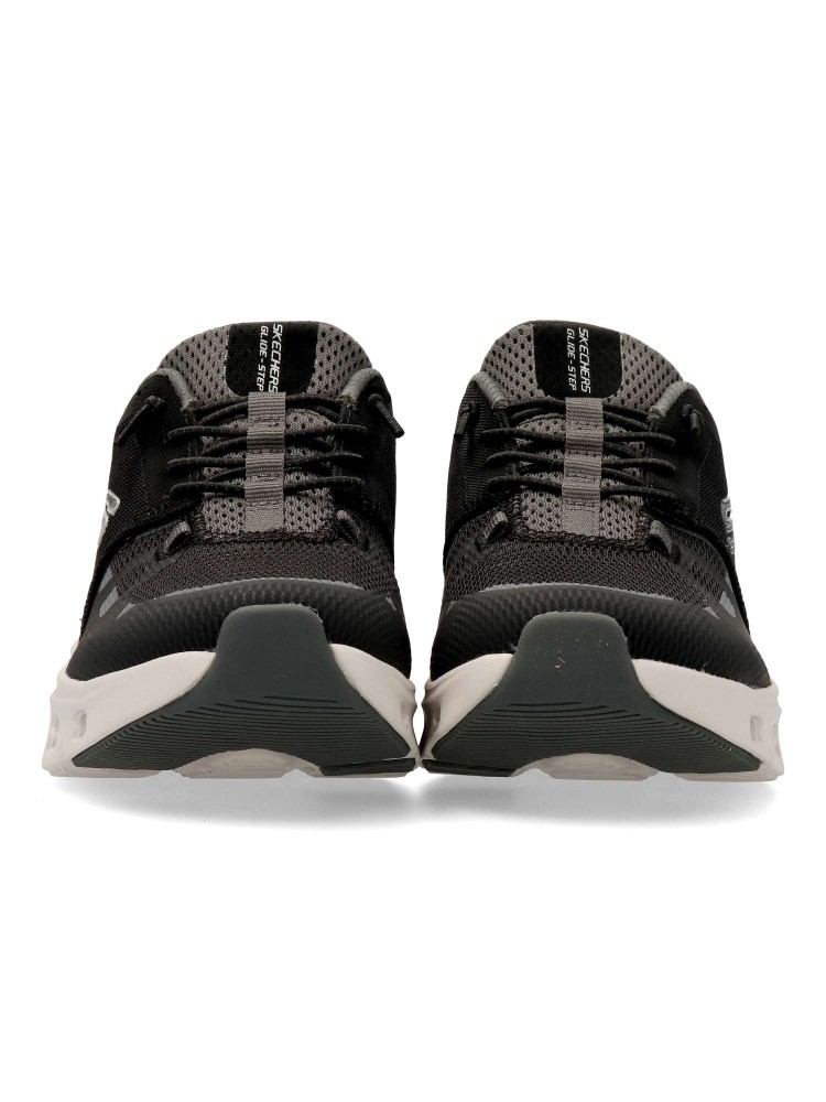 Zapatilla con sistema exclusivo Heel Pillow™, presenta una parte superior de malla con superposiciones sintéticas termoselladas, una cómoda plantilla Skechers Air-Cooled Memory Foam® y una media suela geométrica Glide-Step® con amortiguación.