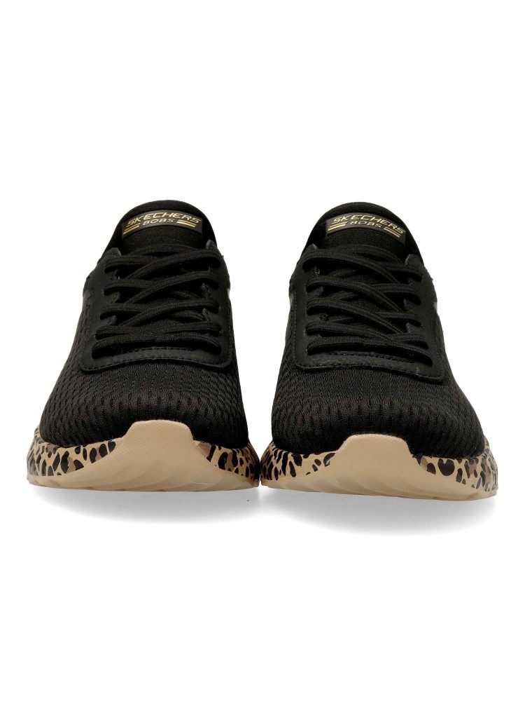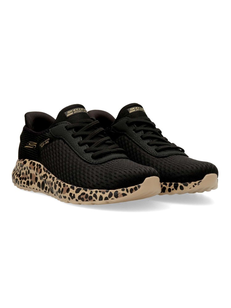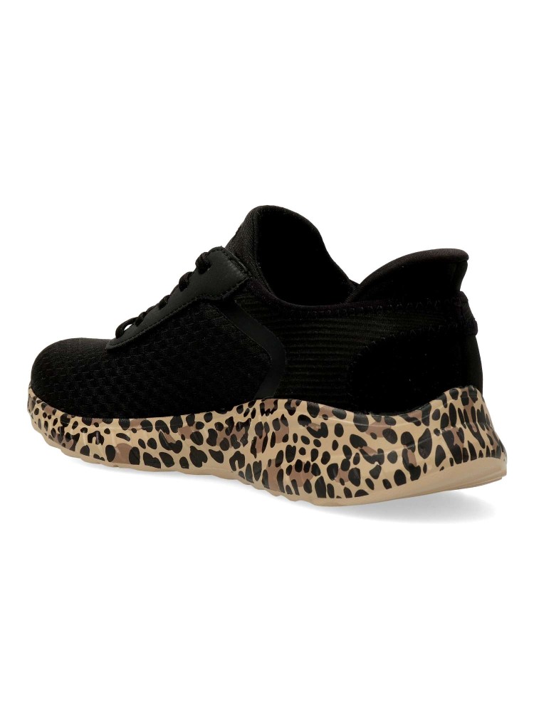 Diseñado con nuestro sistema Heel Pillow™, este modelo casual y vegano. Parte superior de malla y tejido sintético con cordones elásticos fijos. Media suela con estampado de leopardo. plantilla con amortiguación Skechers Memory Foam™.