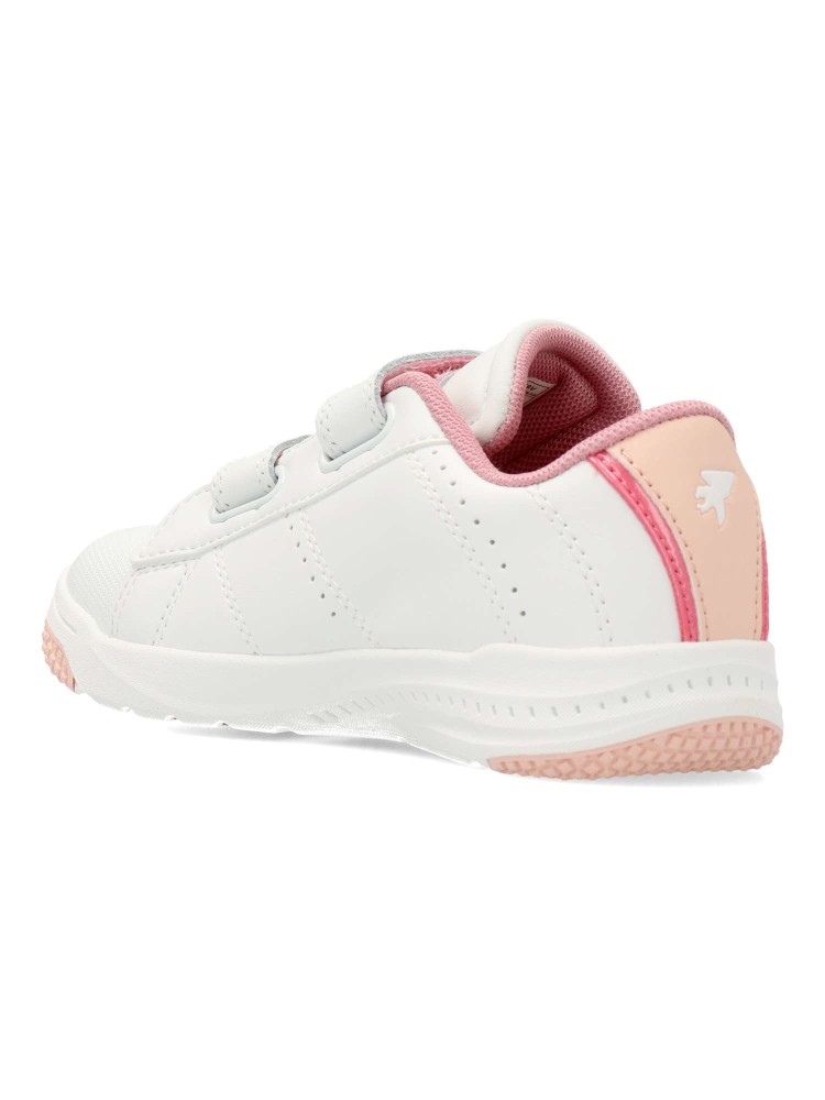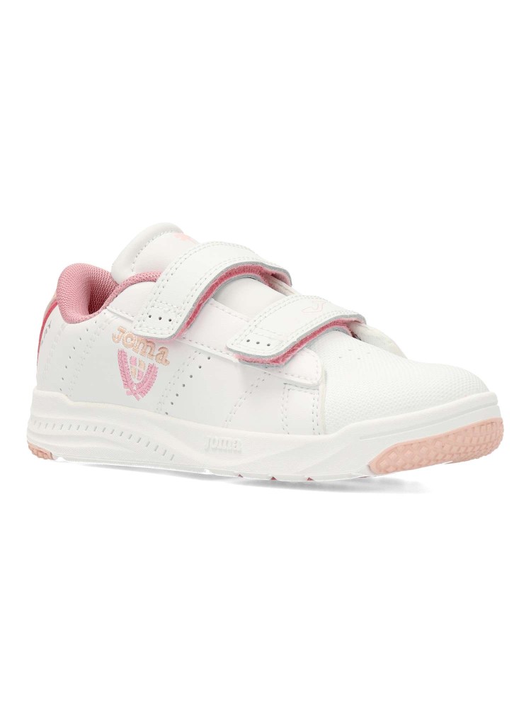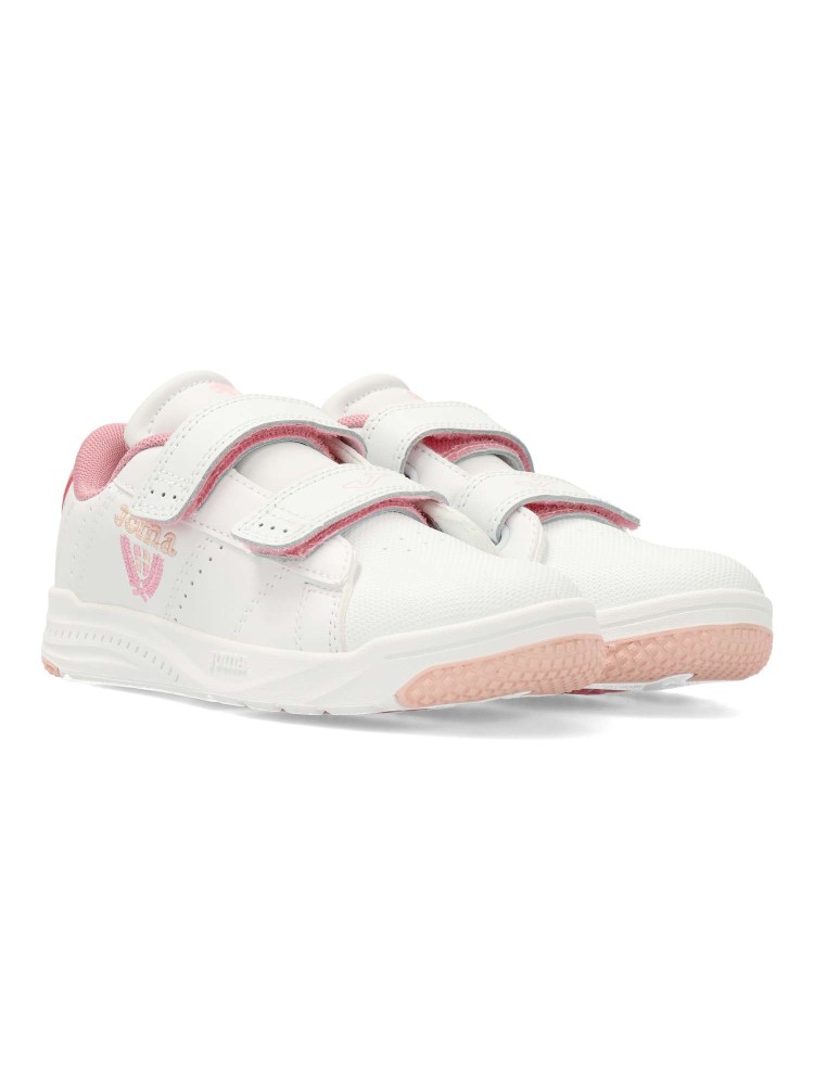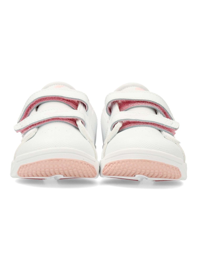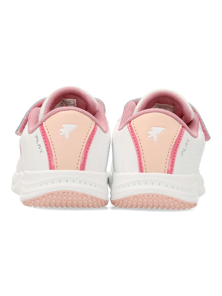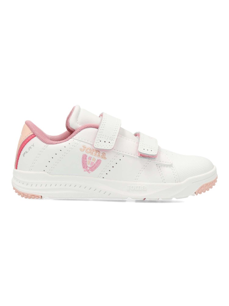Zapatilla deportiva colegial con cierre adherente. Modelo cómodo para uso diario. Reforzado para cualquier tipo de juego. Fabricado en piel sintética con suela de caucho. Color blanco-rosa. Diseñado para el disfrute y confort de los niños. PLAY JR 2529.