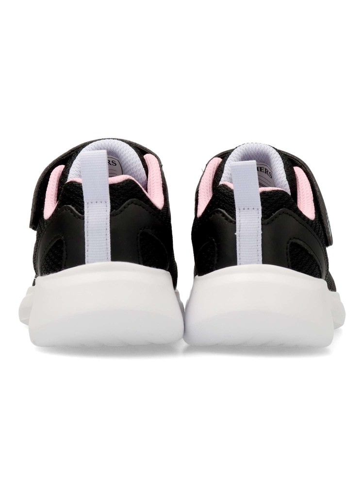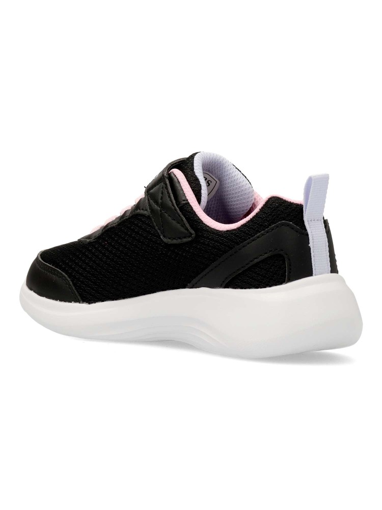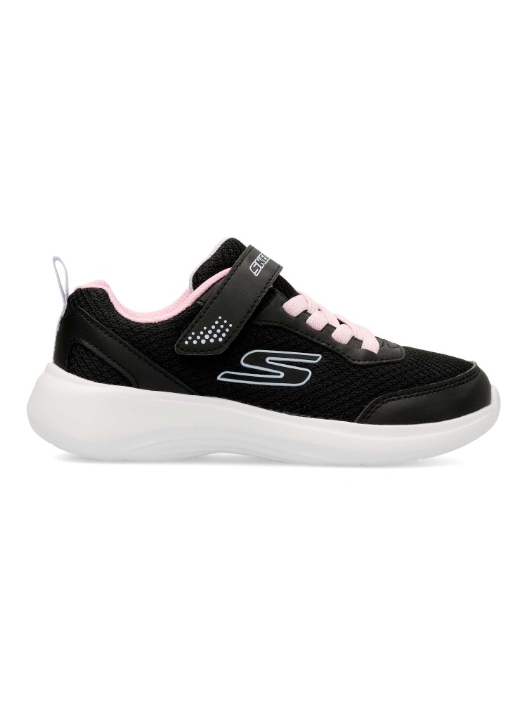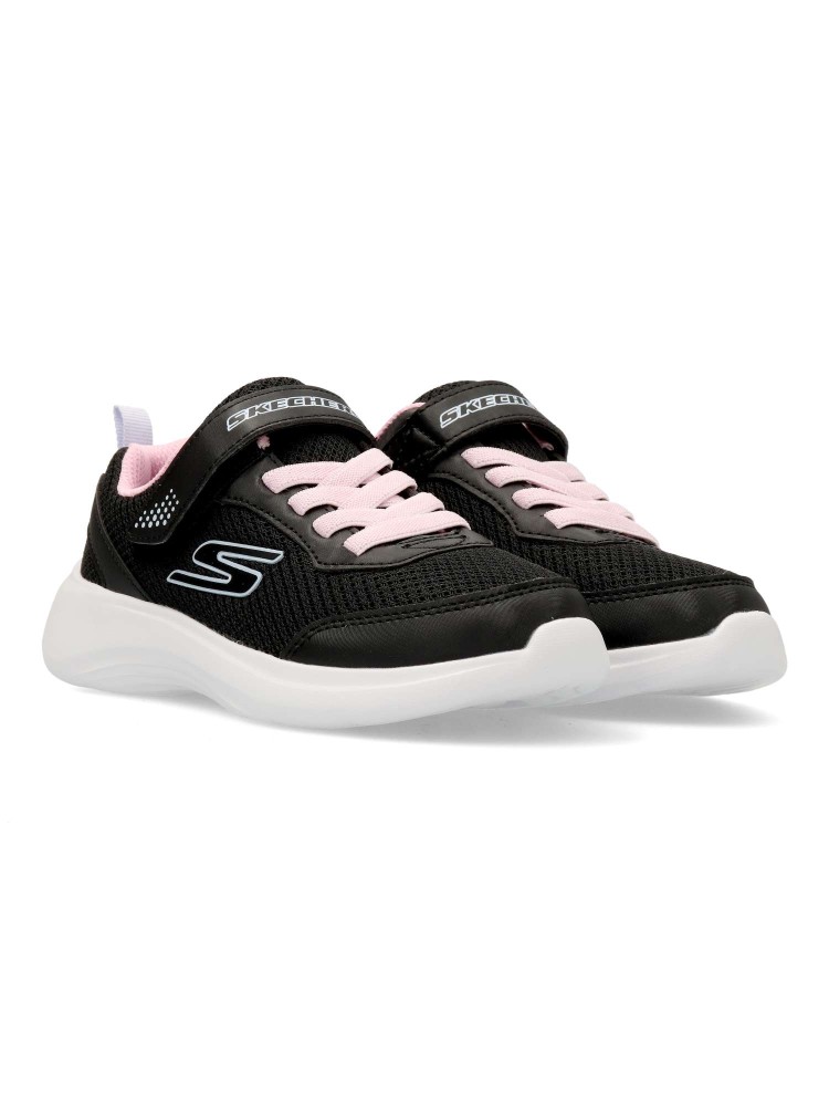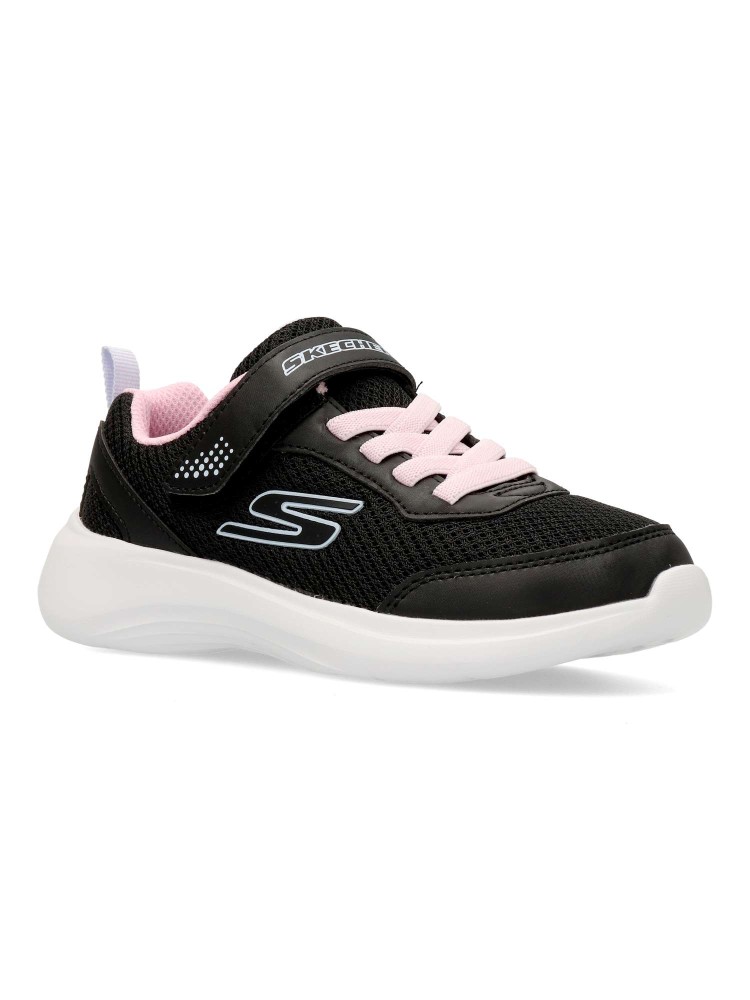 Este modelo ligero Skechers Fun Fit® cuenta con una parte superior de malla y tejido sintético con cordones elásticos, una correa ajustable en el empeine y una cómoda plantilla con amortiguación. Diseño práctico y cómodo para todo el día.