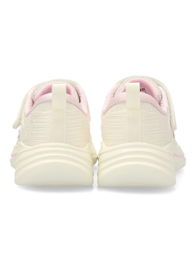 Zapatilla deportiva de niña, con una parte superior de malla brillante con cordones elásticos, un cierre de tira ajustable en el empeine y una cómoda plantilla con amortiguación. Suela flexible con tracción. Labable a maquina.