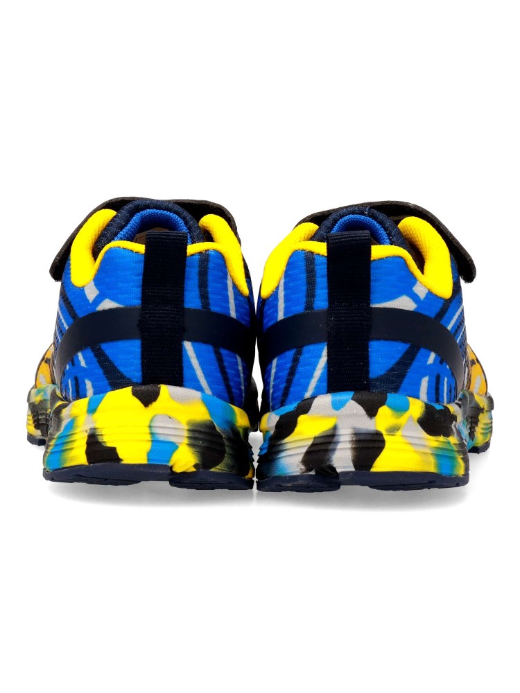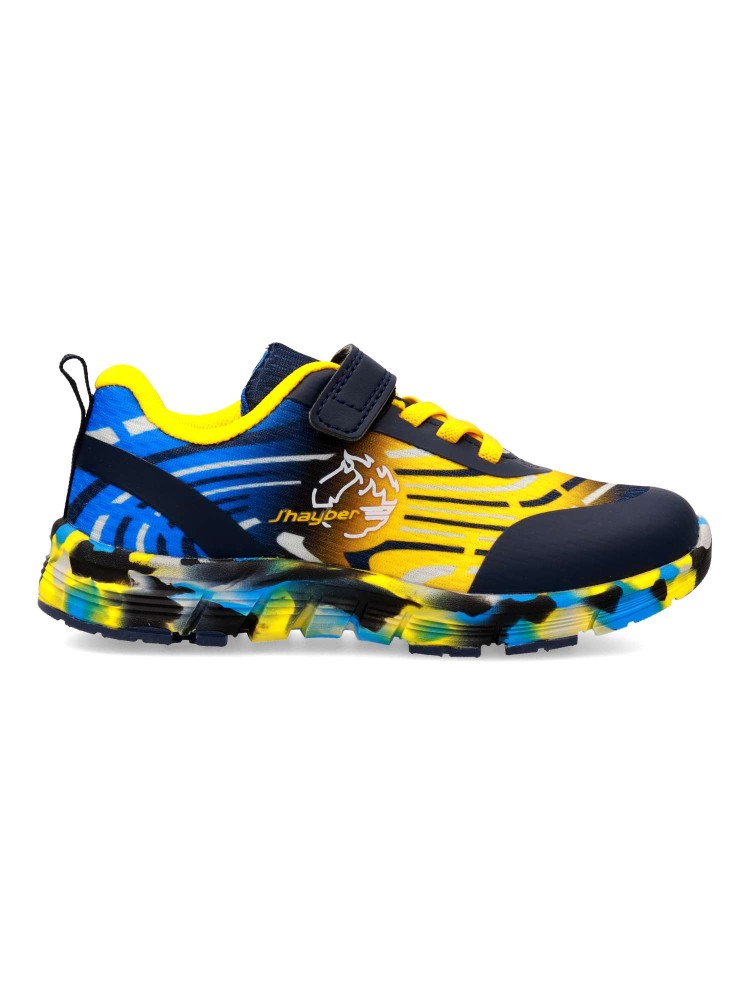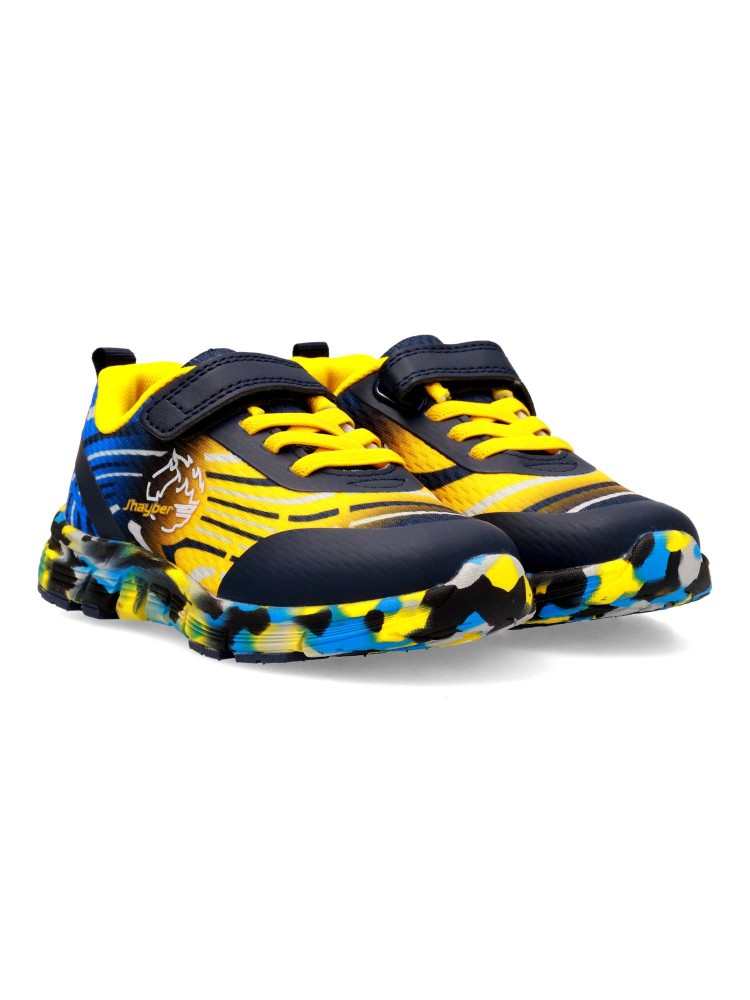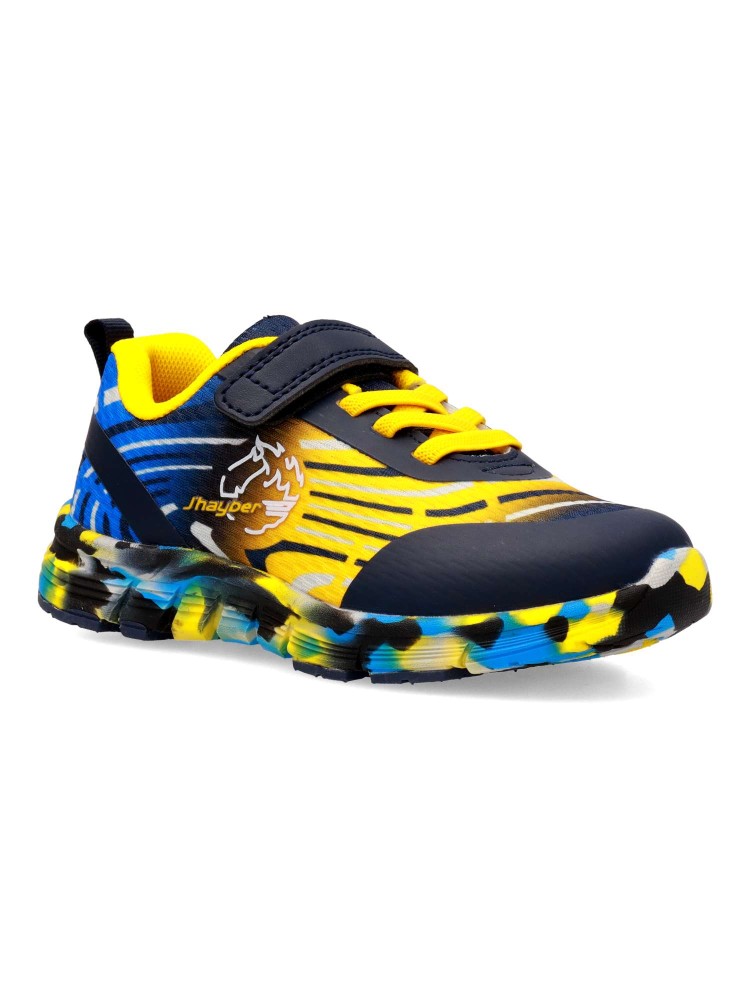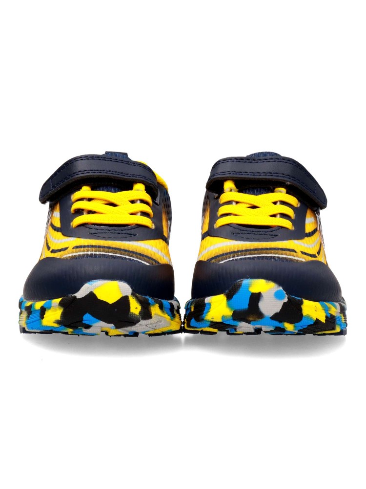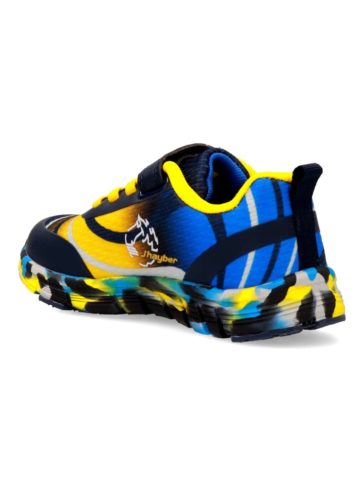 Deportiva de niño, tipo running. Cierre adherente y cordones elásticos. Fabricado en material sintético y textil, con suela de goma. Color marino. Diseño versátil, ligero, flexible y transpirable, con el que los peques no pararán de jugar.