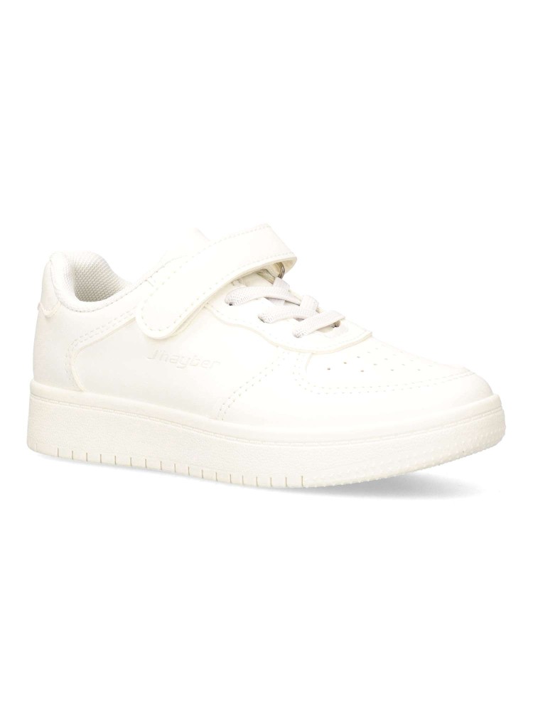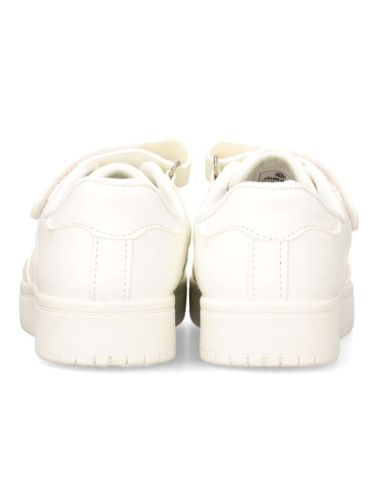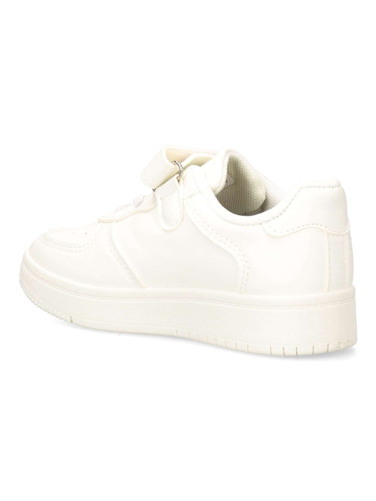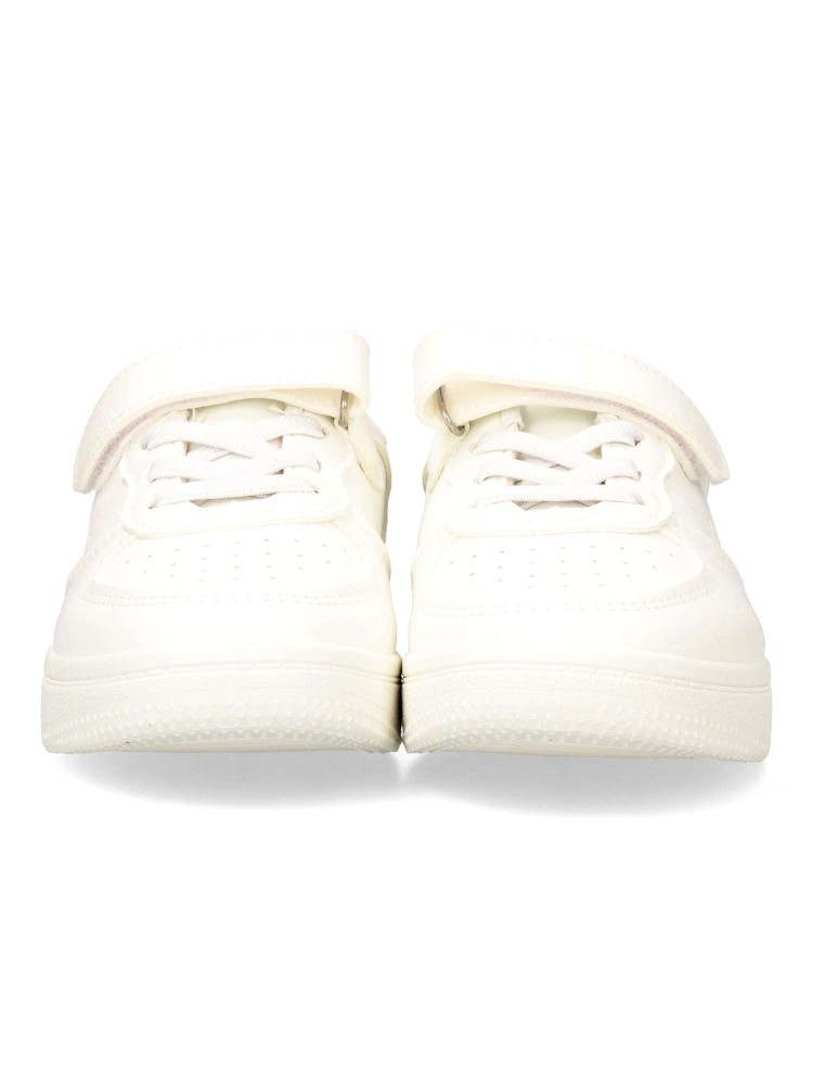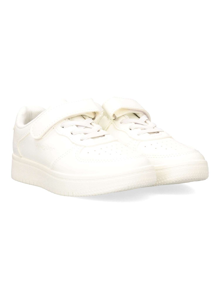 Zapatillas clásicas para niños en color blanco. Son perfectas para el uso diario gracias a su diseño cómodo y funcional. Cierre adherente y cordones elásticos que facilitan el ajuste y la autonomía. Una opción versátil para el día a día de los peques.