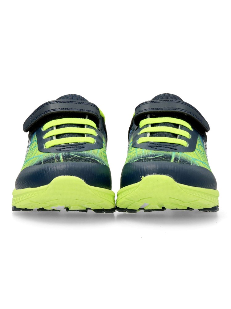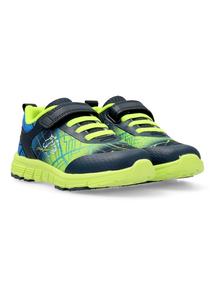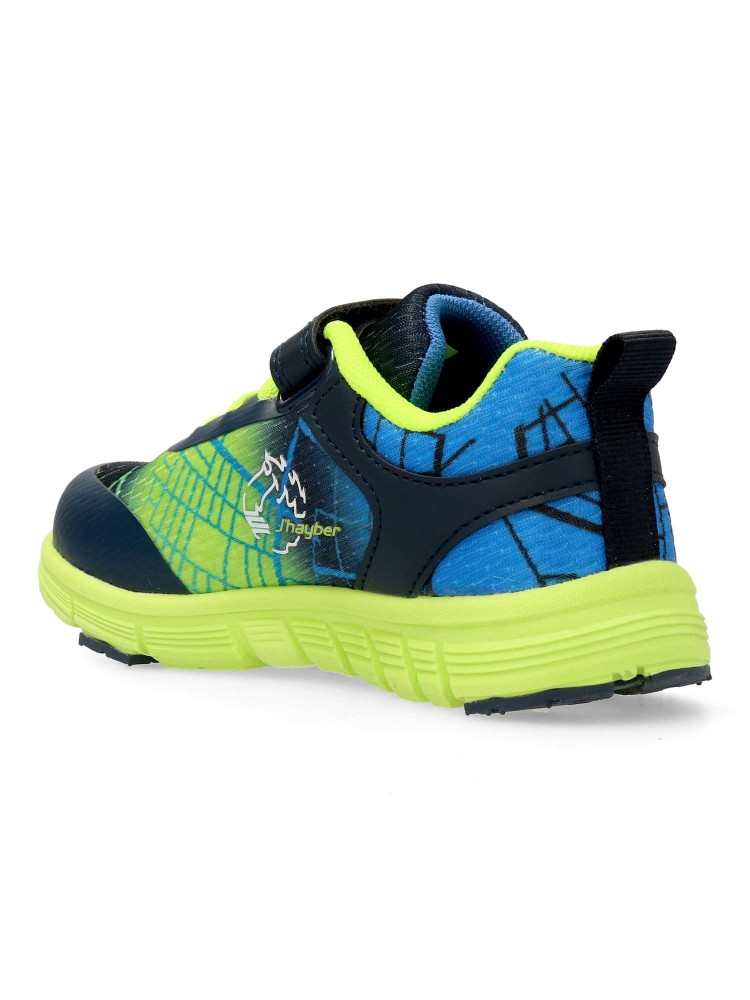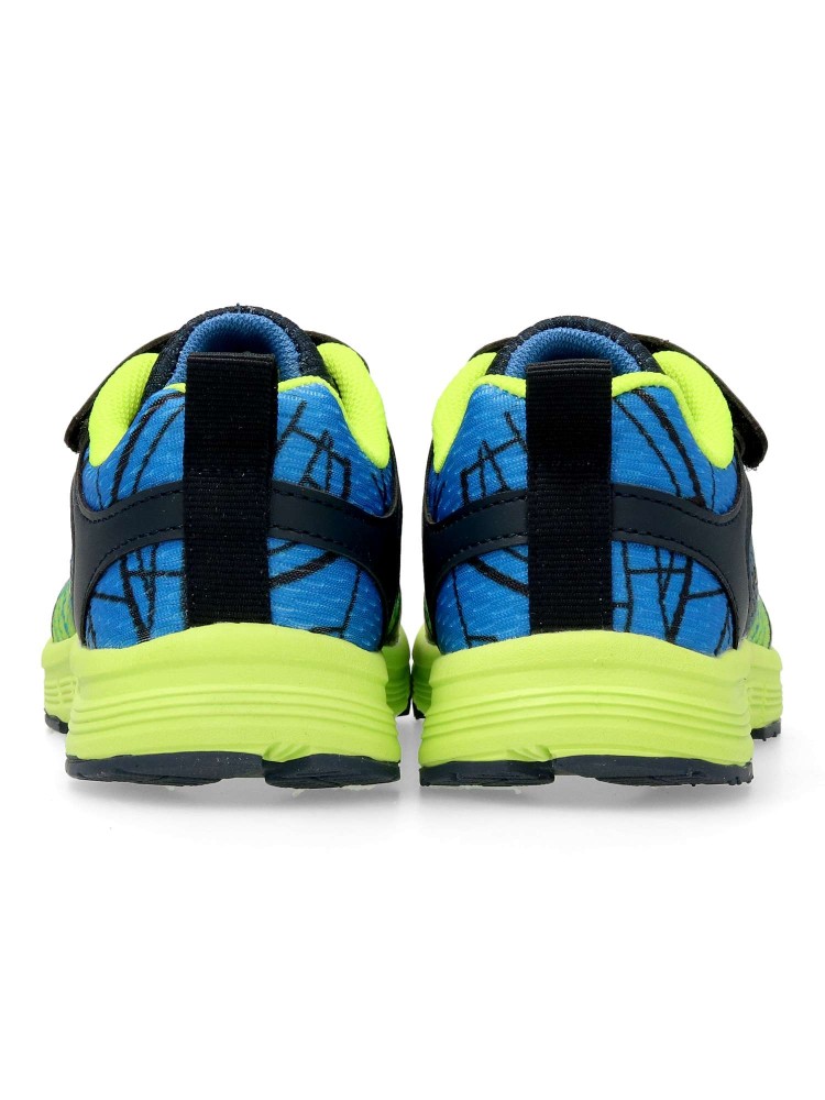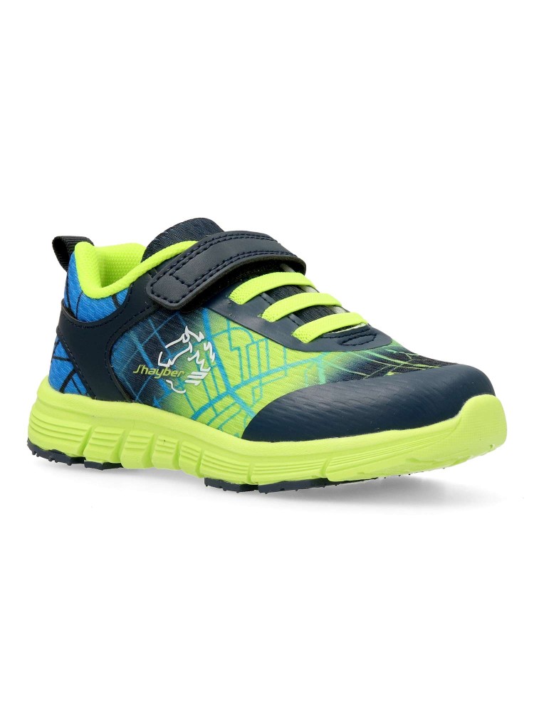 Deportiva de niño, tipo running. Cierre adherente y cordones elásticos. Fabricado en material sintético y textil, con suela de goma. Color marino-fluor. Diseño versátil, ligero, flexible y transpirable, con el que los peques no pararán de jugar.