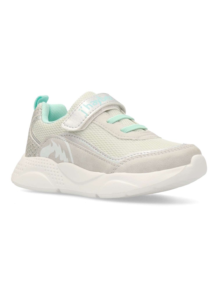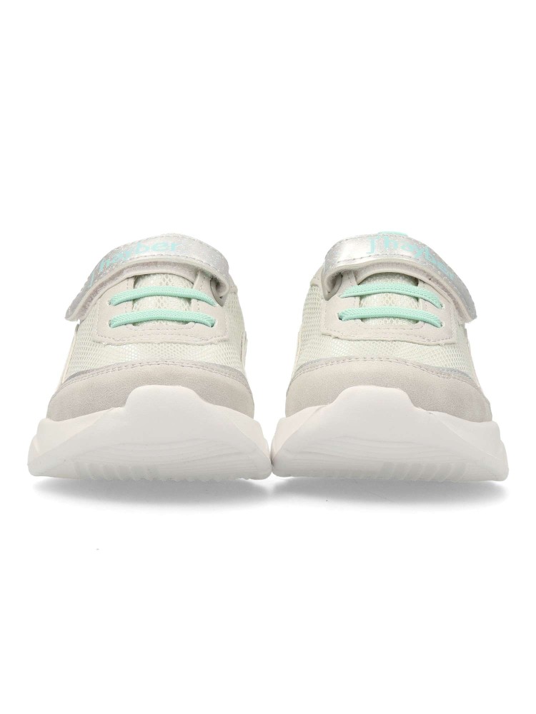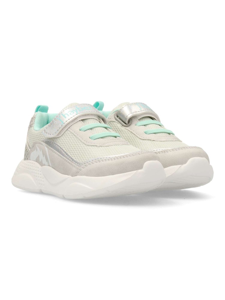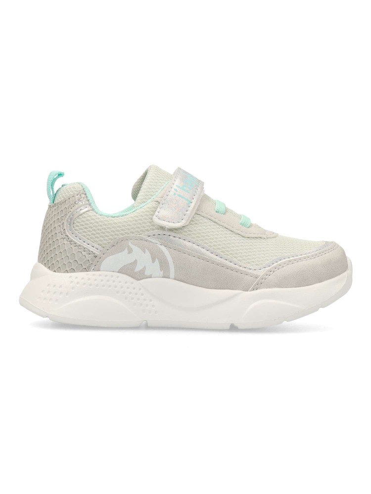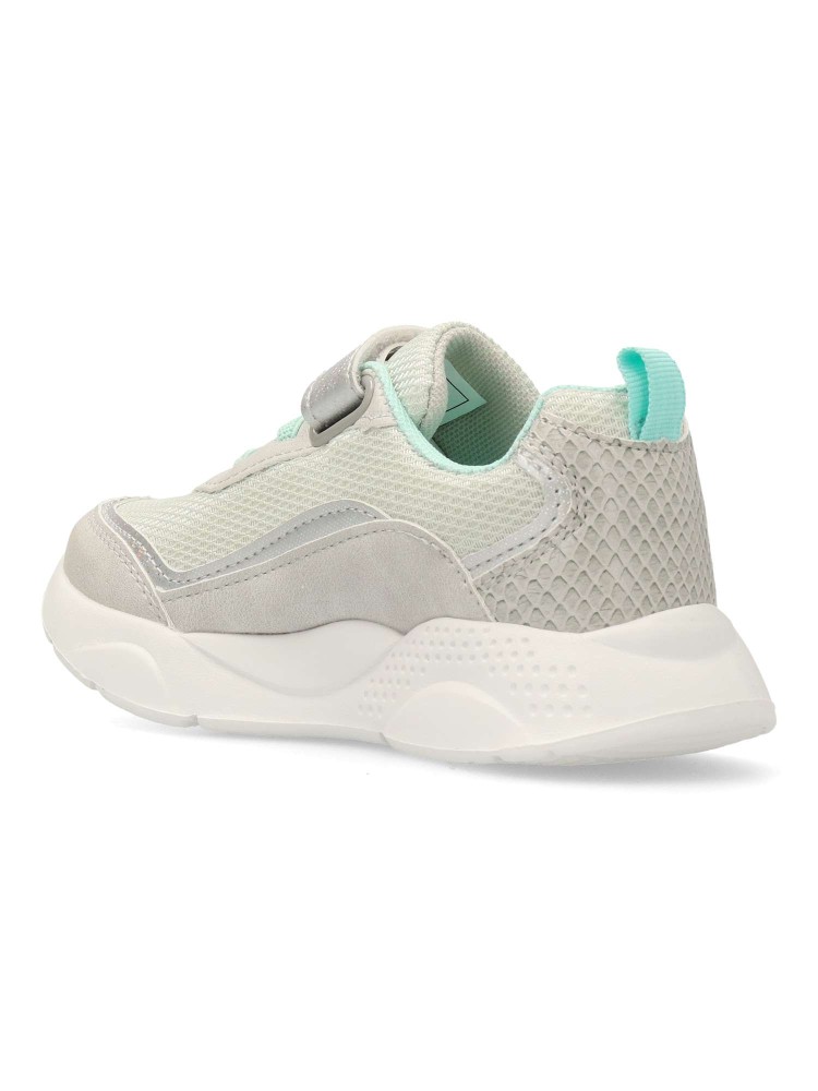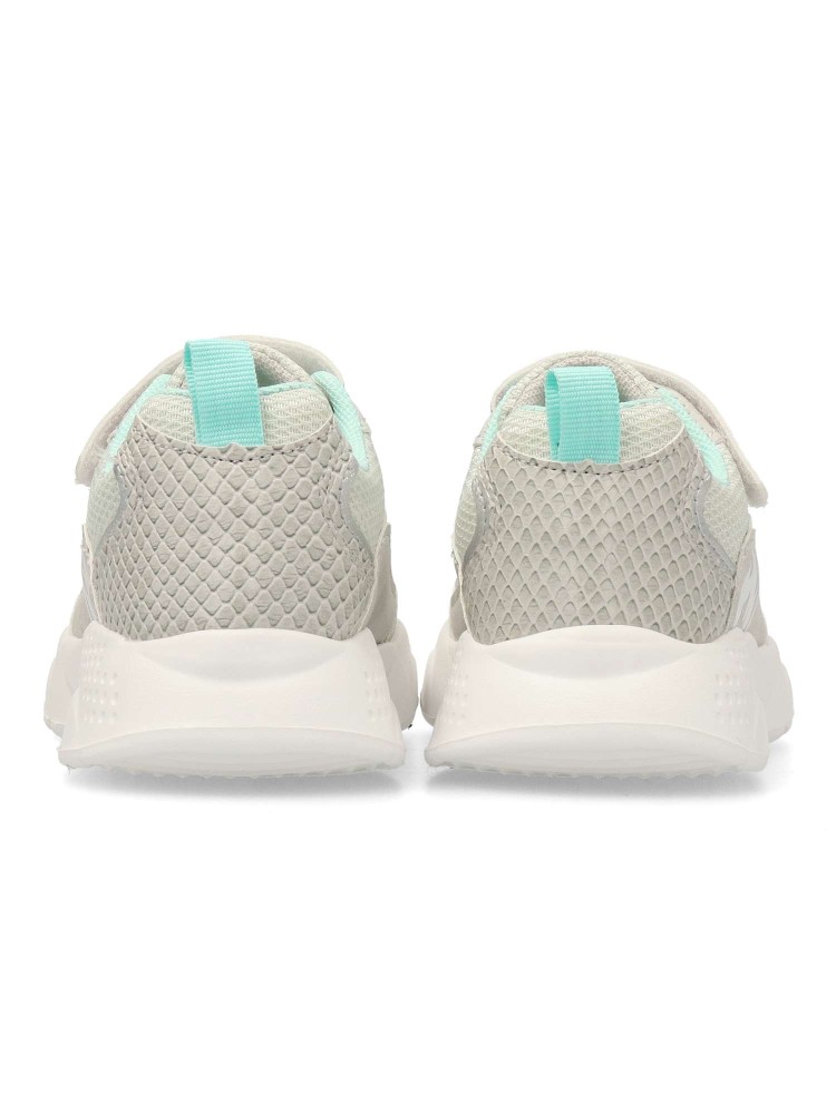 Zapatilla deportiva cómoda de niña. Cierre de velcro y cordones elásticos. Fabricado en material sintético y textil, con suela de goma ligera y flexible. Color gris-aguamar. Diseño sport para combinar con la ropa deportiva de los peques.