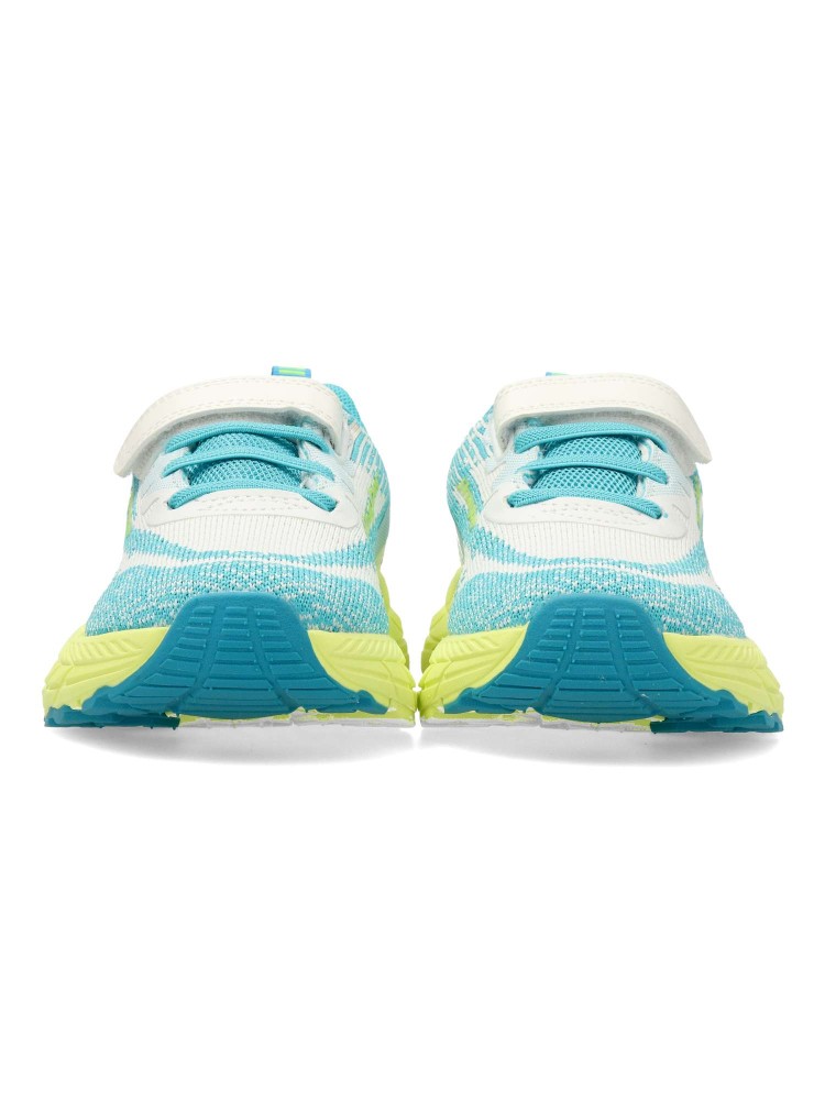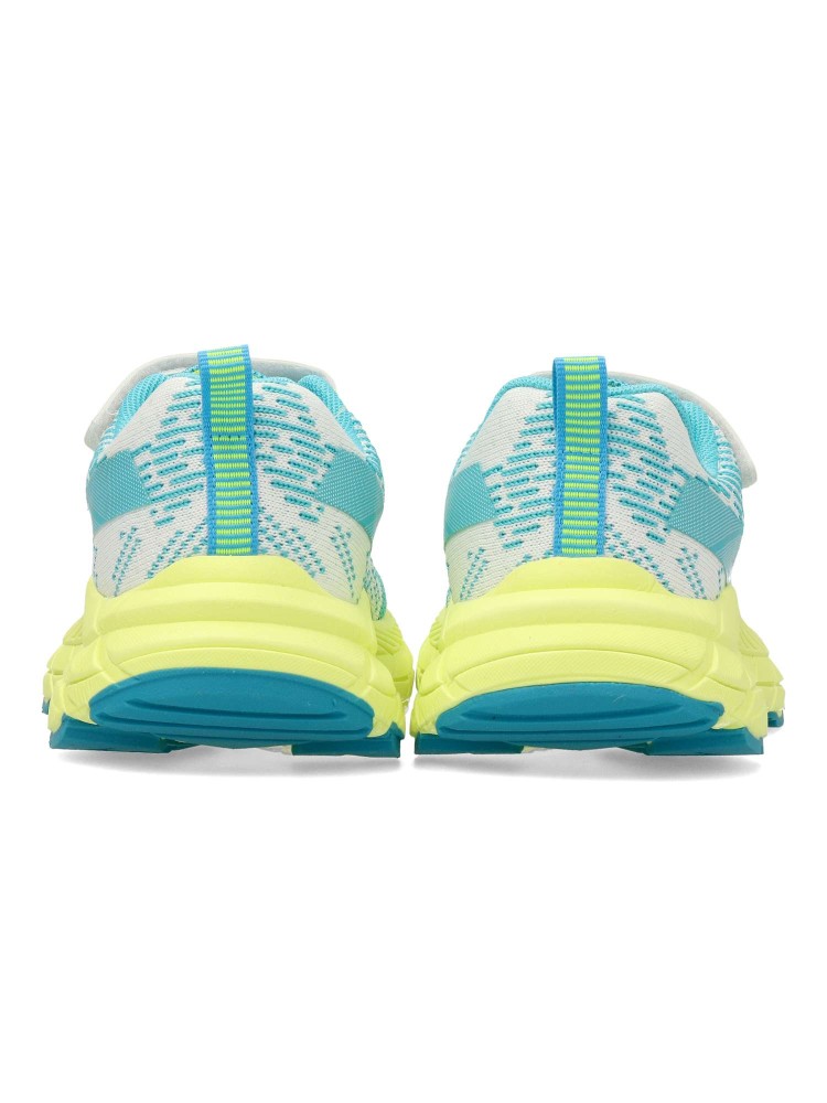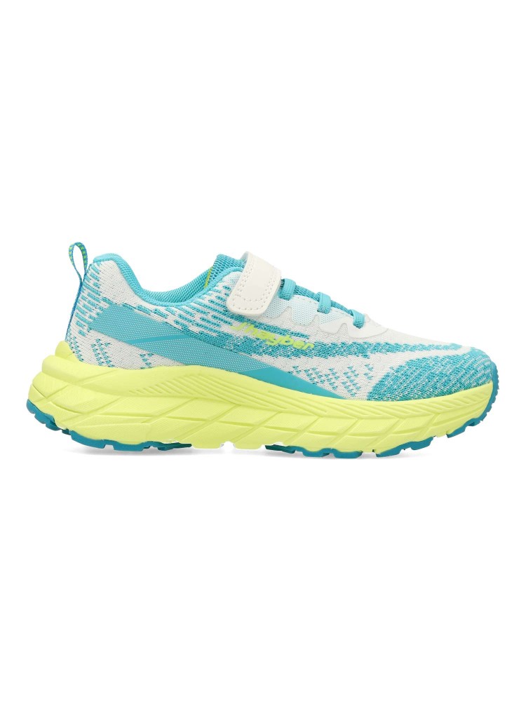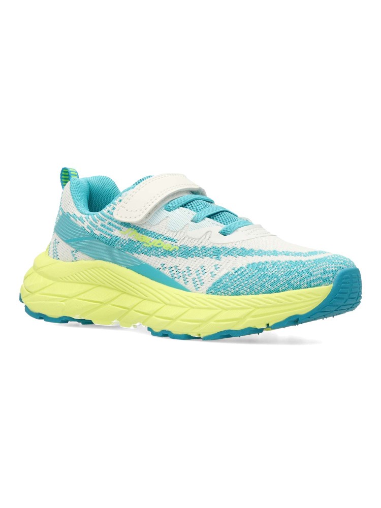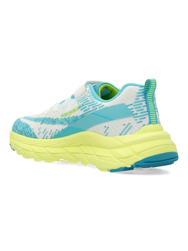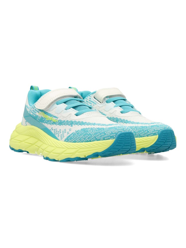 Deportiva fabricada en textil transpirable. Cierre adherente que garantiza un ajuste seguro y práctico para los peques. Diseño en blanco con detalles en turquesa y una llamativa suela color lima. Ideales para el running y actividades al aire libre.