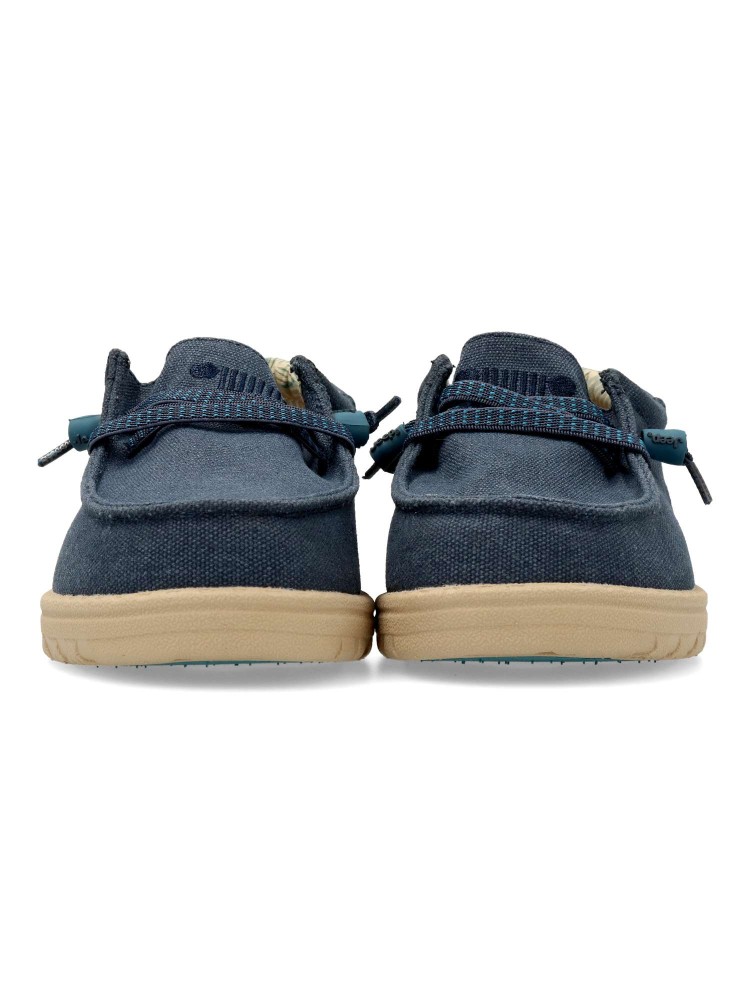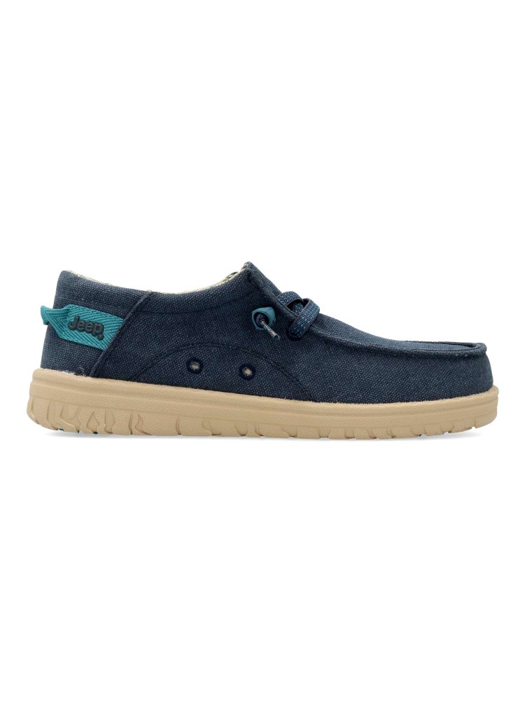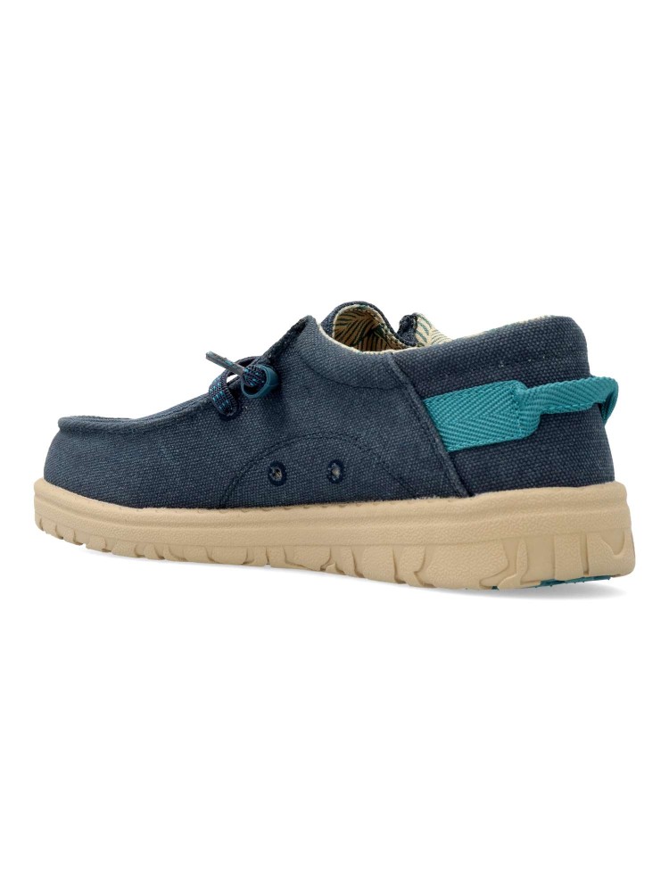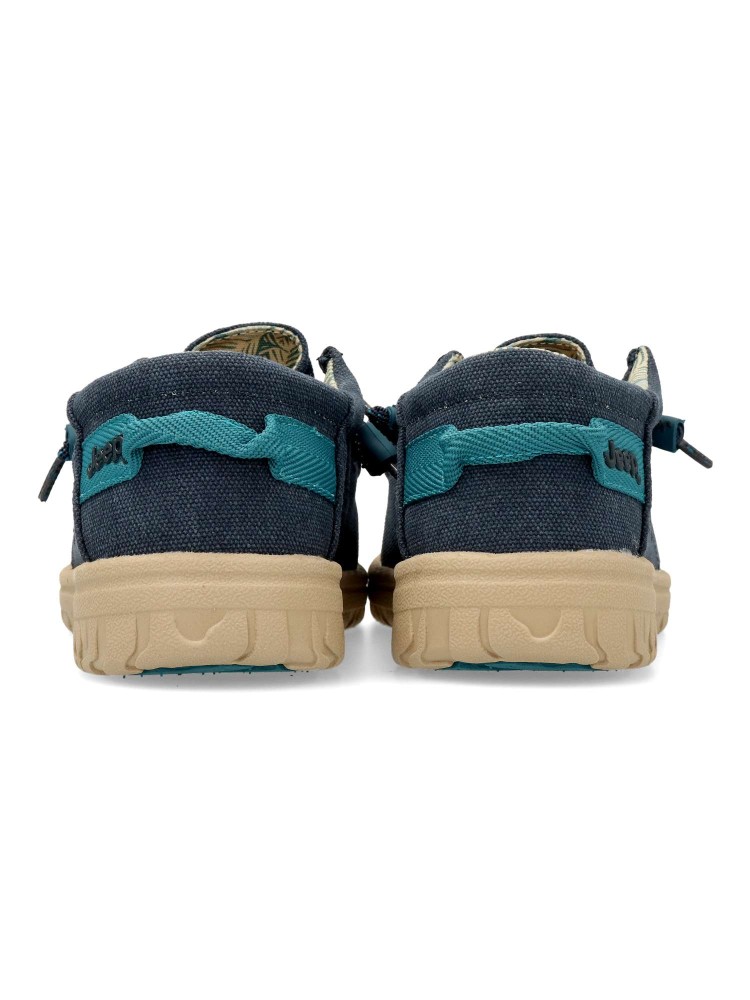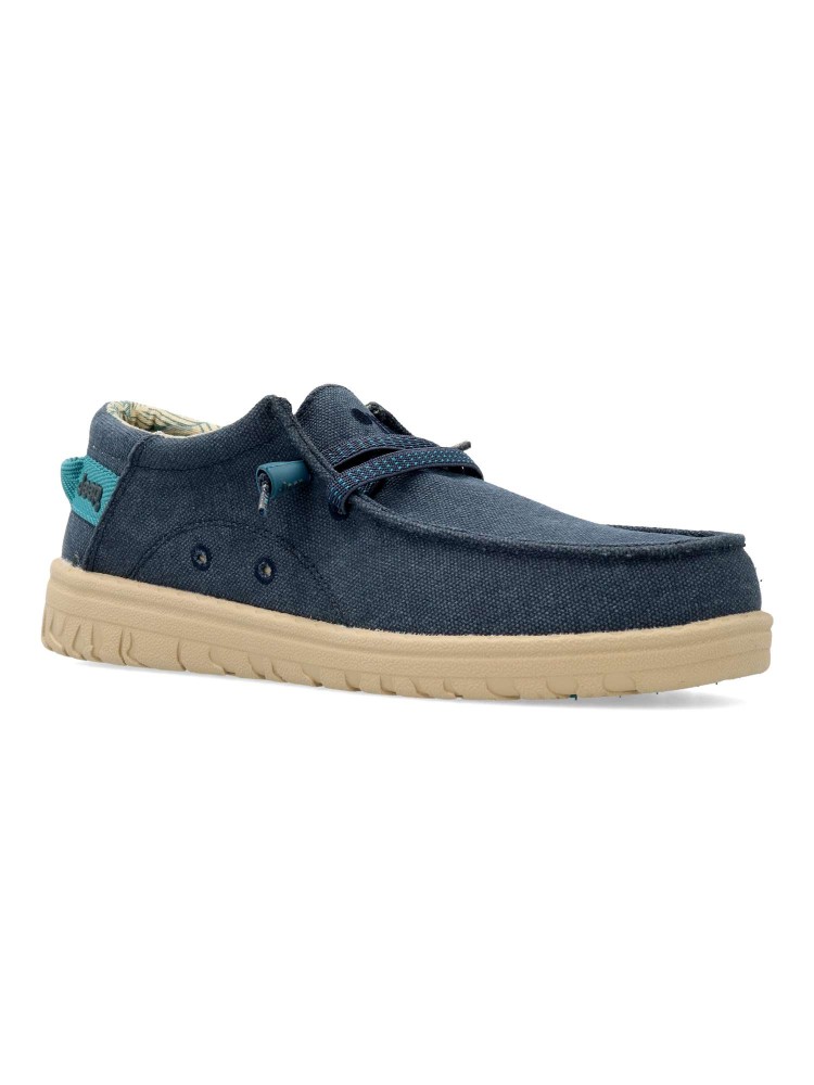 Zapato wallabee de hombre, con cierre de cordón elástico. Mocasín cómodo, fabricado en algodón reciclado. Forro de tela con plantilla de corcho extraíble. Suela de goma. Color marino. Diseño versátil, que sirve tanto en tus looks urbanos, como arreglados.