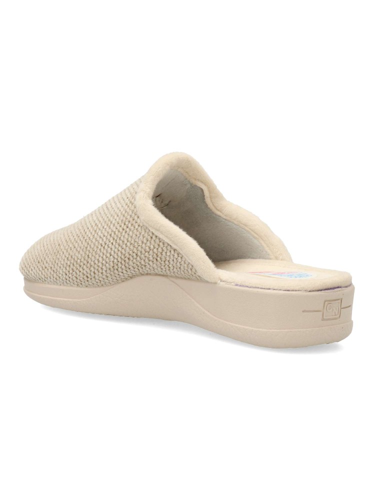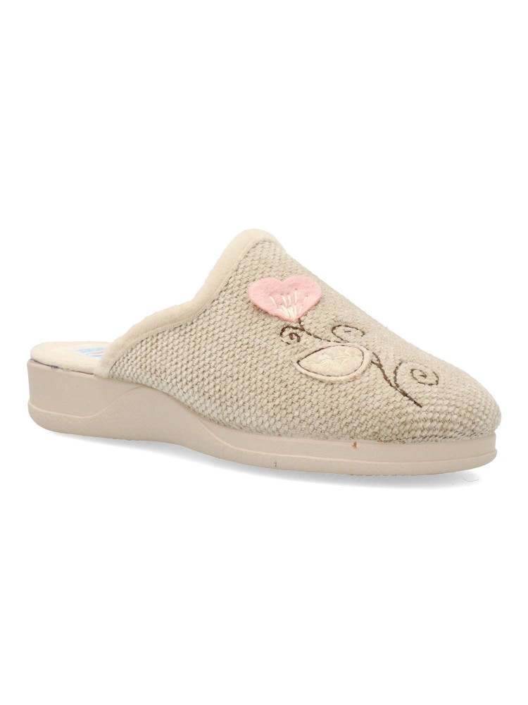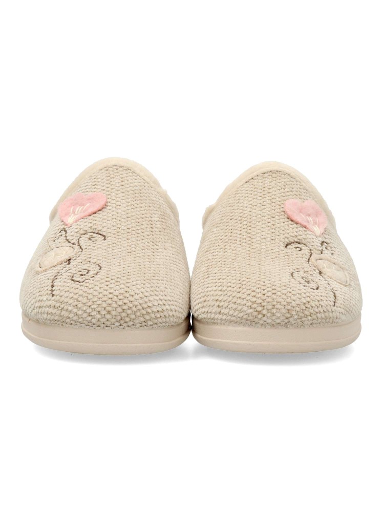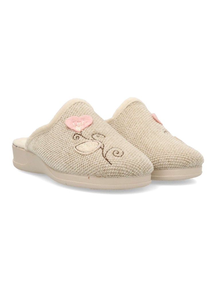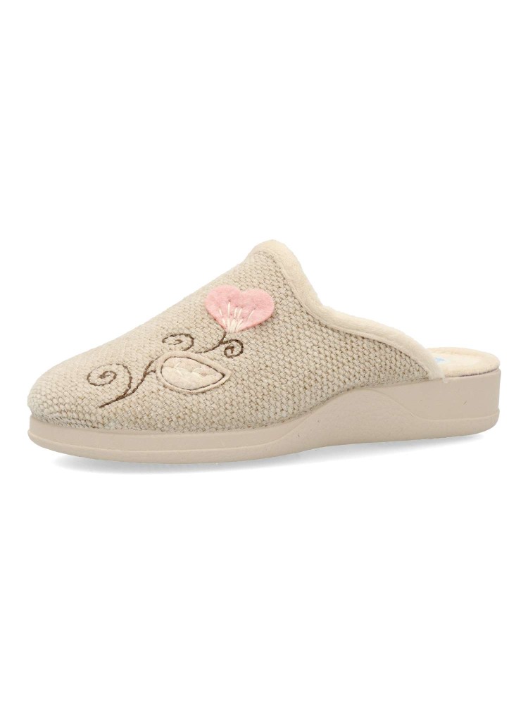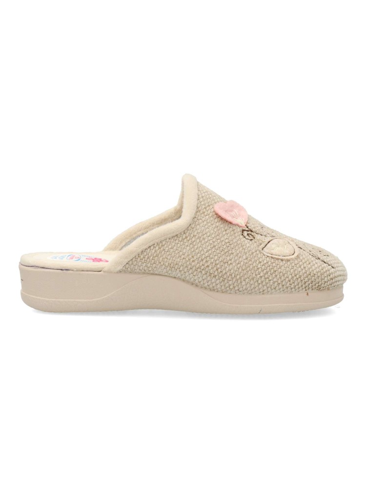 Zapatilla de casa para mujer. Color beige. Fabricada en textil atercipelado, con suela de caucho antideslizante, flexible y ligera. Plantilla acolchada. Altura 3 cm. Zapatilla que te ofrece confort y te abriga en los días más fríos. Hecho en España.