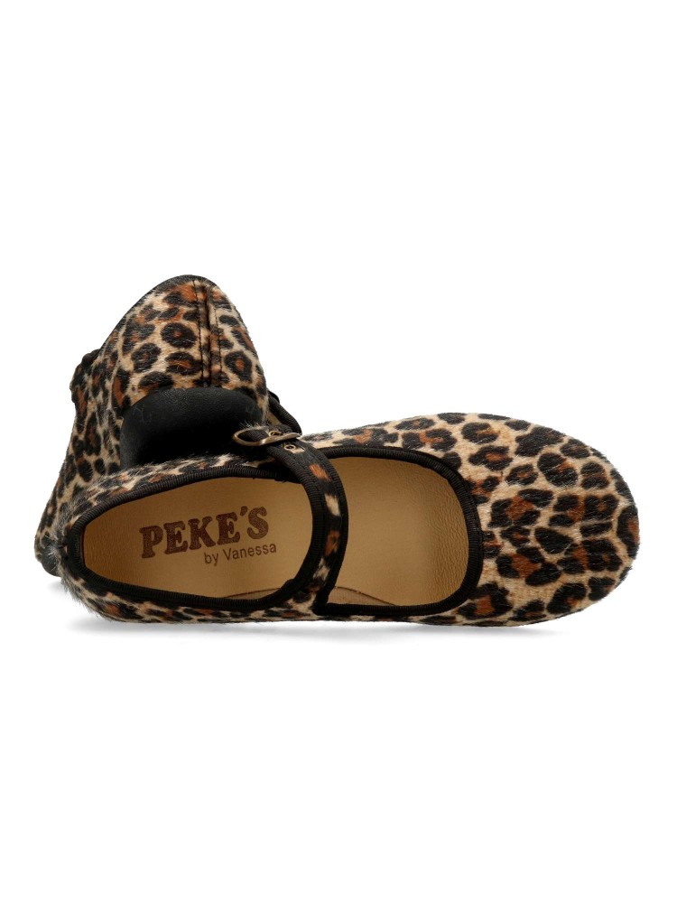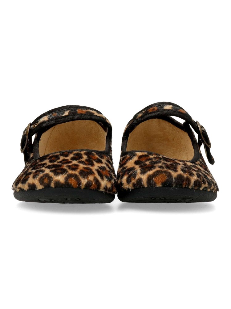 Bailarina salón de niña. Fabricado en material sintético estampado leopardo. Tira al empeine cib cierre de hebilla. Suela de goma ligera, flexible y antideslizante. Mercedita de vestir con diseño original y versátil, fácil de combinar. PEKE´S By Vanessa.