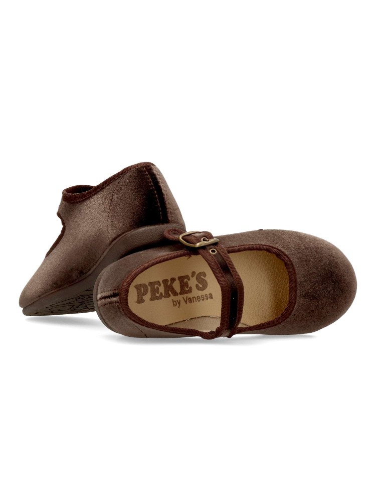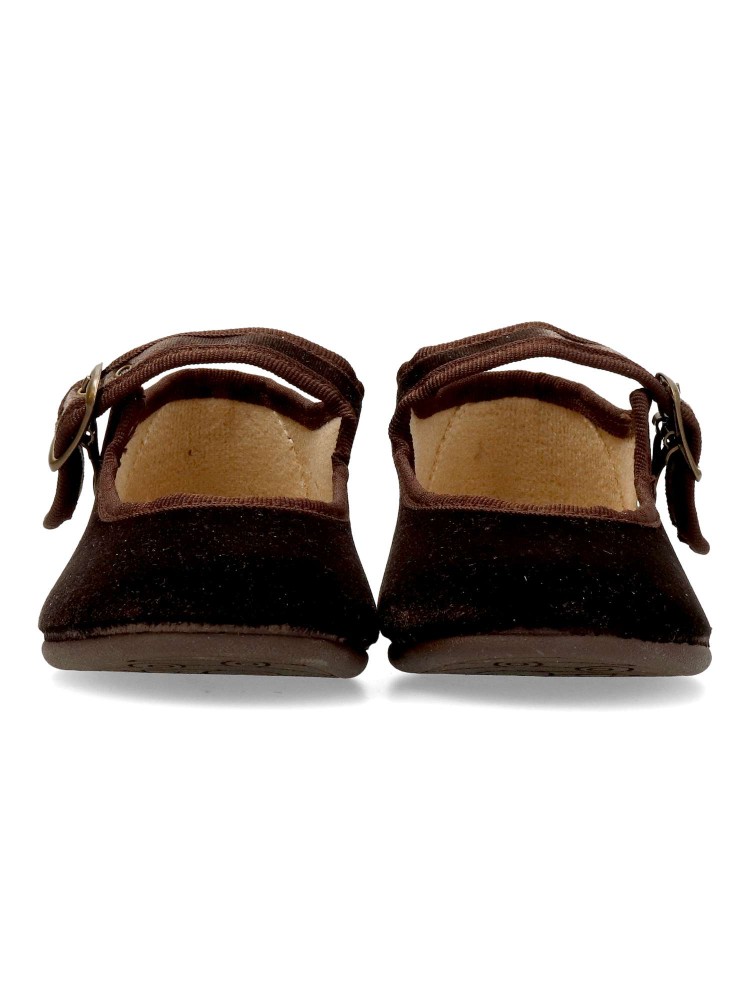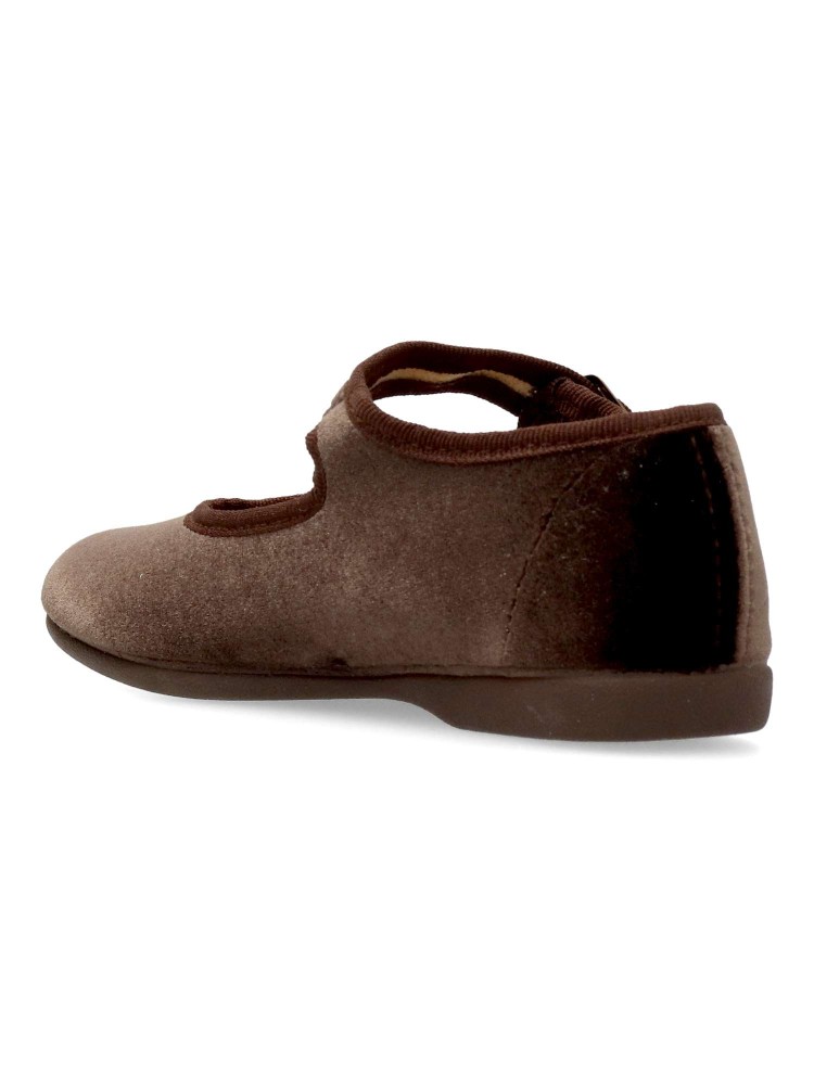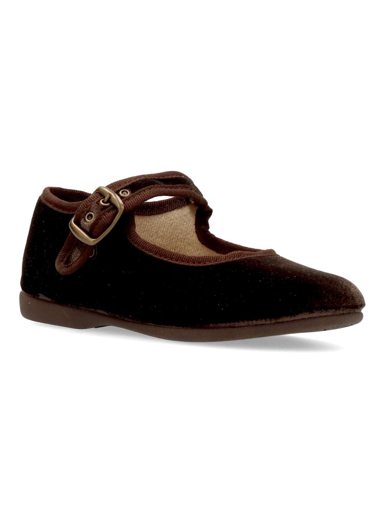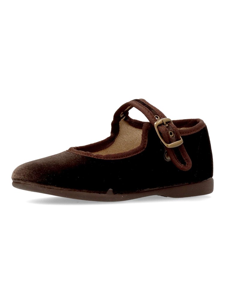 Zapato mercedita de niña, con cierre de hebilla. Modelo cómodo, fabricado en terciopelo color marrón, con suela de goma ligera, flexible y antideslizante. Un zapato de vestir ideales tanto para eventos formales, como para tu día a día.