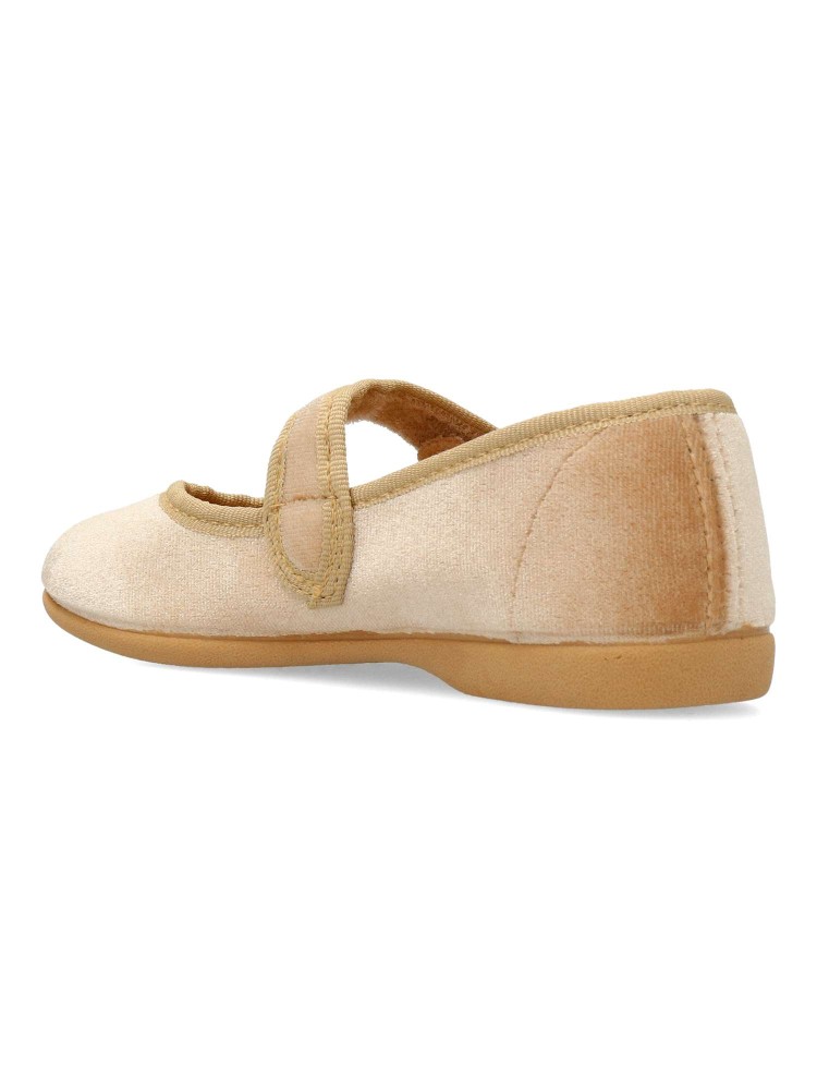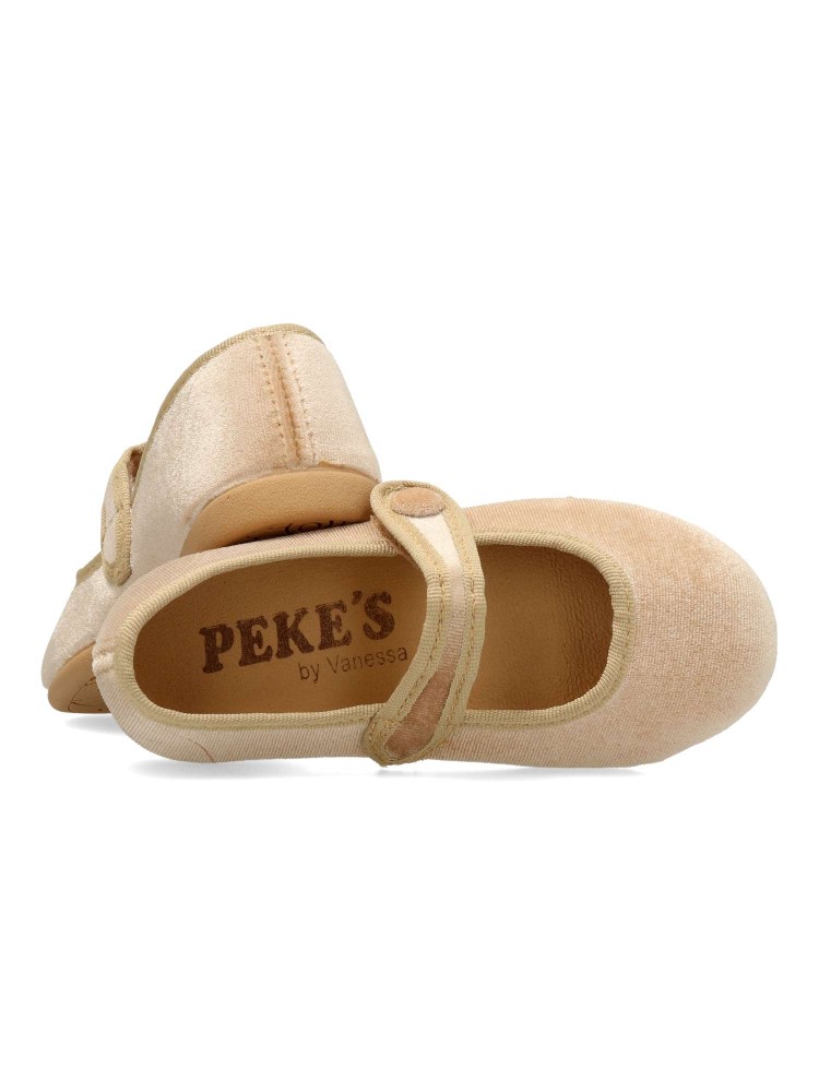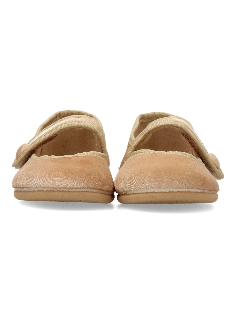 Zapatilla mercedita de niña, con cierre adherente. Modelo cómodo, fabricado en terciopelo color camel, con suela de goma ligera, flexible y antideslizante. Un zapato de vestir ideales tanto para eventos formales, como para tu día a día.