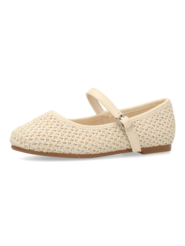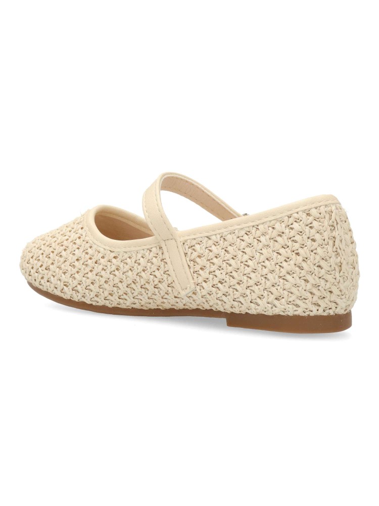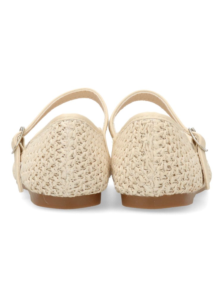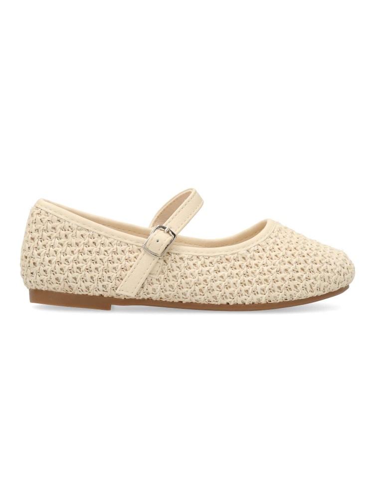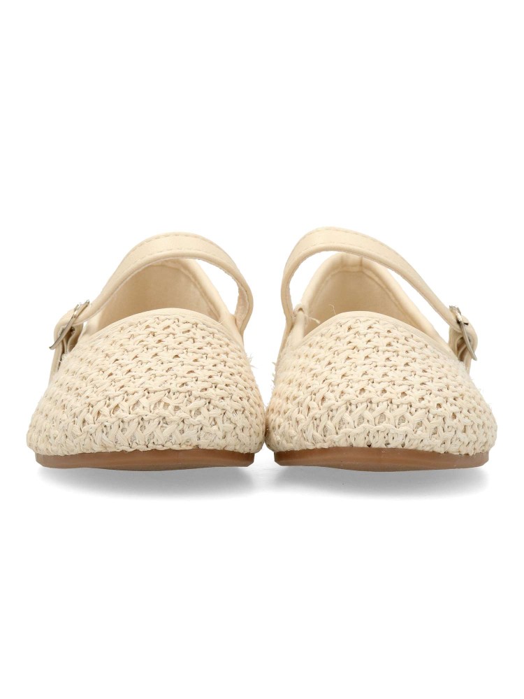 Zapato bailarina de niña, con tira al empeine y cierre de hebilla. Modelo cómodo, fabricado en rafia color beige, con suela de goma. Plantilla acolchada. Diseño cómodo y elegante, ideal para conjuntarlas con ropa arreglada y en tu día a día.