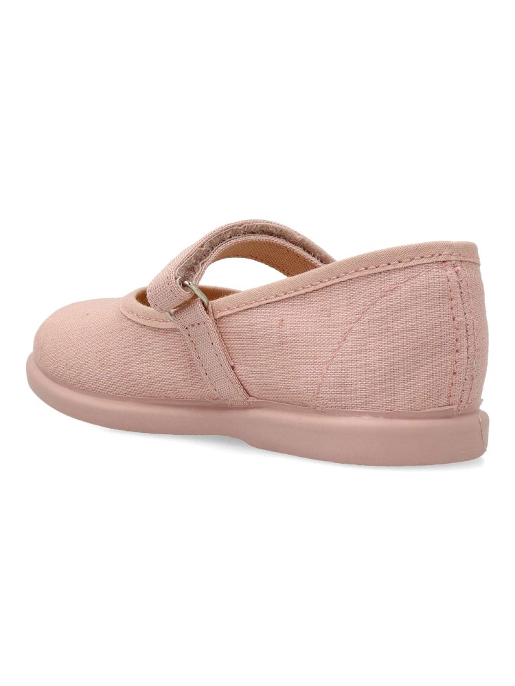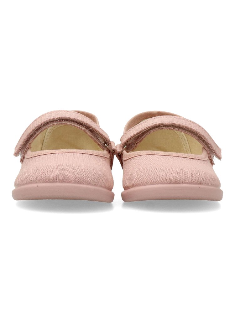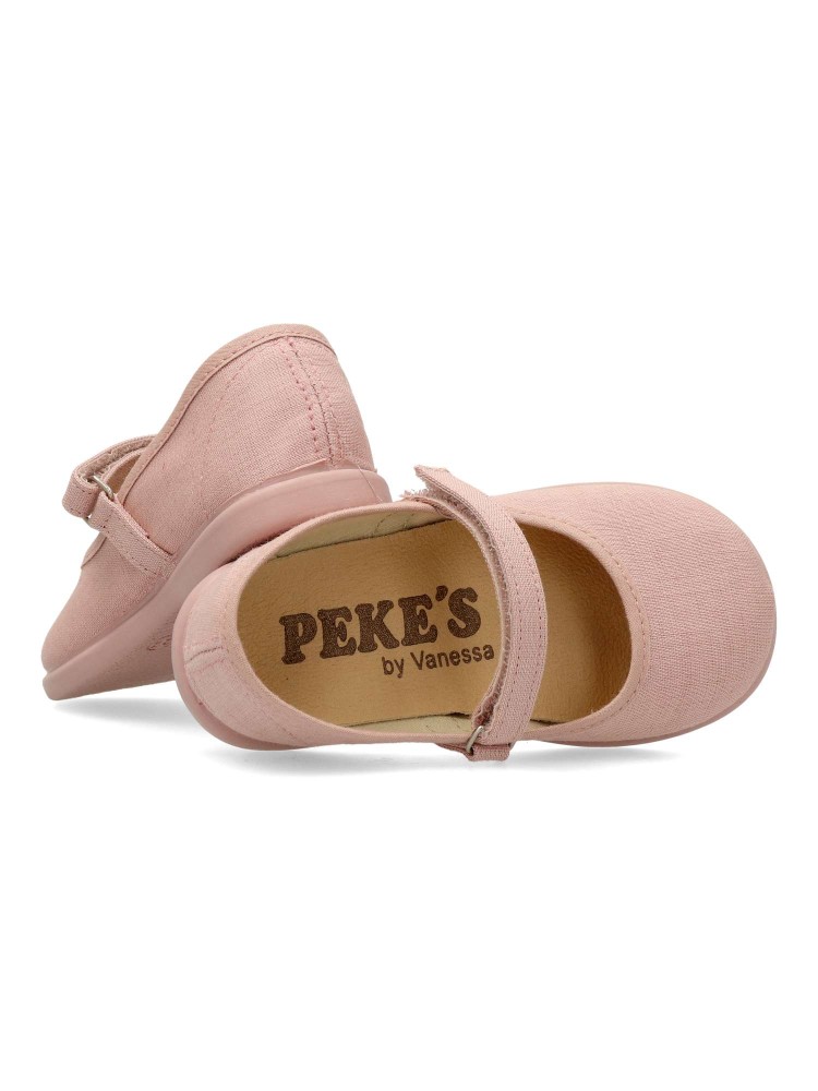 Zapato bailarina de lona para niña. Mercedita con tira al empeine y cierre de adherente. Disponible en color nude. Fabricado en textil con suela de goma flexible y antideslizante. Diseño y confort para los peques. PEKE´S By Vanessa. Hecho en España.