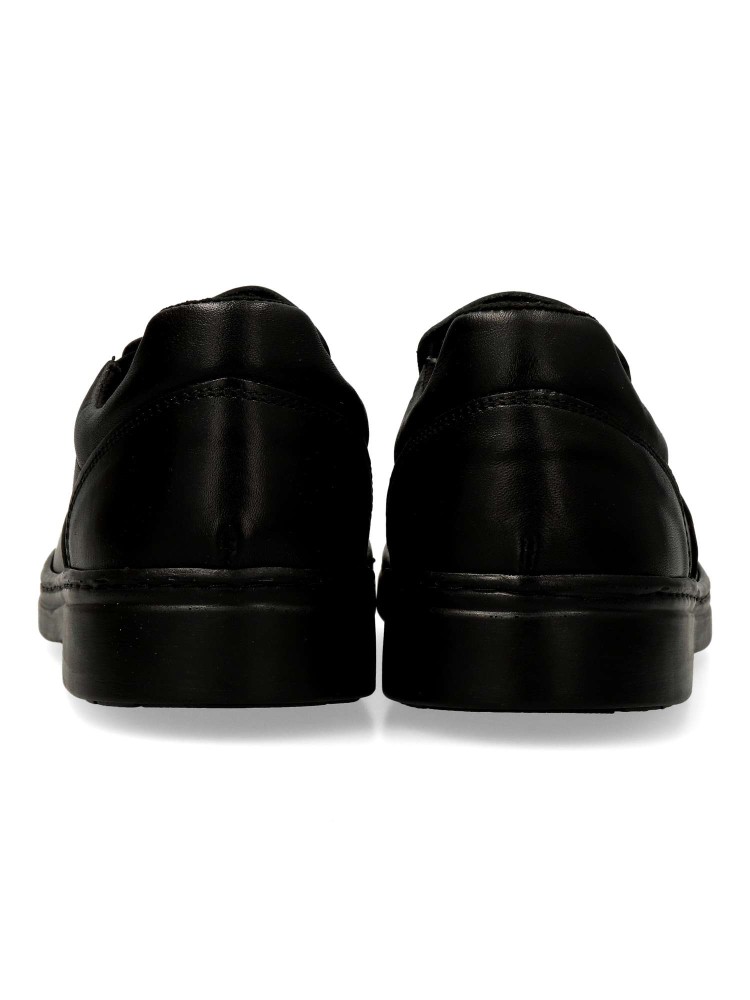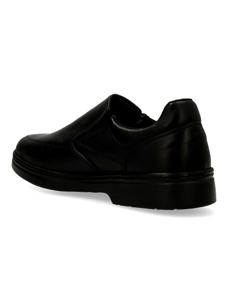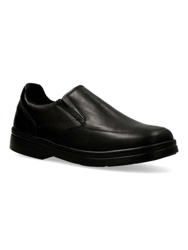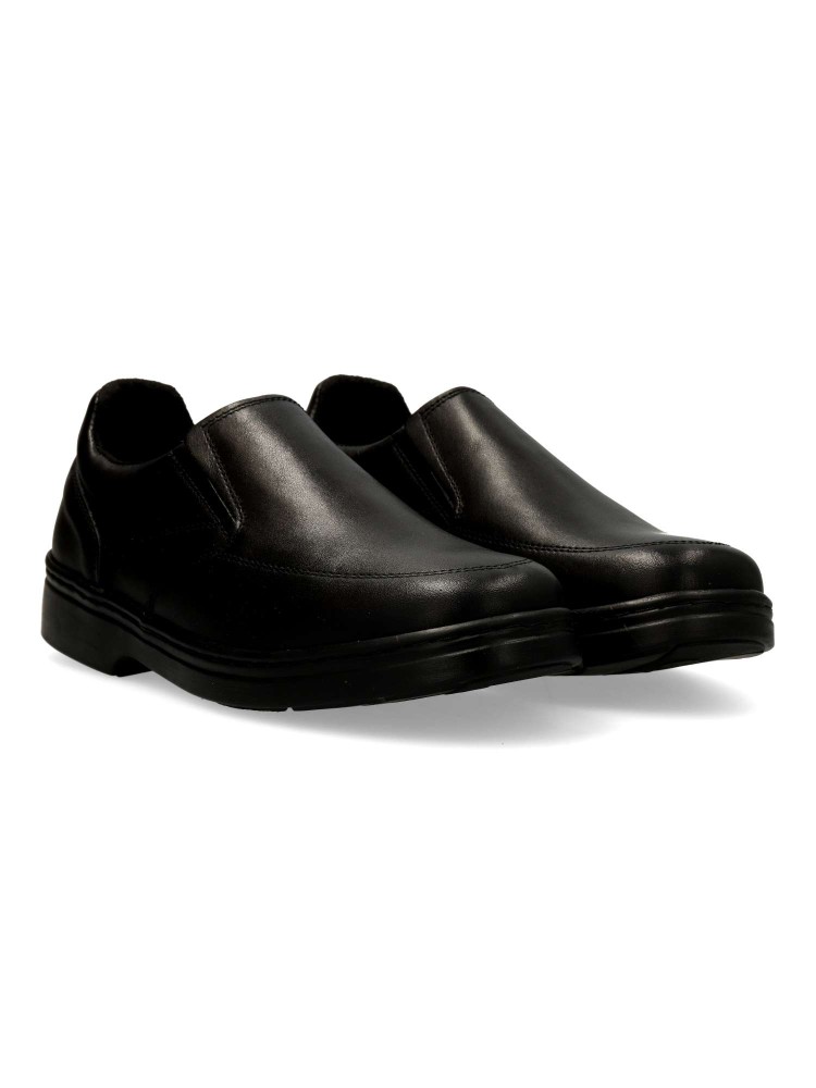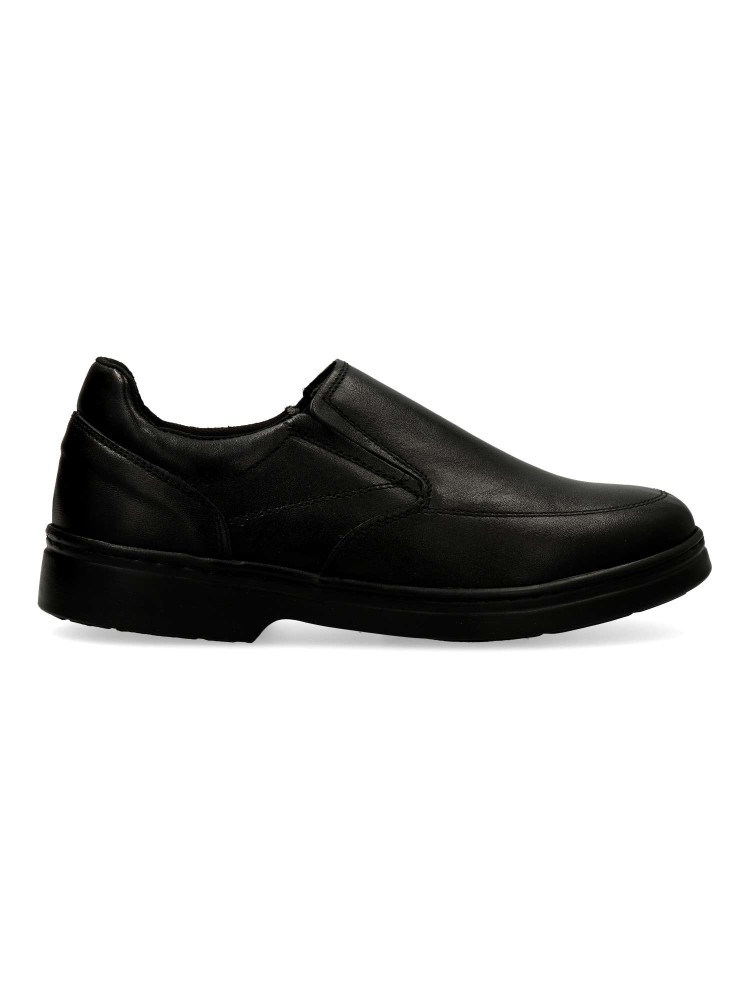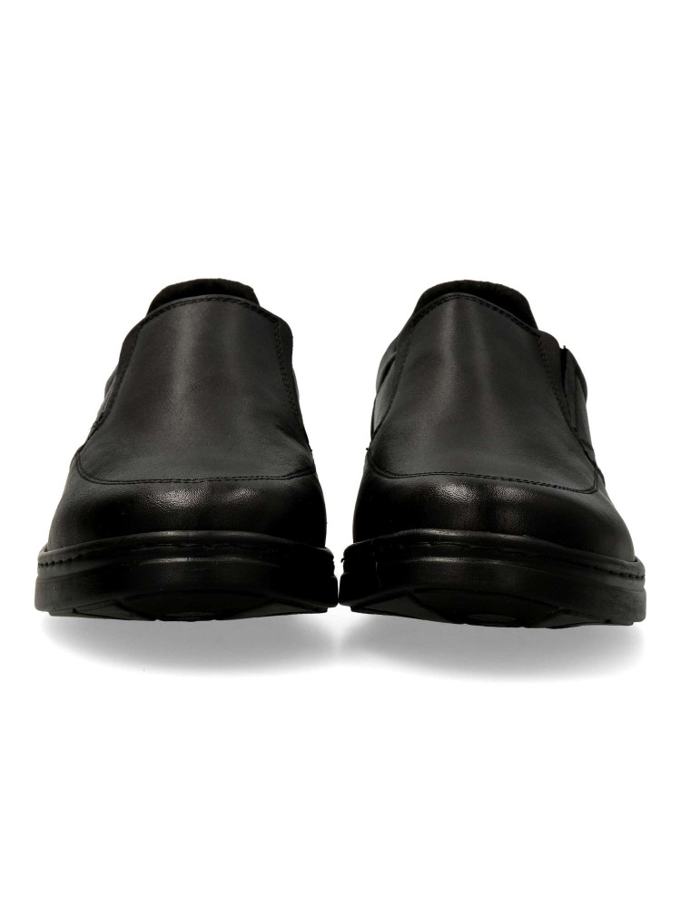 Zapato cómodo de hombre. Modelo tipo mocasín, con elásticos en los laterales. Fabricado en piel con suela de goma flexible y ligera. Plantilla acolchada y extraíble. Color negro. Ideal tanto para tu día a día, como para uso profesional.