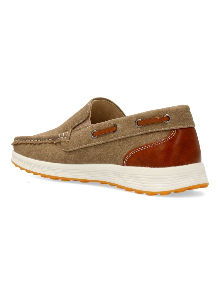 Zapato mocasín de hombre, con elásticos en laterales para mejor calce. Modelo cómodo, fabricado en material sintético, con suela de goma ligera y flexible. Disponible en color kaki-marrón. Zapato de vestir ideal en tu día a día.