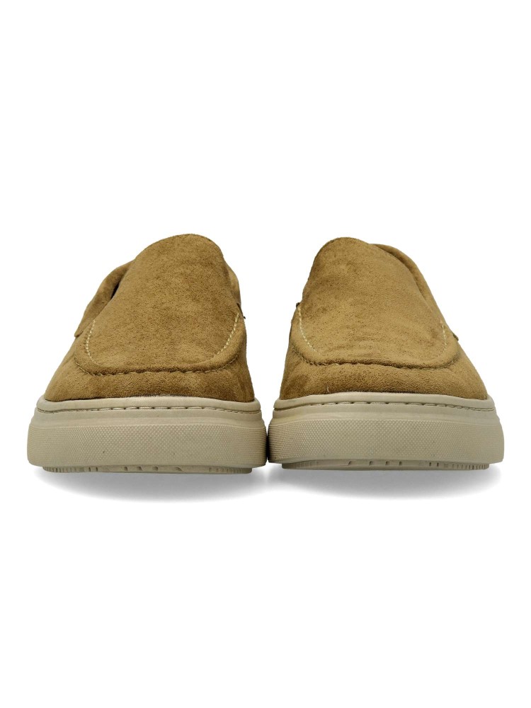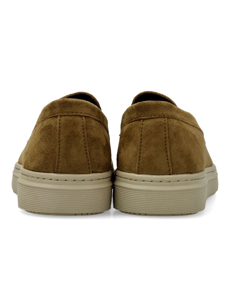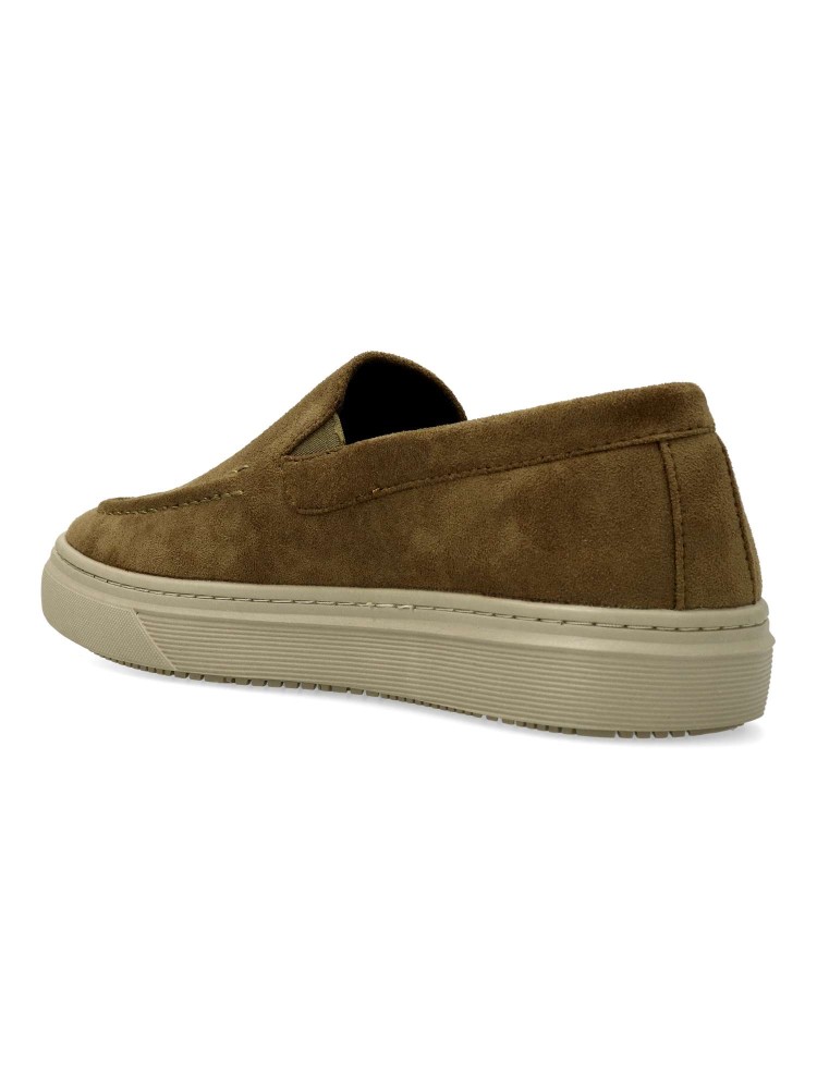 Mocasín de hombre, estilo casual. Elásticos en los laterales para mejor calce. Modelo cómodo, fabricado en antelina, con suela de goma ligera y flexible. Plantilla acolchada y extraíble. Color kaki. Zapato mocasín informal. Confort para tu día a día.
