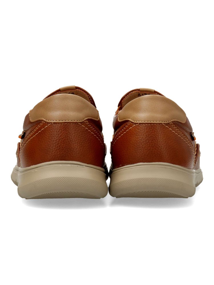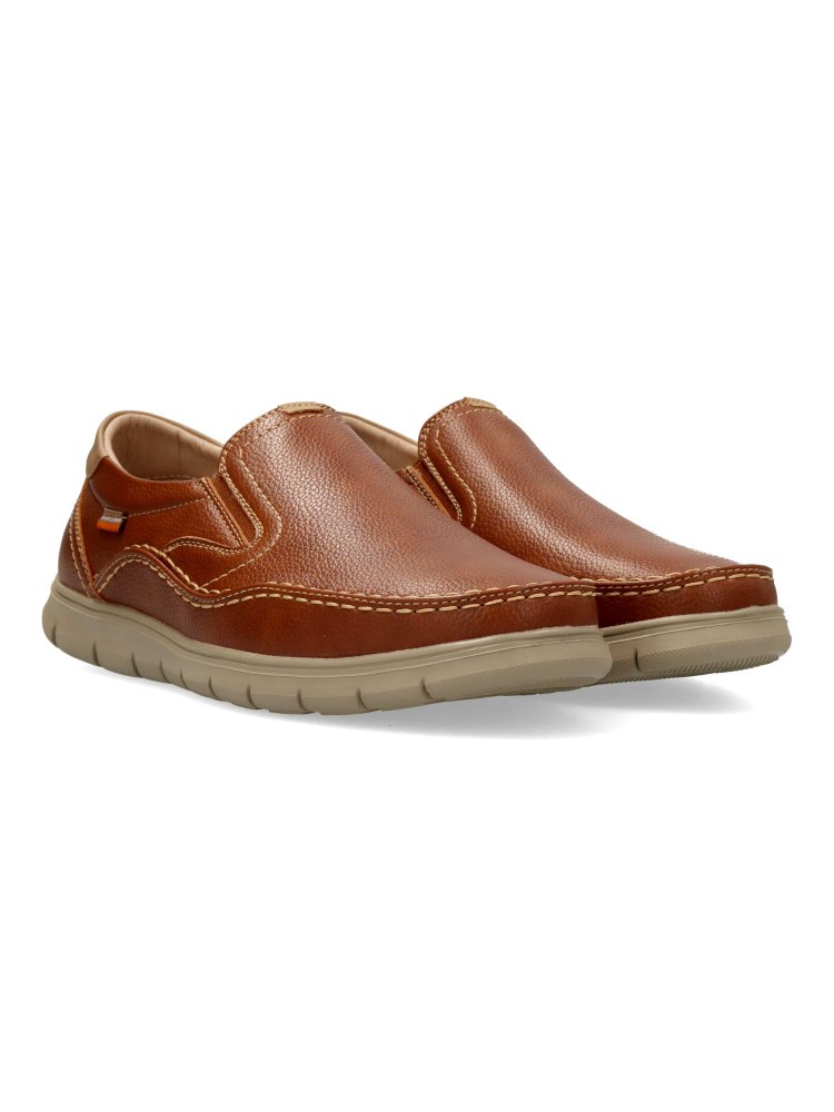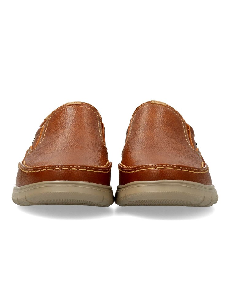 Zapato mocasín de hombre, estilo casual. Elásticos en los laterales. Modelo cómodo, fabricado en piel sintética, con suela de goma ligera y flexible. Plantilla de piel acolchada y extraíble. Color cuero. Zapato mocasín informal. Confort para tu día a día.
