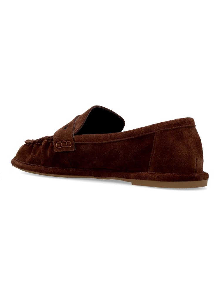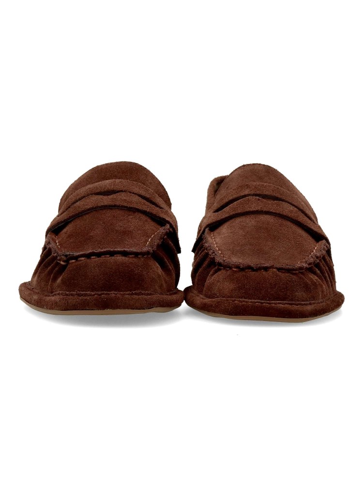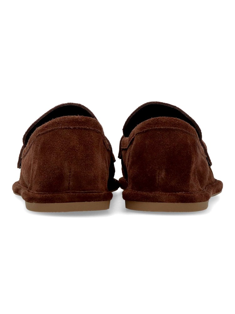 Zapato mocasín plano de mujer. Fabricado en piel serraje, con suela de goma flexible. Forro interior y plantilla acolchada de piel. Color moka. Detalle antifaz al empeine. Un clásico que ofrece el máximo confort para tu día a día.