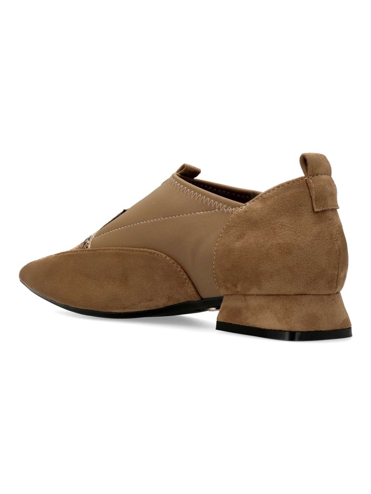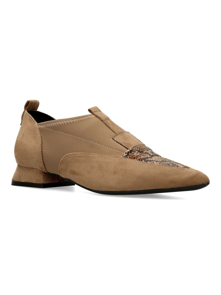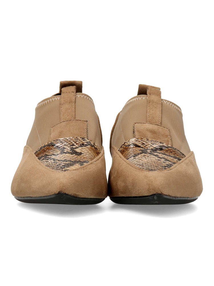 Zapato mocasín de mujer, con punta fina y detalle estampado serpiente. Fabricado en sintético antelina y textil elástico. Suela de goma. Tacón bajo de 2,5 cm. Plantilla acolchada. Diseño original y versátil para combinar con todos tus looks.