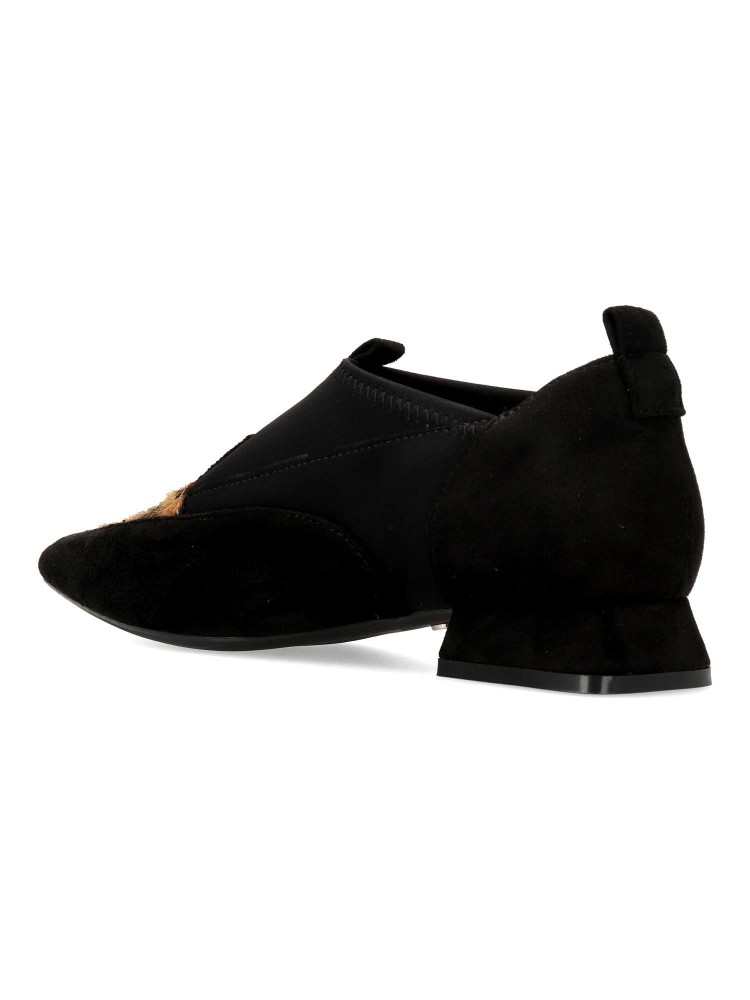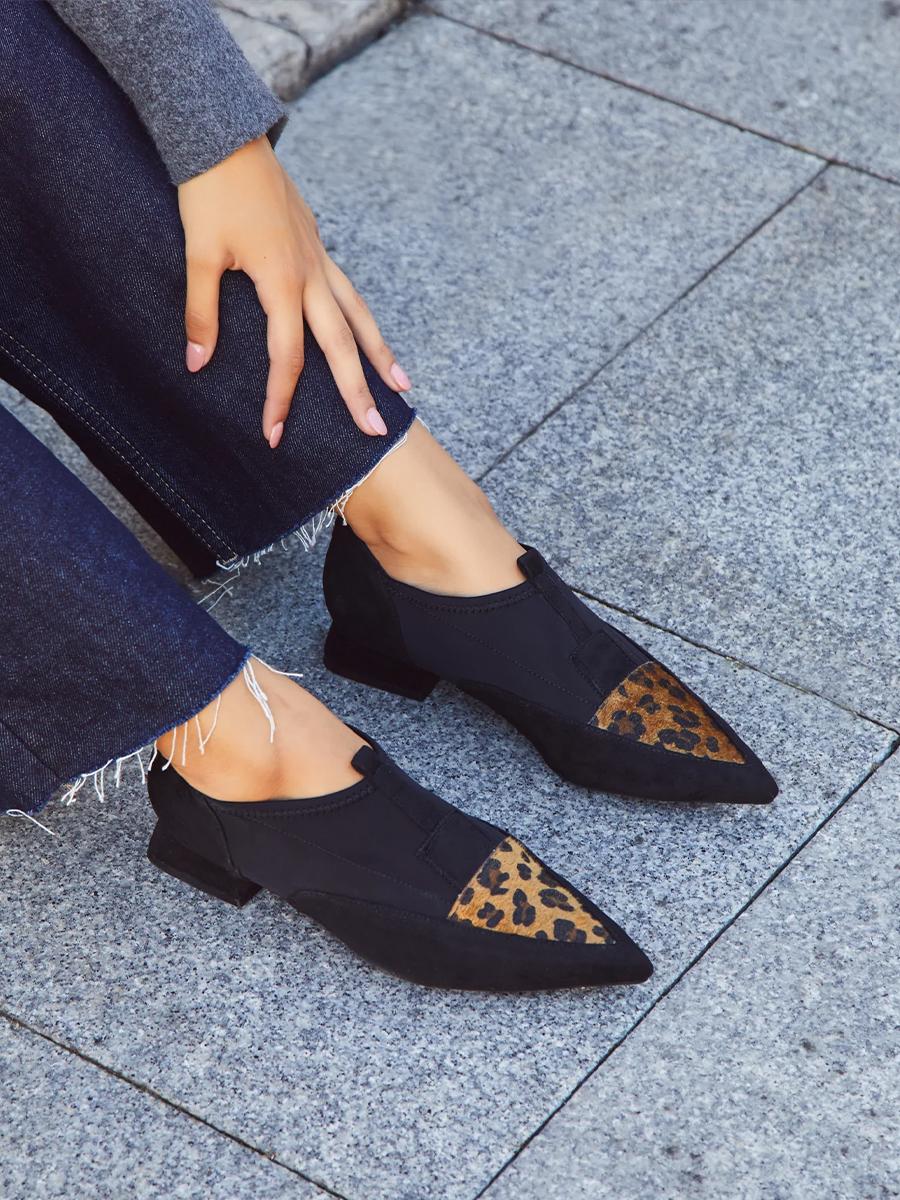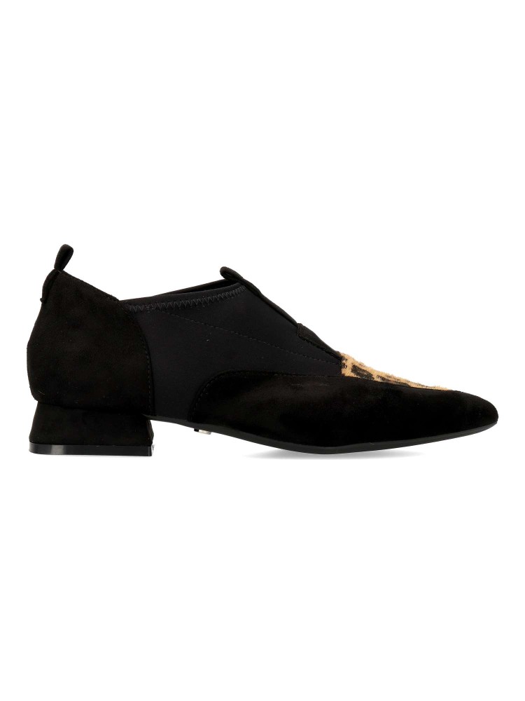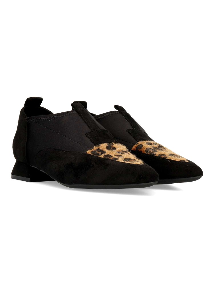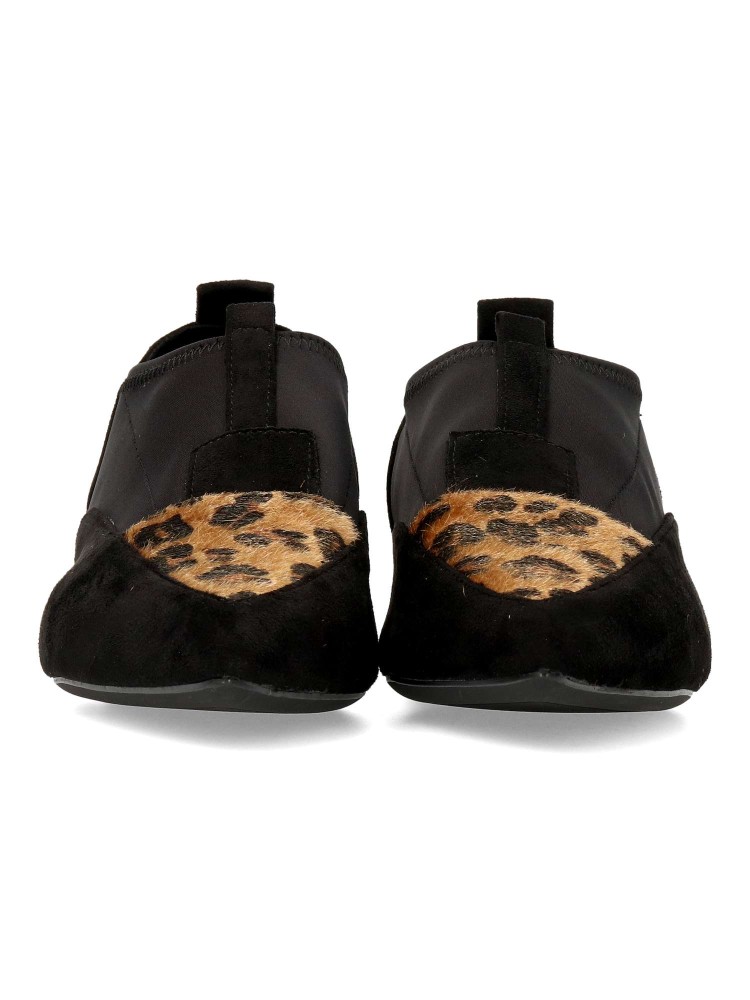 Zapato mocasín de mujer, con punta fina y detalle estampado leopardo. Fabricado en sintético antelina y textil elástico. Suela de goma. Tacón bajo de 2,5 cm. Plantilla acolchada. Diseño original y versátil para combinar con todos tus looks.