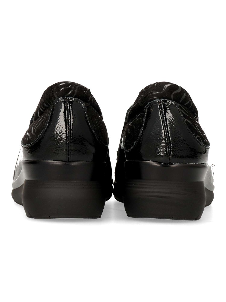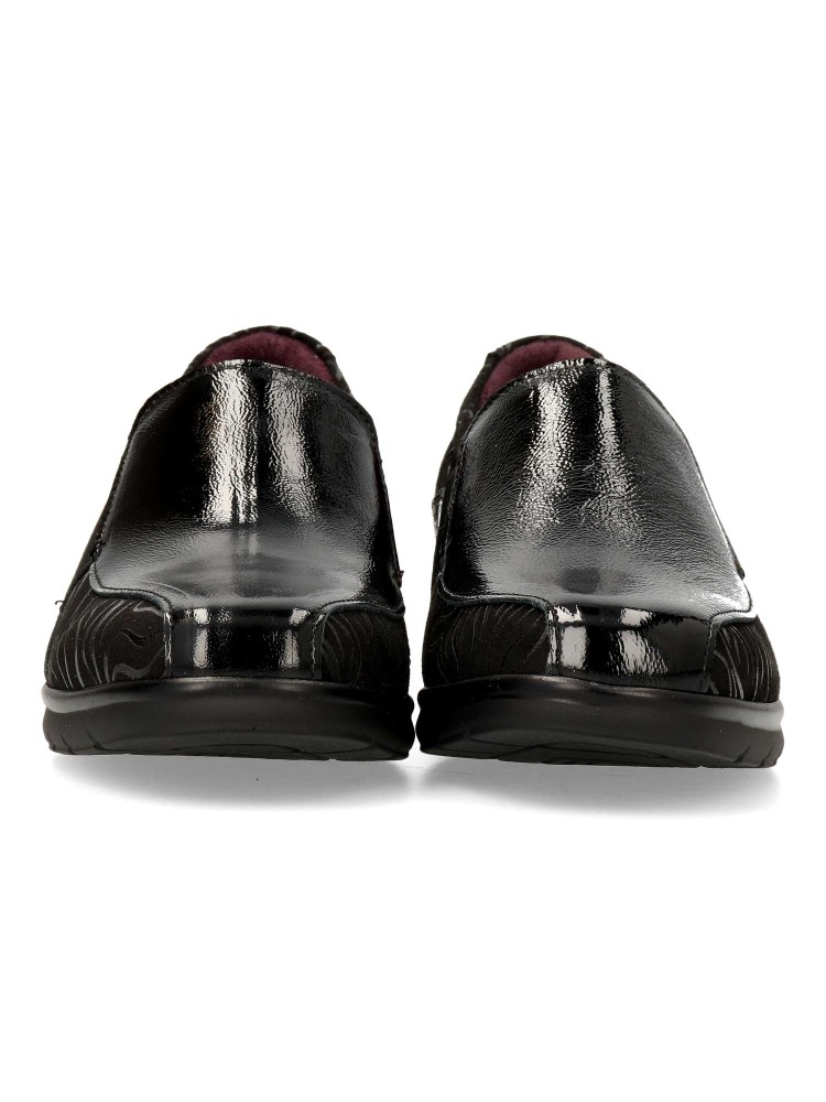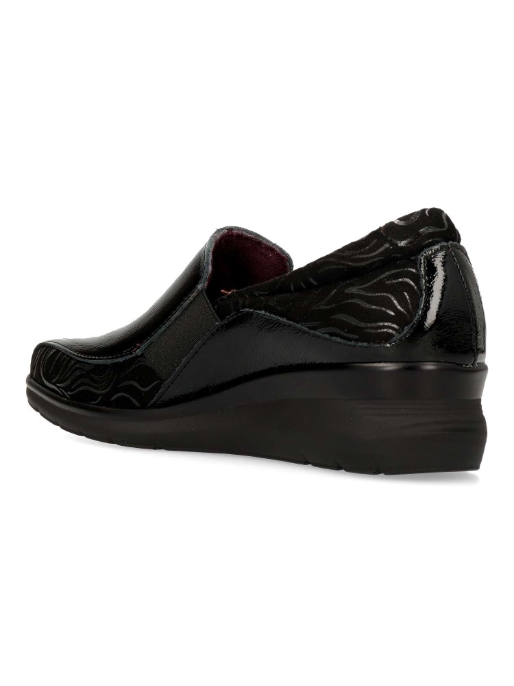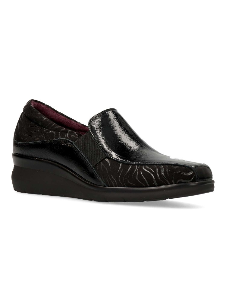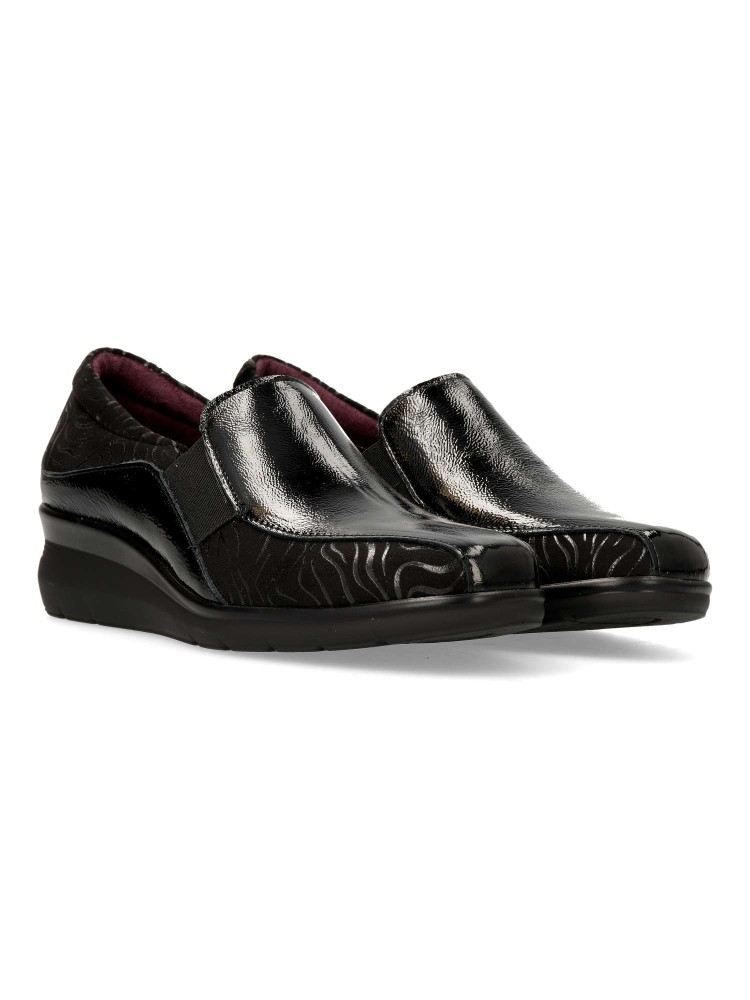 Zapato mocasín de mujer, con elásticos en los laterales. Fabricado en piel y textil, con suela de goma ligera y flexible. Plantilla acolchada y extraíble. Color negro. Pequeña cuña de 4 cm. Combinan diseño, calidad, confort y bienestar. Hecho en España.