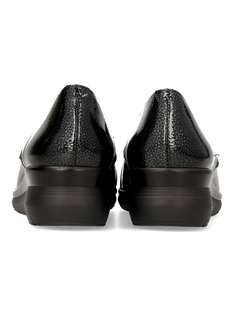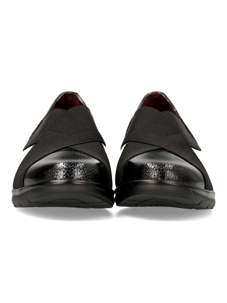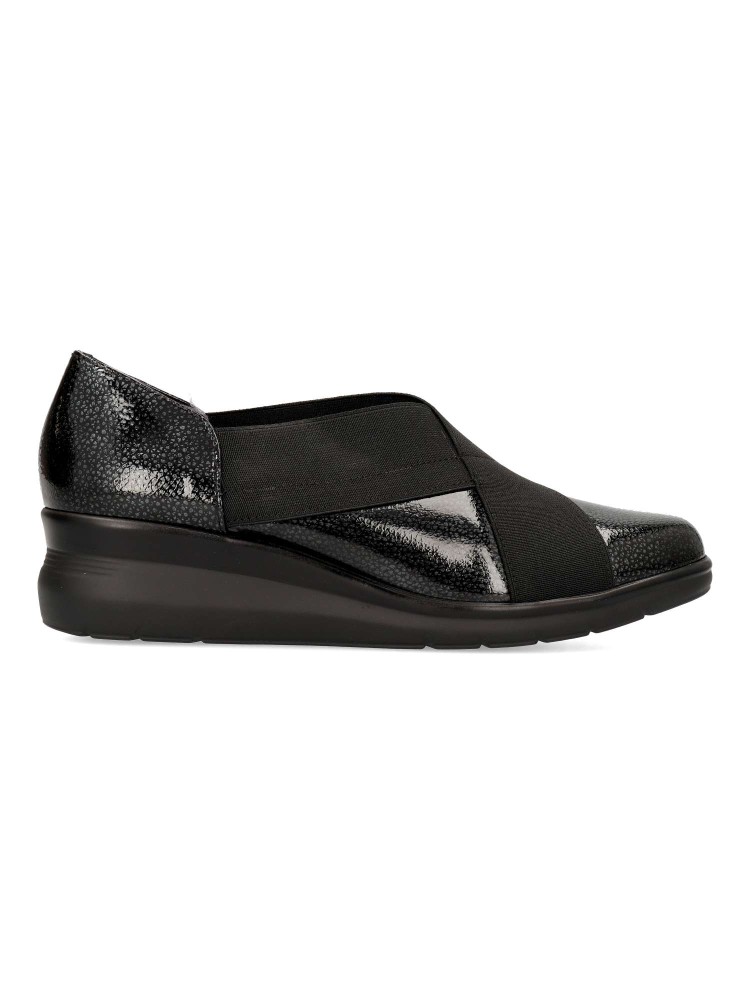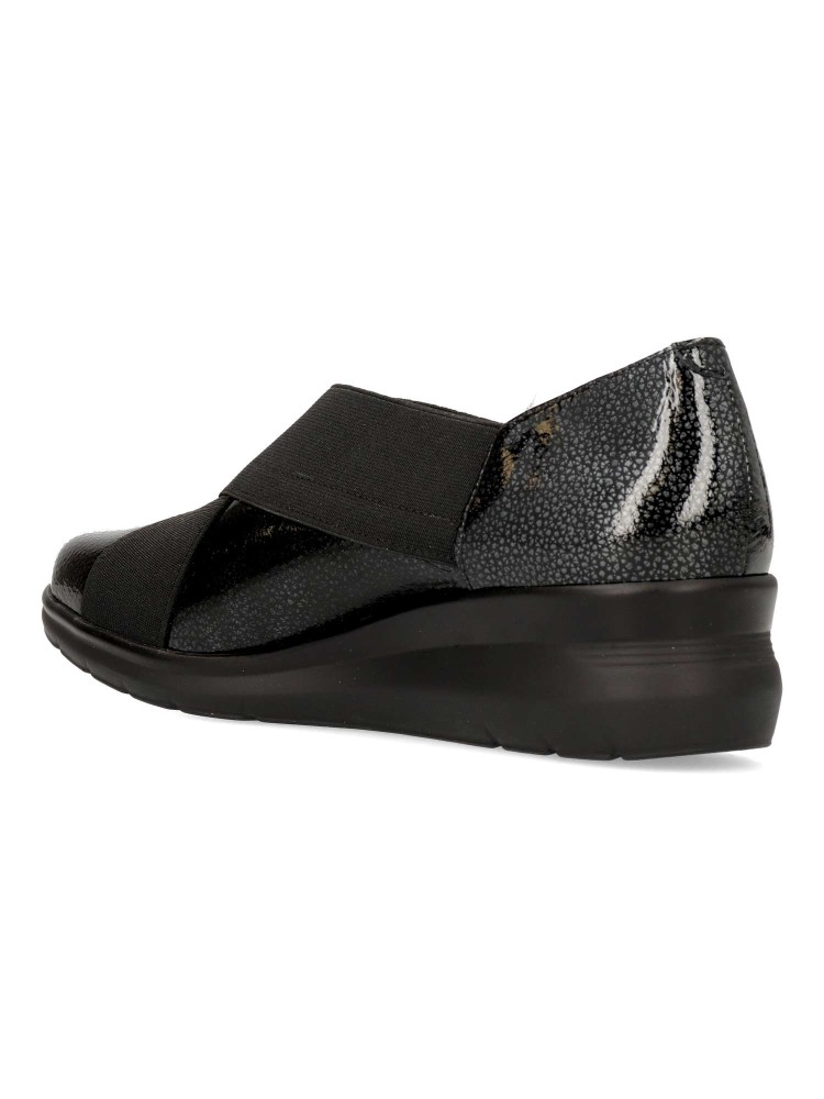 Zapato mocasín de mujer, con tiras elásticas cruzadas. Fabricado en piel y textil, con suela de goma ligera y flexible. Plantilla acolchada y extraíble. Color negro. Pequeña cuña de 4 cm. Combinan diseño, calidad, confort y bienestar. Hecho en España.