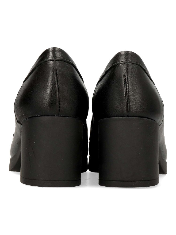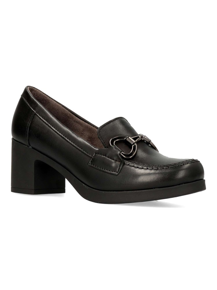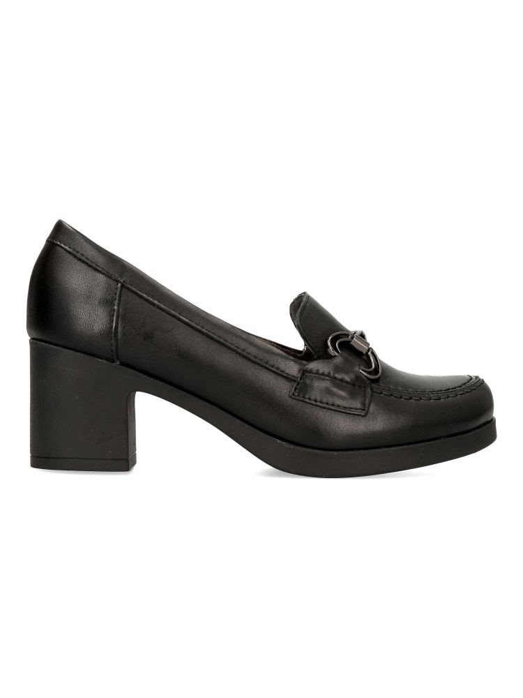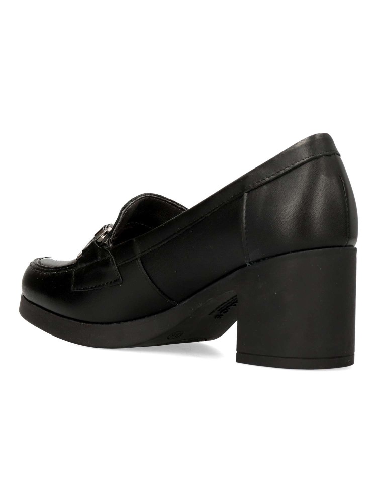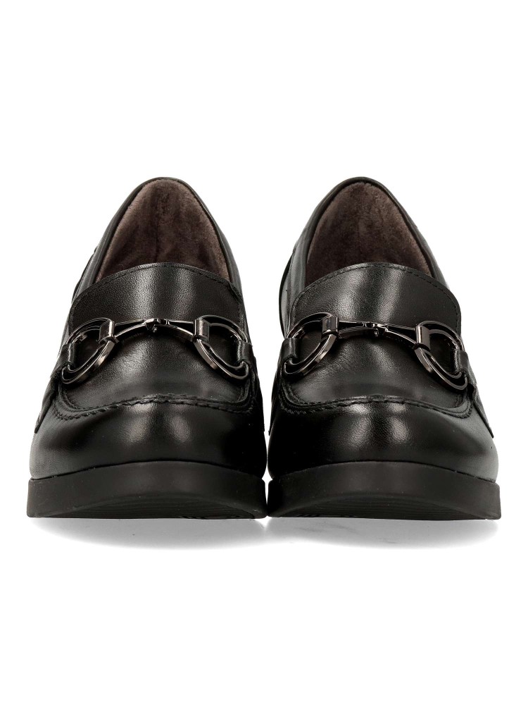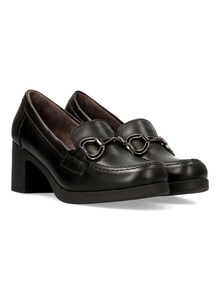 Zapato mocasín cómodo de mujer. Fabricado en piel, con suela de goma flexible. Color negro. Tacón ancho de 6 cm. Detalle cadena decorativa. Una elección elegante que combina comodidad y estilo en un diseño sofisticado.