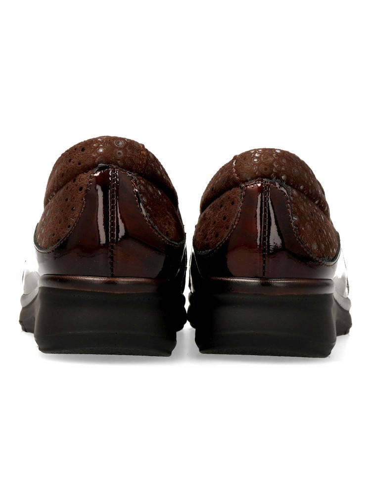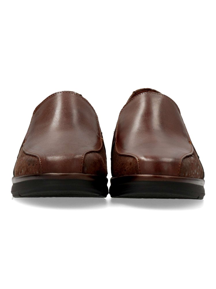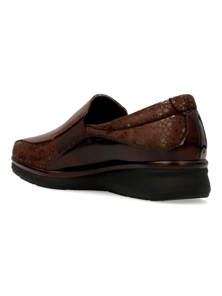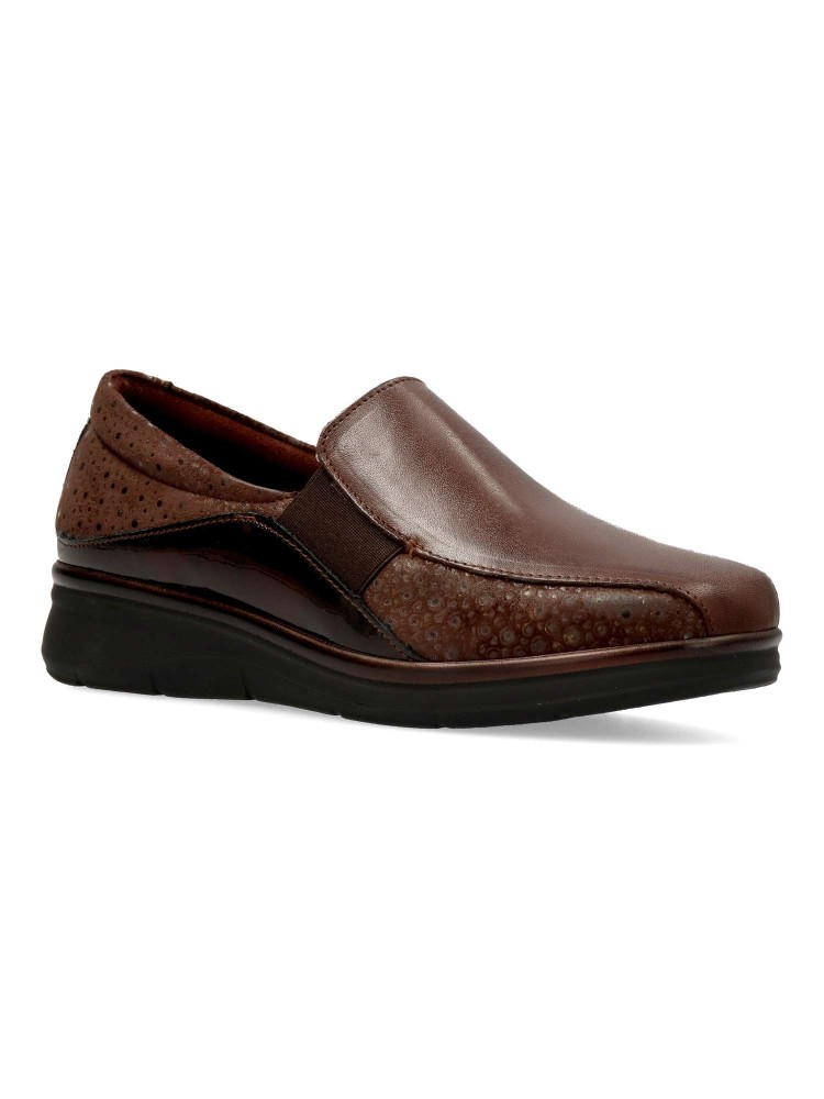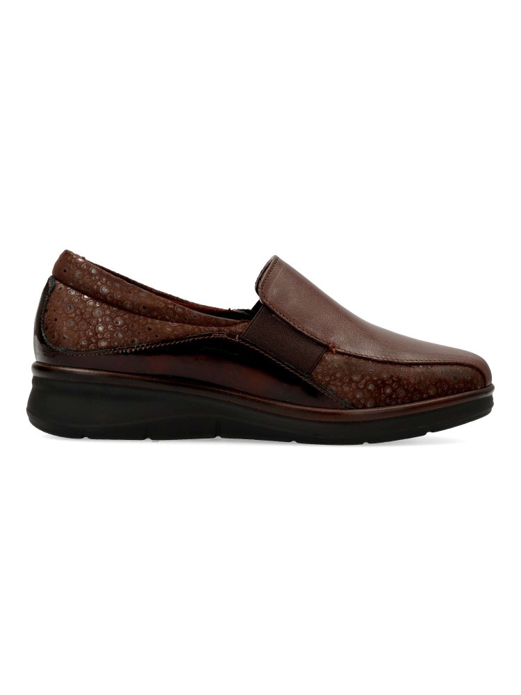 Zapato mocasín de mujer, con elásticos en los laterales. Diseño atemporal, fabricado en piel y textil diferentes texturas. Suela de goma ligera y flexible. Color marrón. Combinan diseño, calidad, confort y bienestar. Hecho en España.