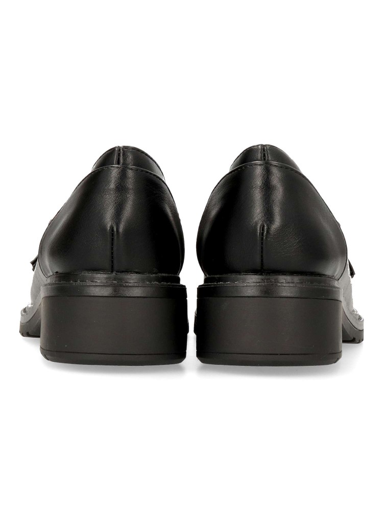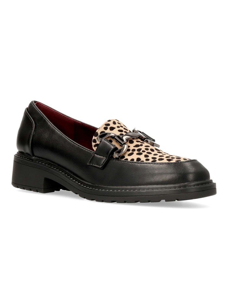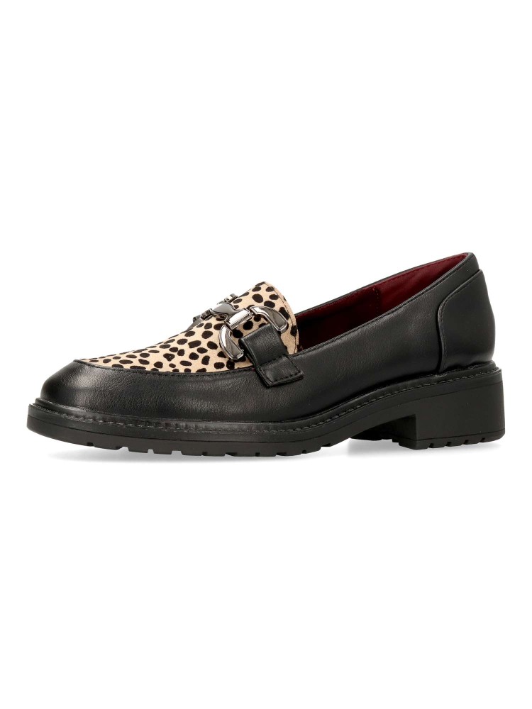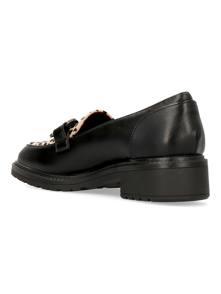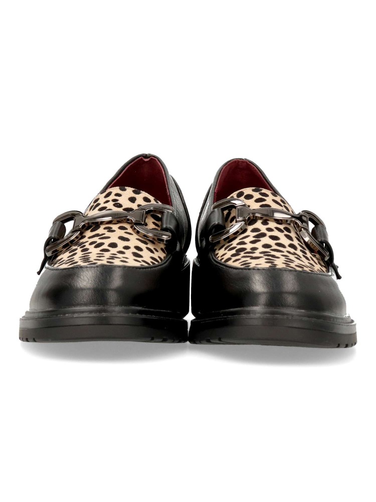 Zapato mocasín de mujer, con antifaz decorativo al empeine. Loafers confort, fabricado en piel sintética con detalle estampado leopardo. Plantilla acolchada. Color negro. Un mocasín con diseño clásico, cómodo y elegante fácil de combinar.
