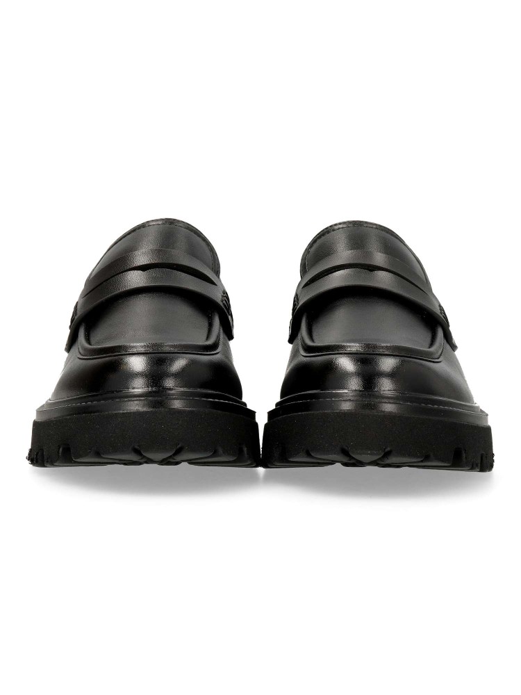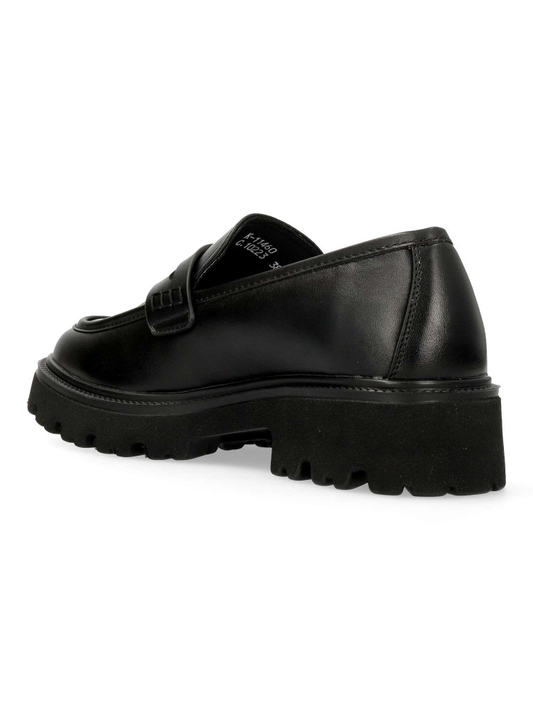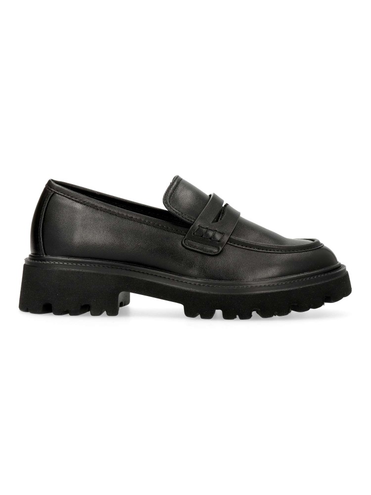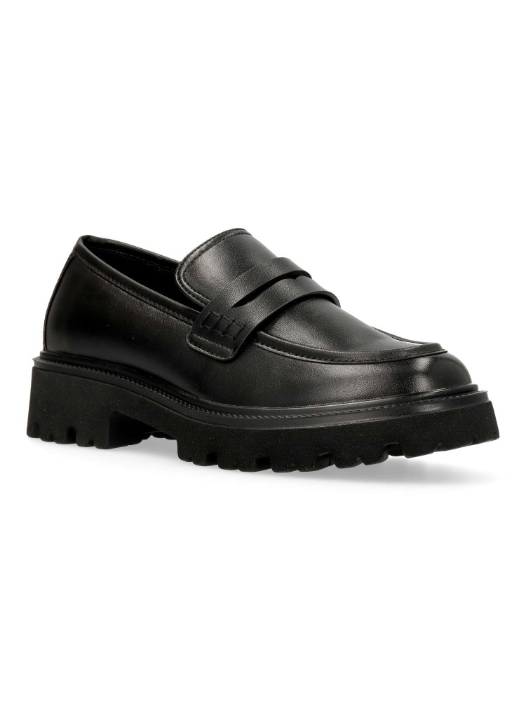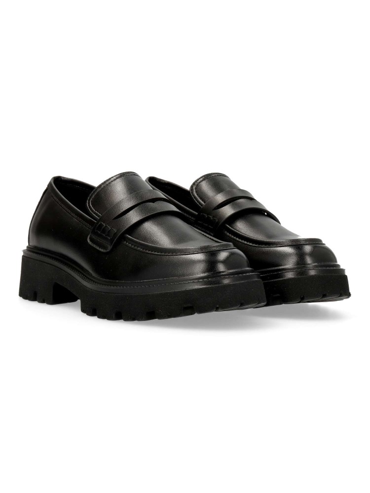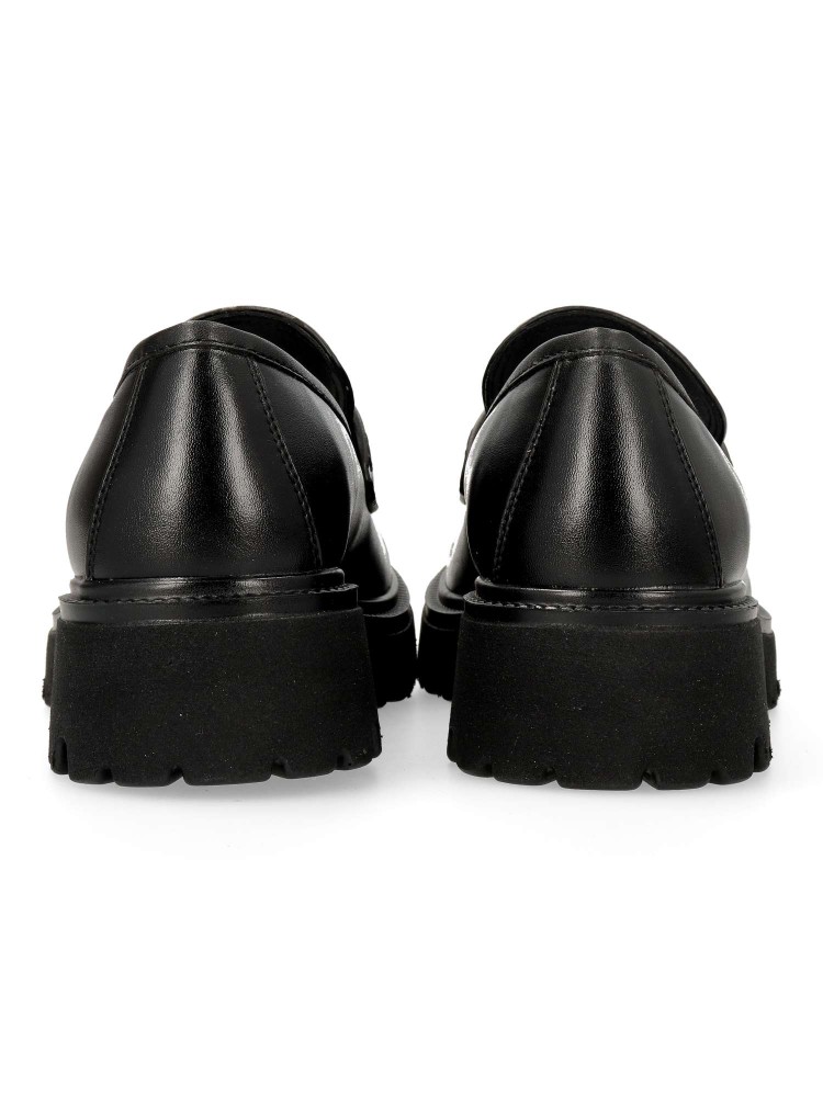 Zapato mocasín de mujer, con detalle de antifaz. Loafers fabricado en piel sintética suave color negro, con suela de goma EVA ligera y flexible. Plantilla acolchada. Altura 4 cm. Diseño clásico y versátil, fácil de combinar con todos tus looks.
